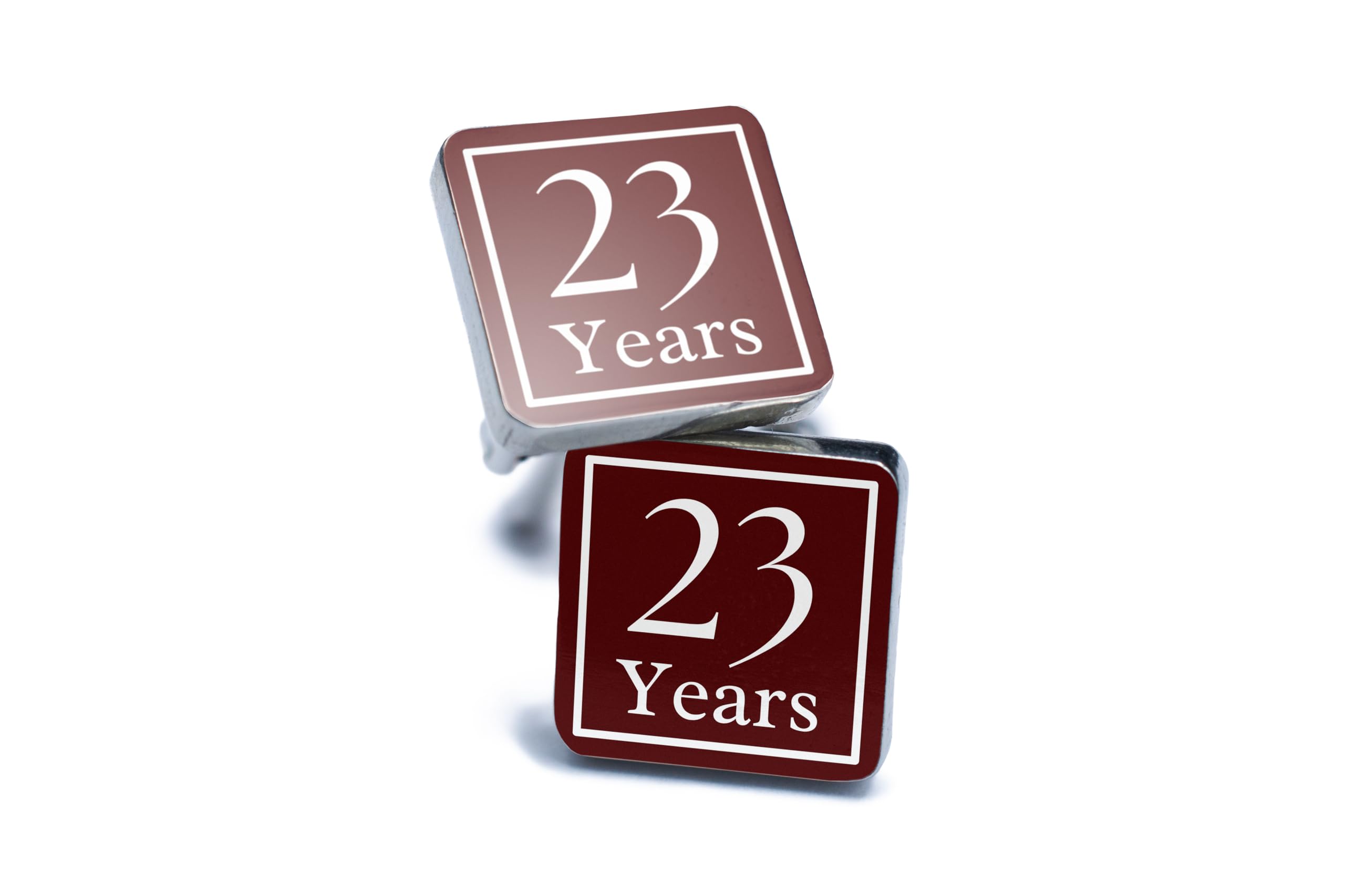 Celebrate 23 years of accomplishments with the "23 Years Anniversary Cufflinks." These cufflinks are more than just a fashion accessory?they are a meaningful keepsake symbolizing over two decades of hard work, commitment, and success. Featuring a deep maroon enamel background with bold white text and a refined border, these cufflinks exude sophistication and class. Crafted with high-quality materials, they are designed for durability, ensuring they remain a cherished memento for years to come. Whether you're honoring a career milestone, celebrating a personal achievement, or gifting a loved one, these cufflinks are an excellent choice. Packaged in a sleek gift box, they are ready to present for any special occasion. Elevate your formal attire with this elegant accessory that represents 23 remarkable years of dedication.