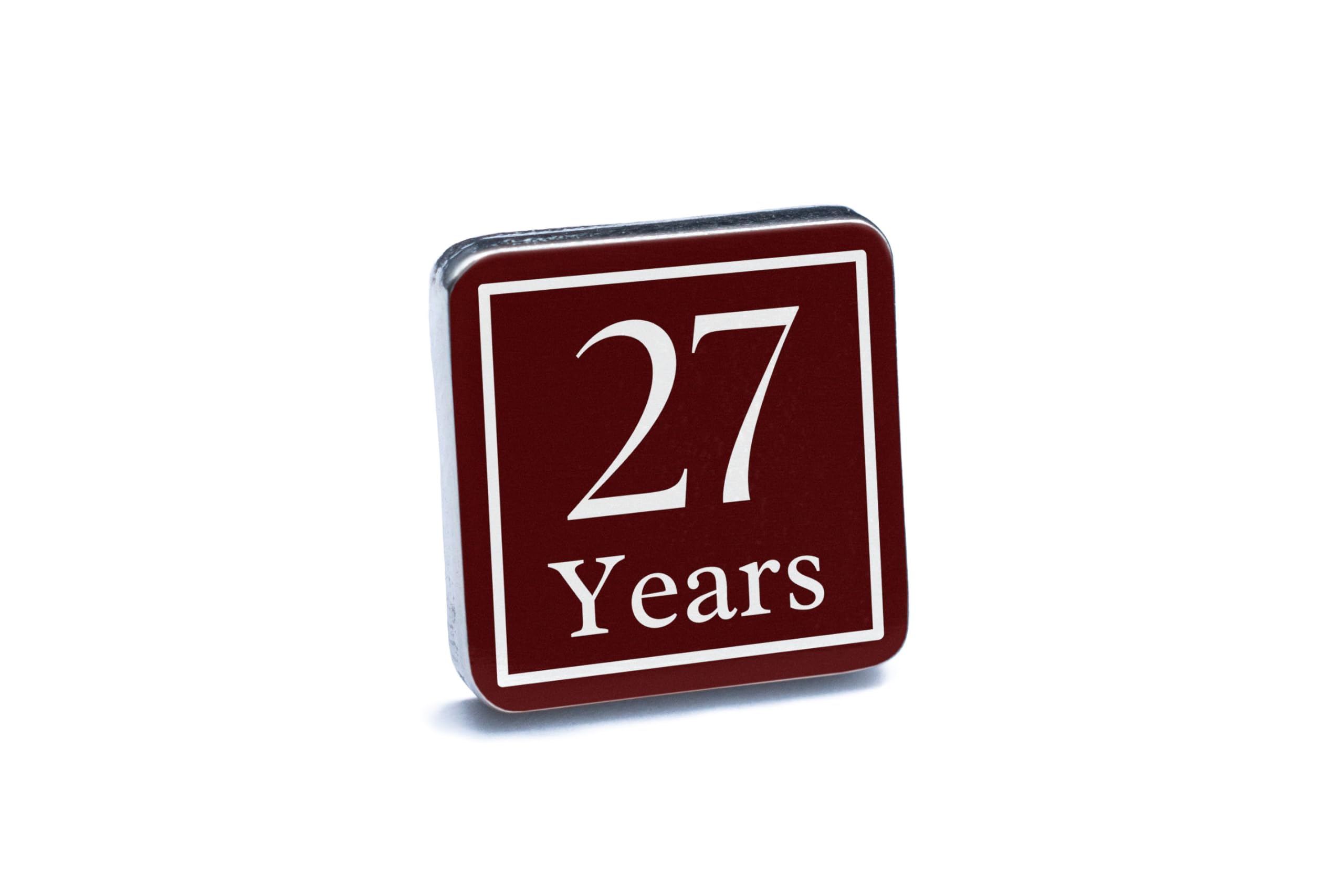Mark 27 years of achievements and milestones with these exquisitely designed "27 Years Anniversary Cufflinks." Their sophisticated design showcases a maroon enamel background adorned with crisp white text and a delicate border, creating a timeless accessory suitable for any formal event. Crafted with meticulous attention to detail, these cufflinks are made from durable materials and feature a polished finish, making them a treasured keepsake. Whether you're celebrating a professional achievement, a personal milestone, or a special anniversary, these cufflinks add a touch of elegance to the occasion. Presented in a premium gift box, these cufflinks are ready to make a lasting impression. Celebrate this momentous 27-year journey in style and sophistication.