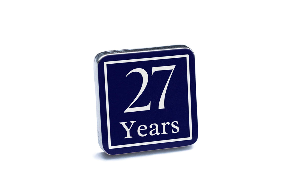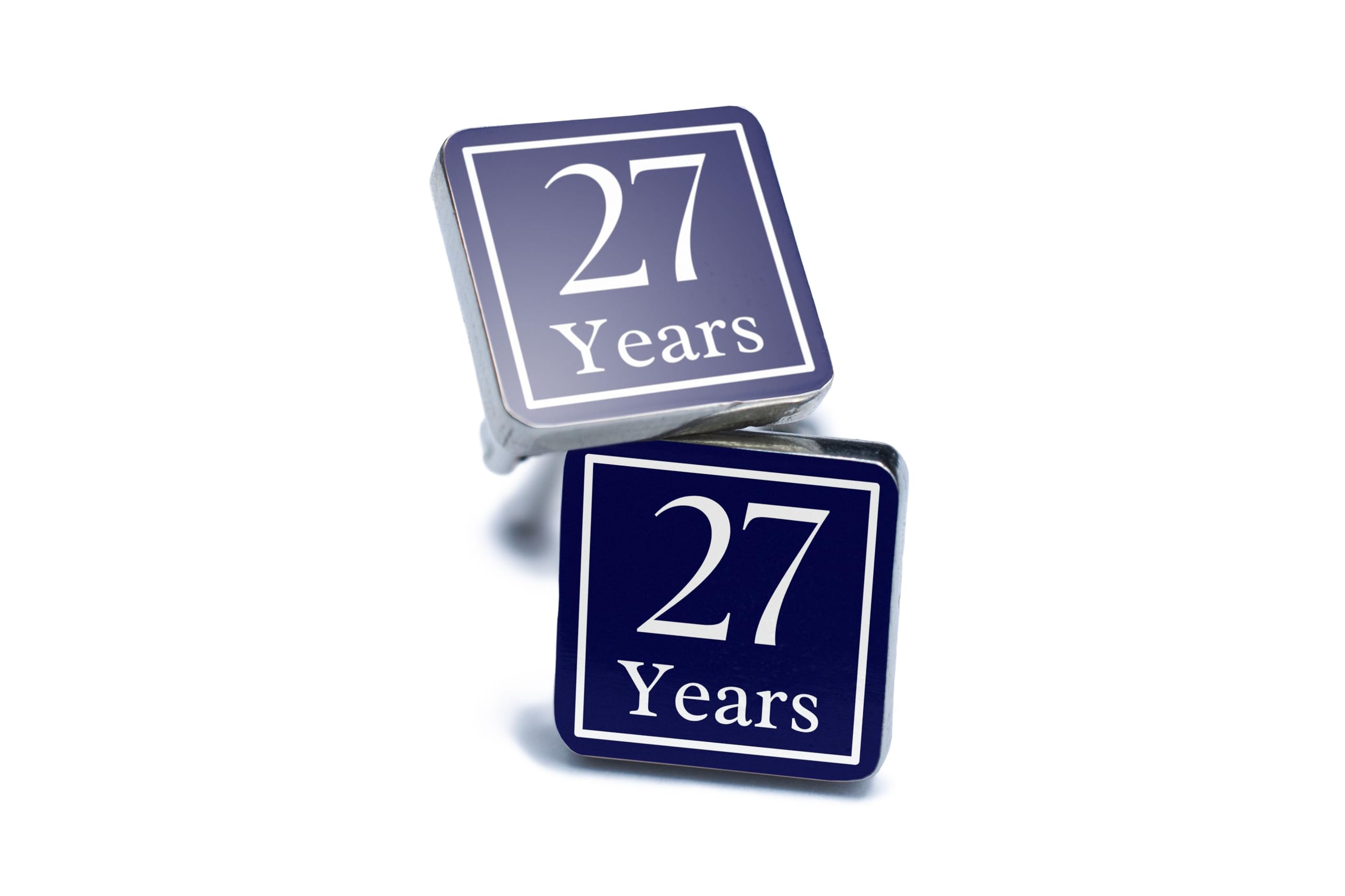 - Handcrafted tin cufflinks with UV printed '27 Years' design