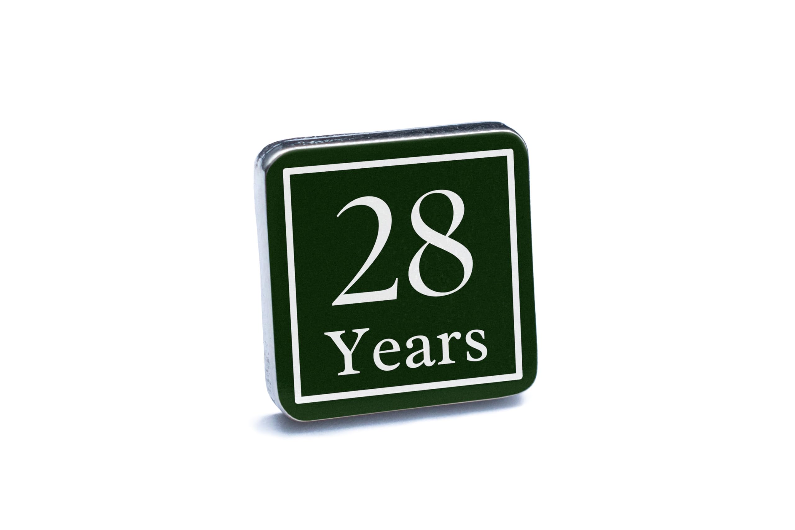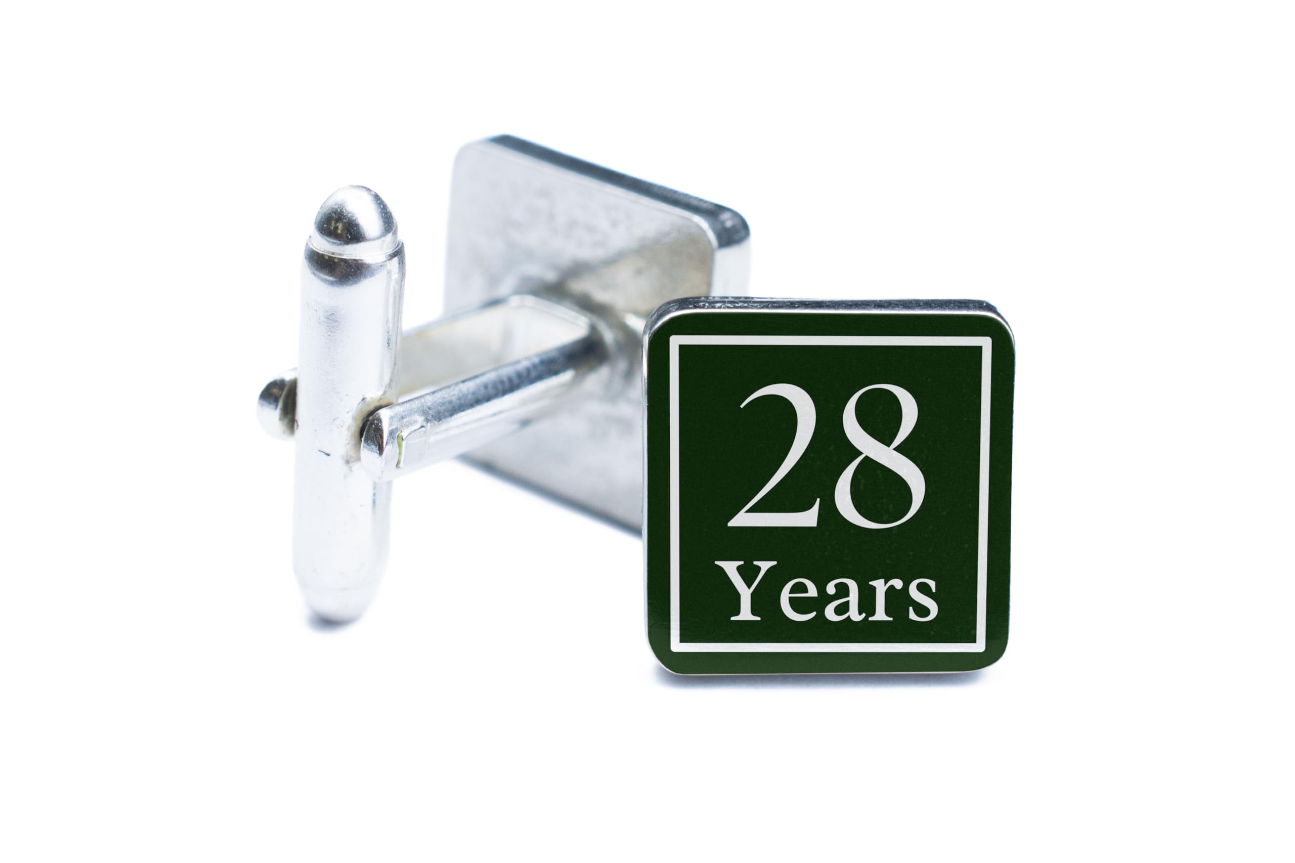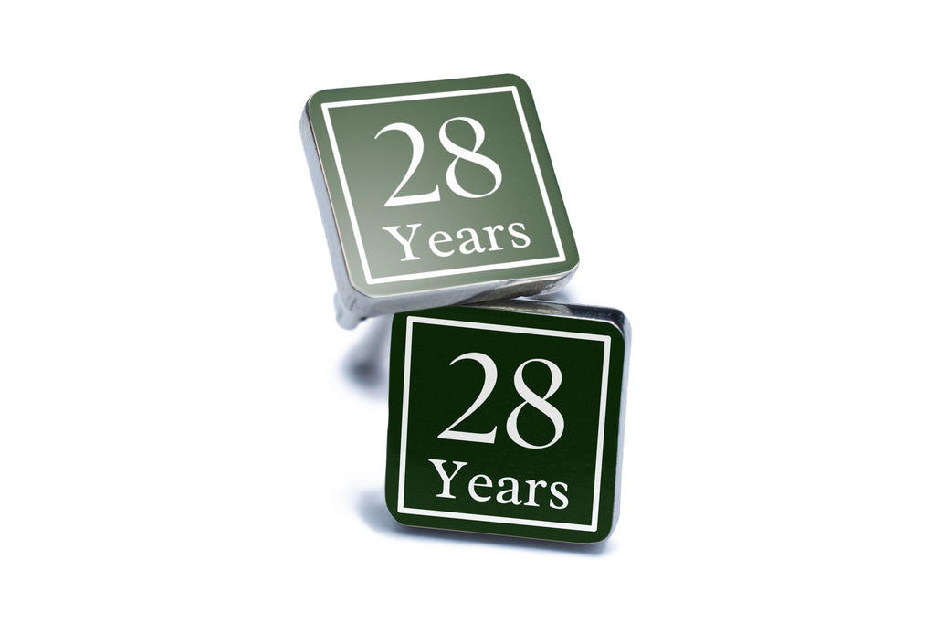 These handcrafted tin and pewter cufflinks are the perfect accessory to celebrate 28 years of marriage. The cufflinks feature a minimalist design in green and white, with '28 Years' printed in full colour using UV technology. These commemorative cufflinks are a unique keepsake that will add a touch of elegance to any man's outfit. Whether you're shopping for a gift for anniversaries or just looking to elevate your own style, these stylish cufflinks are sure to impress. Made with care and attention to detail, these cufflinks are a classic accessory that will never go out of style.