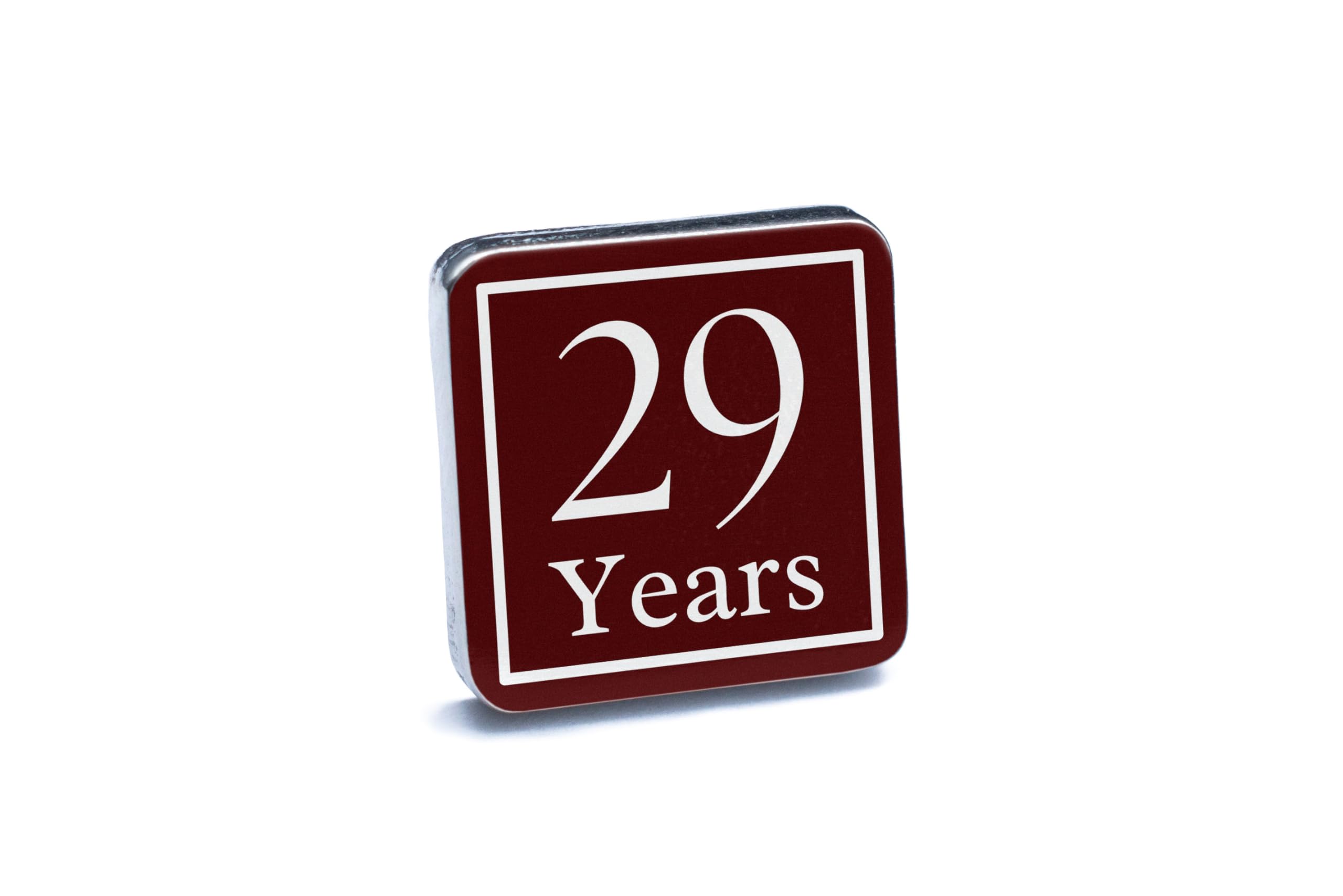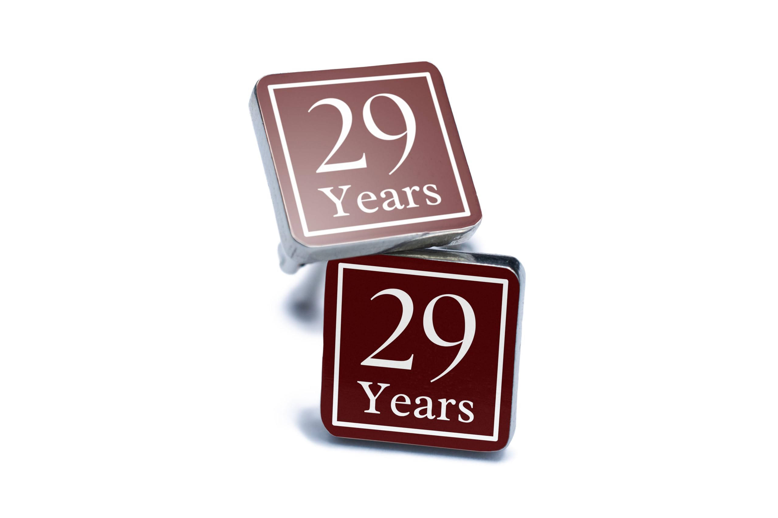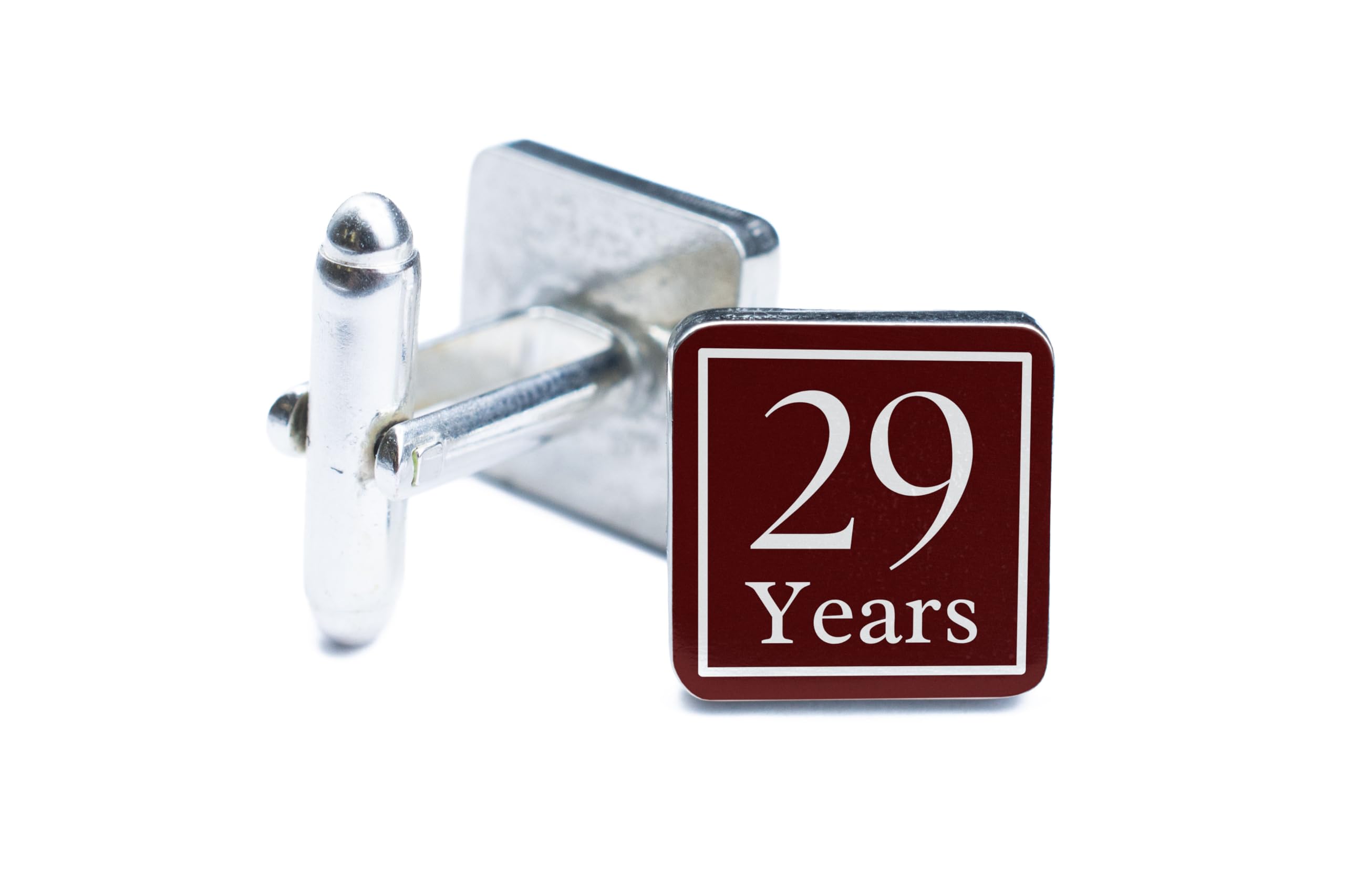 Celebrate 29 years of memories, achievements, and milestones with these "29 Years Anniversary Cufflinks." Designed with a sophisticated maroon enamel backdrop and crisp white text encased in a classic border, these cufflinks offer a timeless aesthetic perfect for marking this special occasion. Crafted with high-quality materials, these cufflinks are built to last, making them a thoughtful and elegant gift for anniversaries, professional milestones, or personal celebrations. Delivered in a beautiful gift box, they are ready to impress and delight. Whether for a formal dinner, a business event, or a heartfelt celebration, these cufflinks serve as a meaningful keepsake to honor 29 remarkable years. Add them to your collection or gift them to someone special to commemorate this significant milestone.