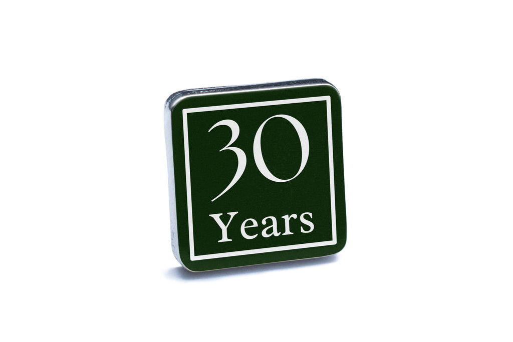 - UV printed design in green and white with '30 Years' inscription