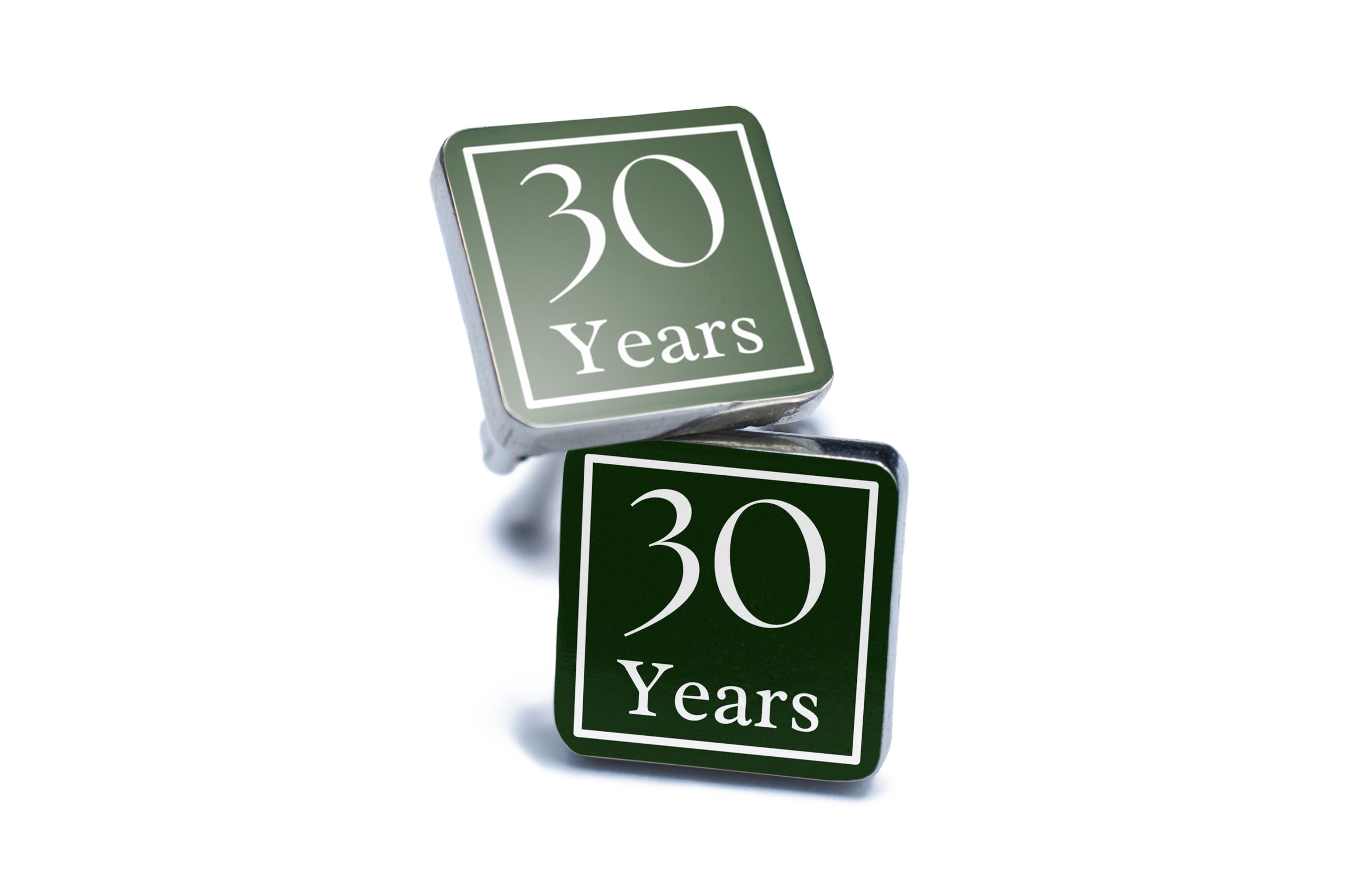 These commemorative anniversary cufflinks are a must-have accessory for any stylish man looking to celebrate a special milestone. Handmade and handcrafted from quality tin and pewter, these UV printed cufflinks feature a minimalist design in green and white, making them the perfect gift for anniversaries. The cufflinks are elegantly designed in a classic style, with the words '30 Years' printed in full colour to commemorate the occasion. These unique keepsakes are the ideal choice for those looking to add a touch of elegance to their outfit on their special day.