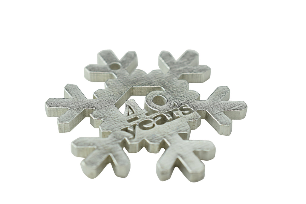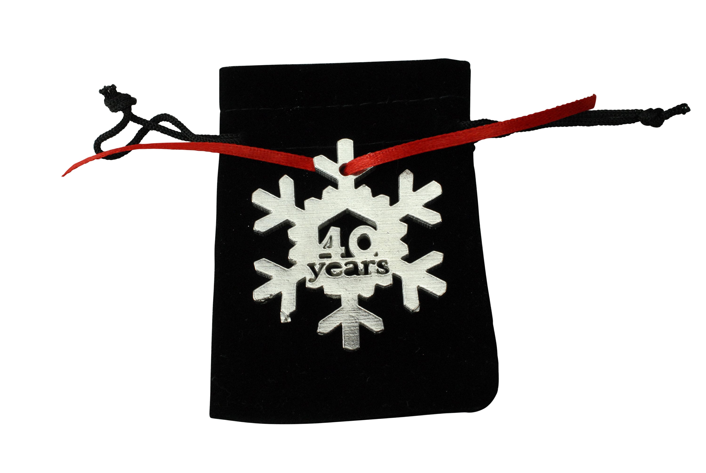 A lovely addition to your christmas tree this year is the 40 year anniversary christmas tree hanging decoration. This lovely piece is handcrafted in the UK and polished to a shine, it features the cut out snowflake design and the words 40 years cut out within the snowflake centre. If your 40th anniversary was this year or even near christmas this is a great way to mark your 40th christmas together. Comes in a little black velvet pouch with a red ribbon provided. Solid quality metal 48mm x 48mm