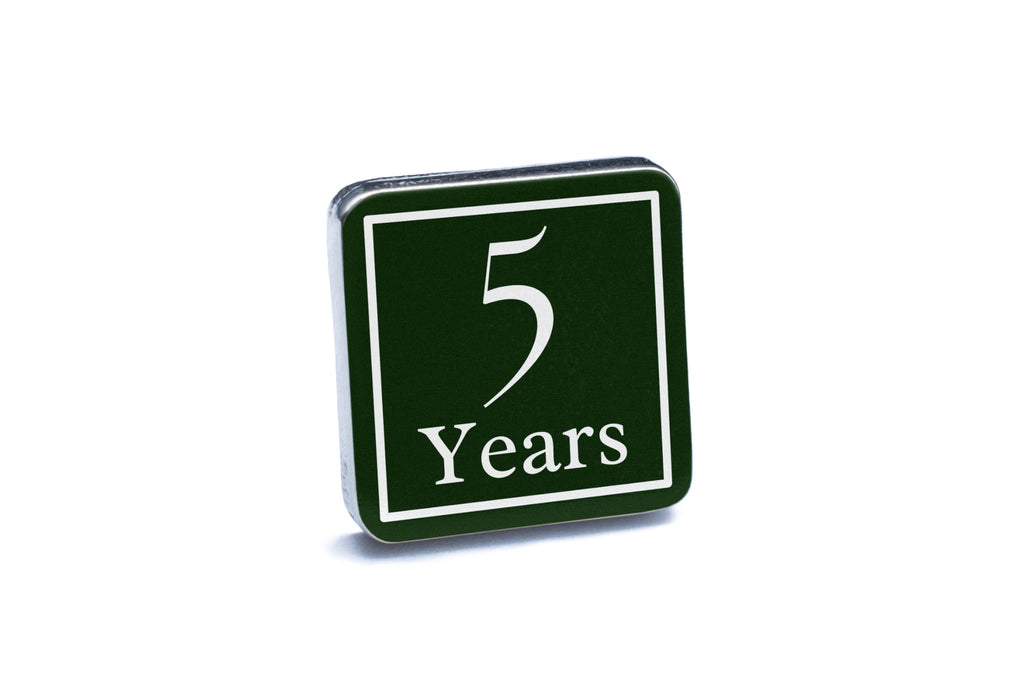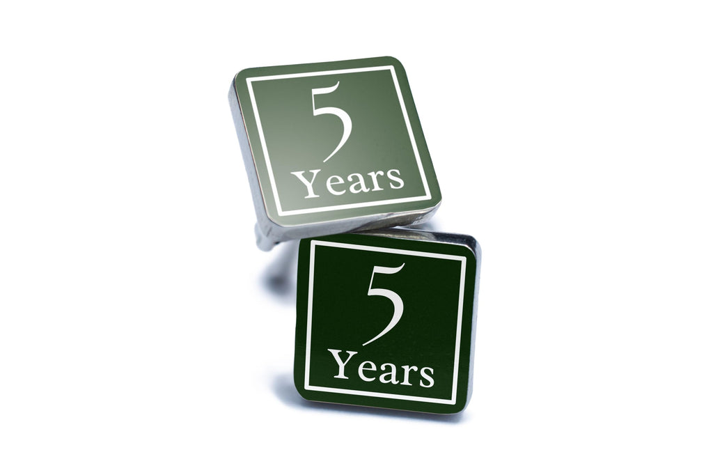 - UV printed green and white design featuring a simple and elegant '5 years' motif