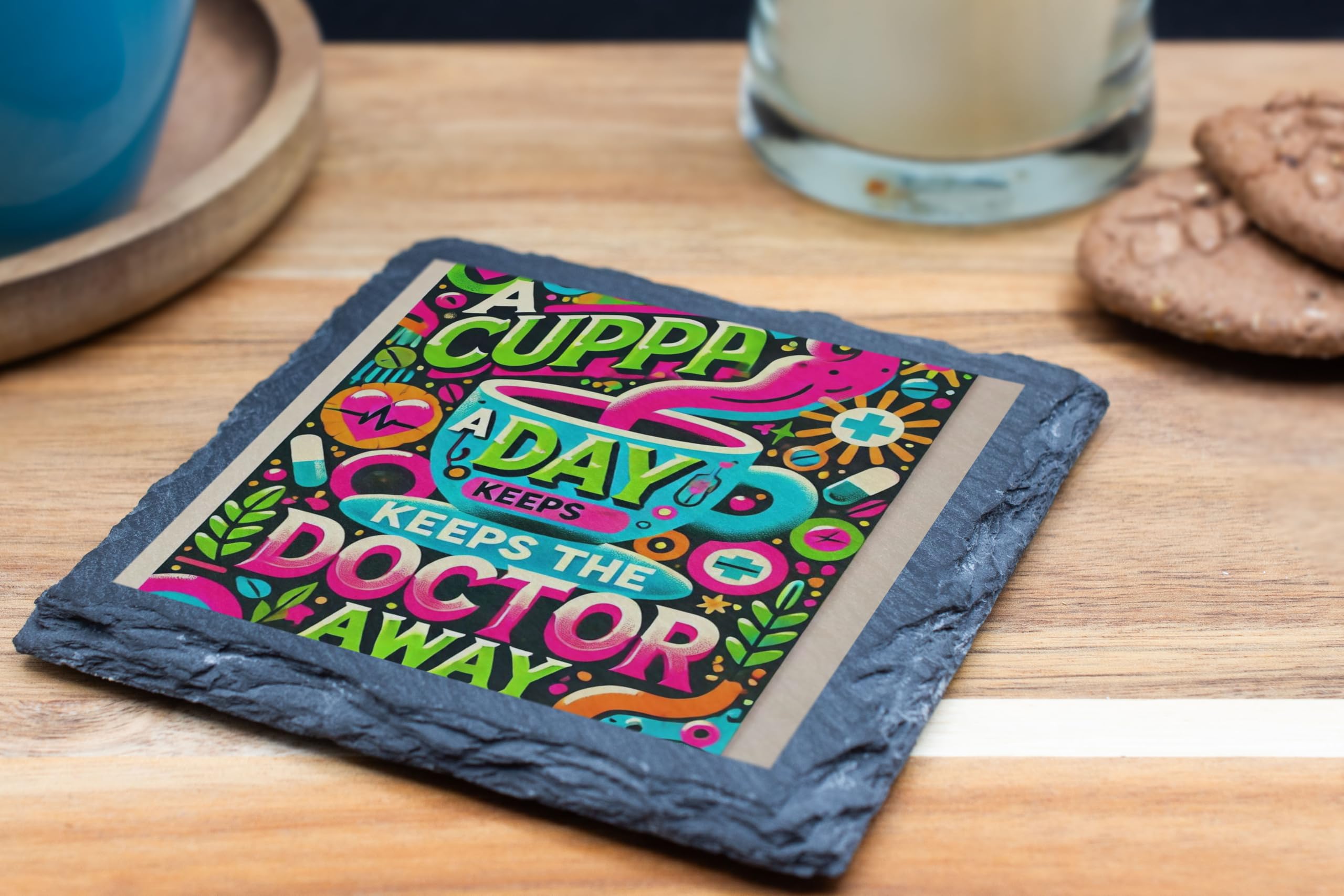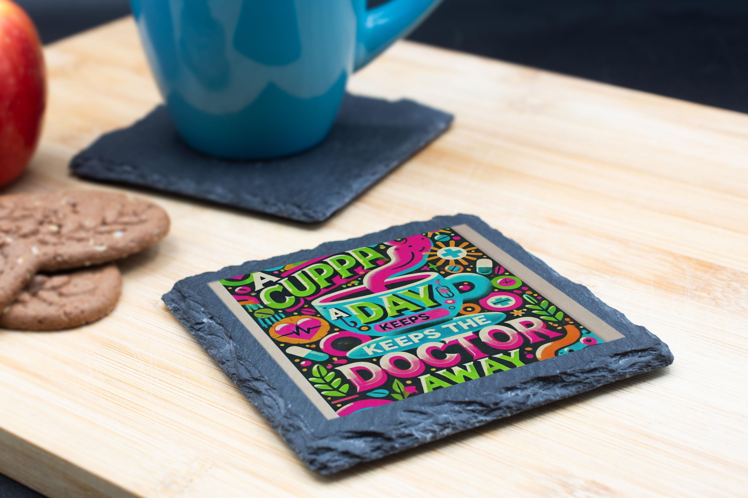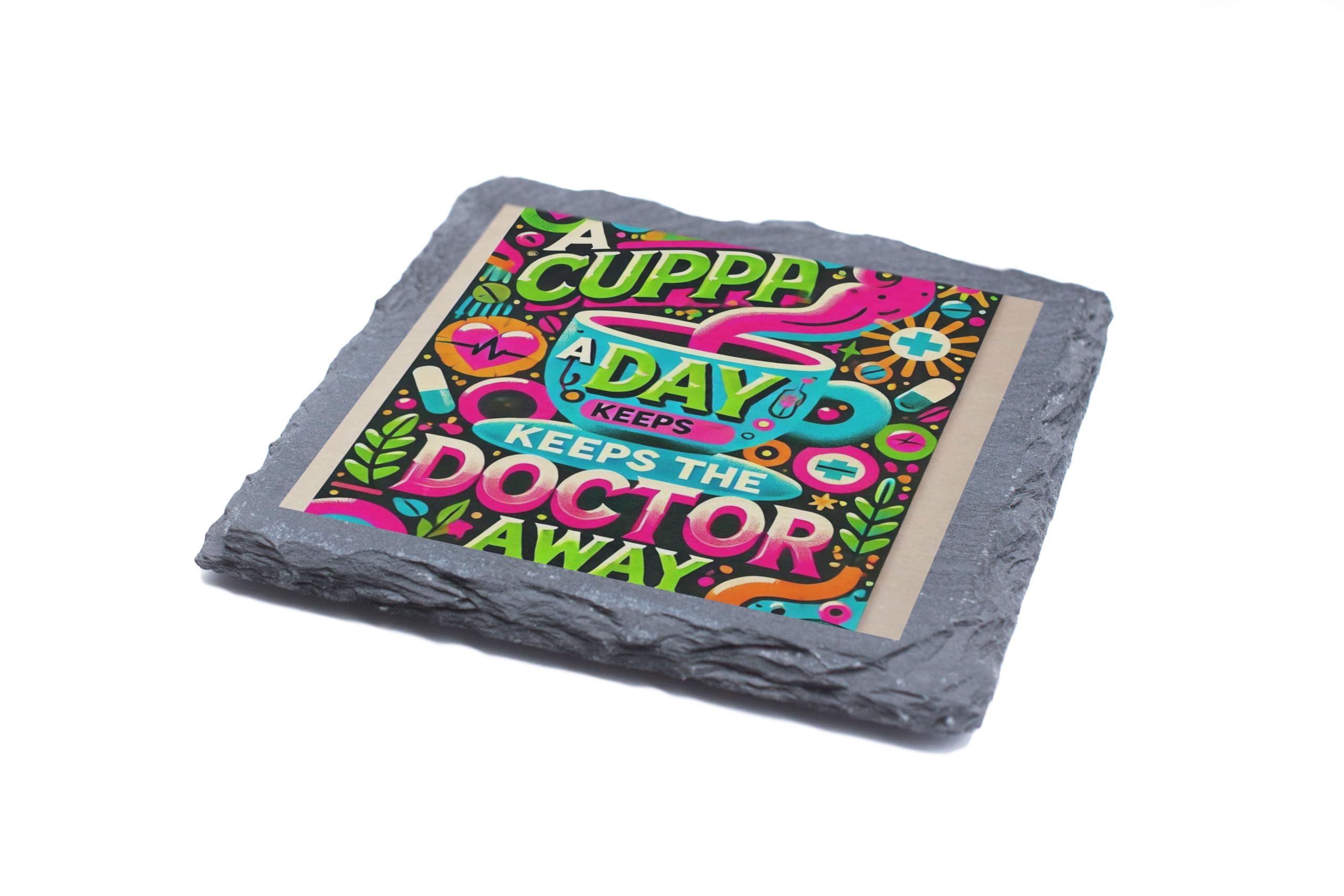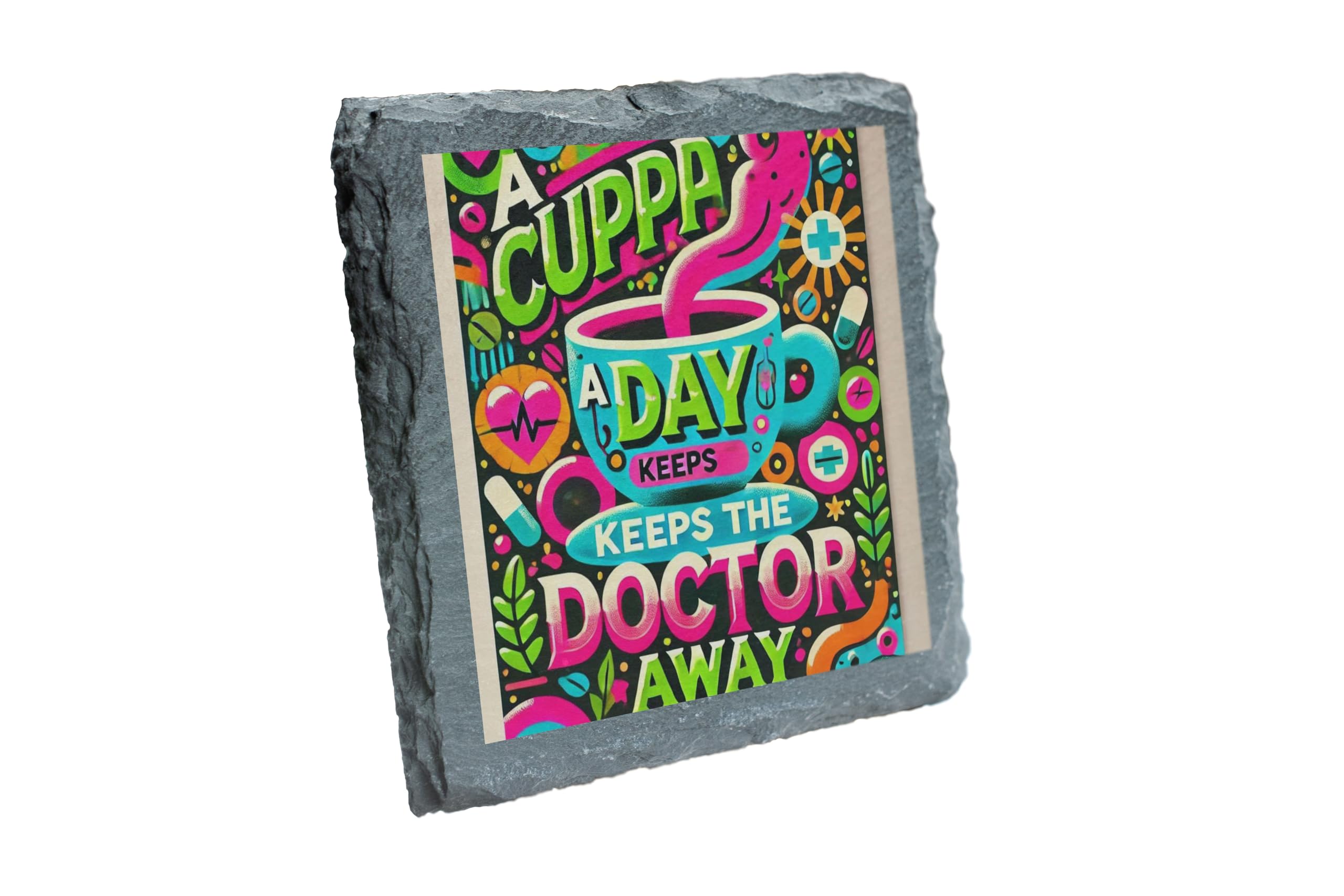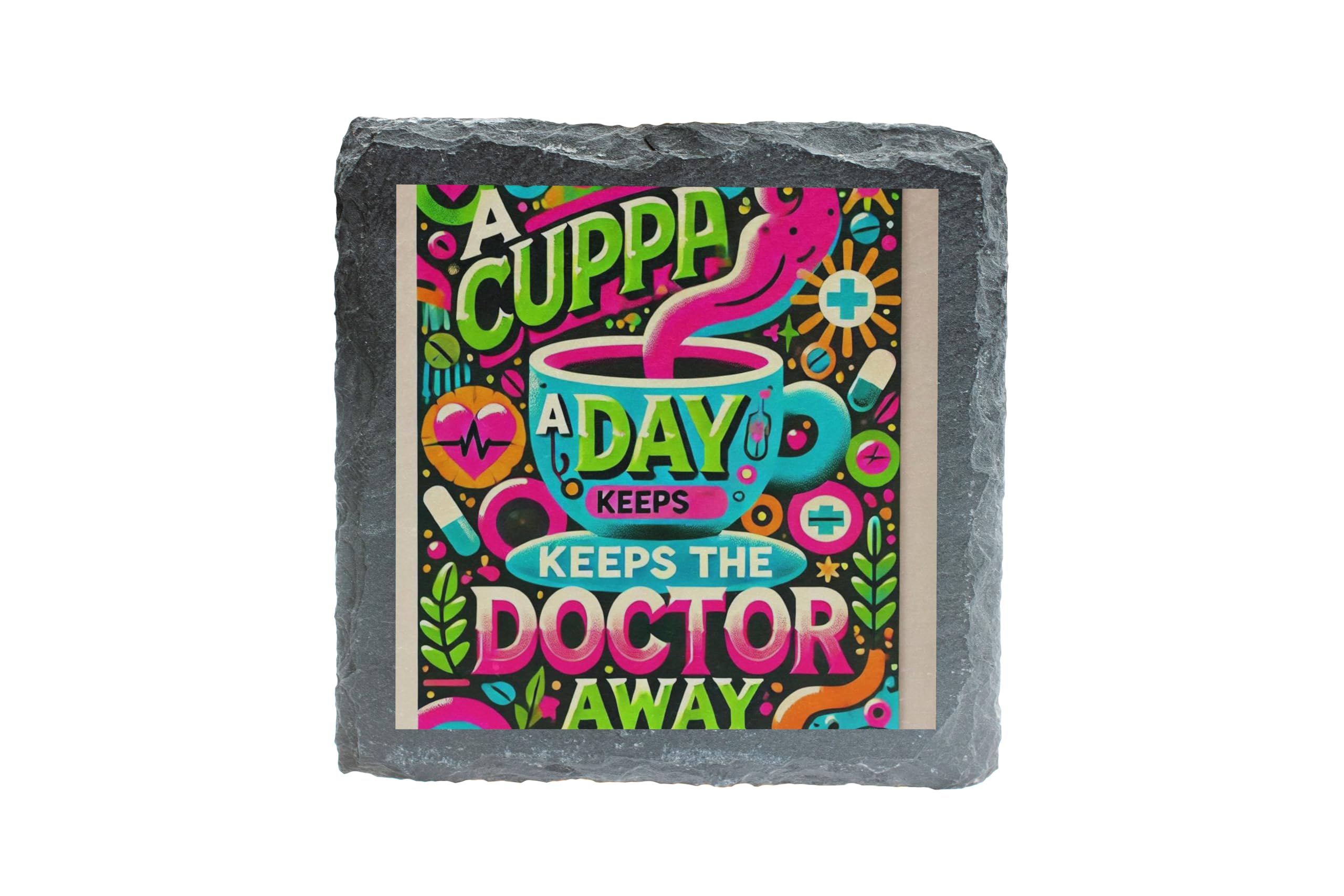 Bring a touch of humor and color to your space with this "A Cuppa a Day Keeps the Doctor Away" slate coaster. Featuring a vibrant and playful design, this coaster is perfect for tea lovers and anyone who appreciates a cheerful vibe. Crafted from premium slate with a protective cork backing, it ensures your furniture stays safe while adding a splash of personality to your decor. Whether as a gift or for personal use, this coaster is a delightful addition to any tea or coffee routine.