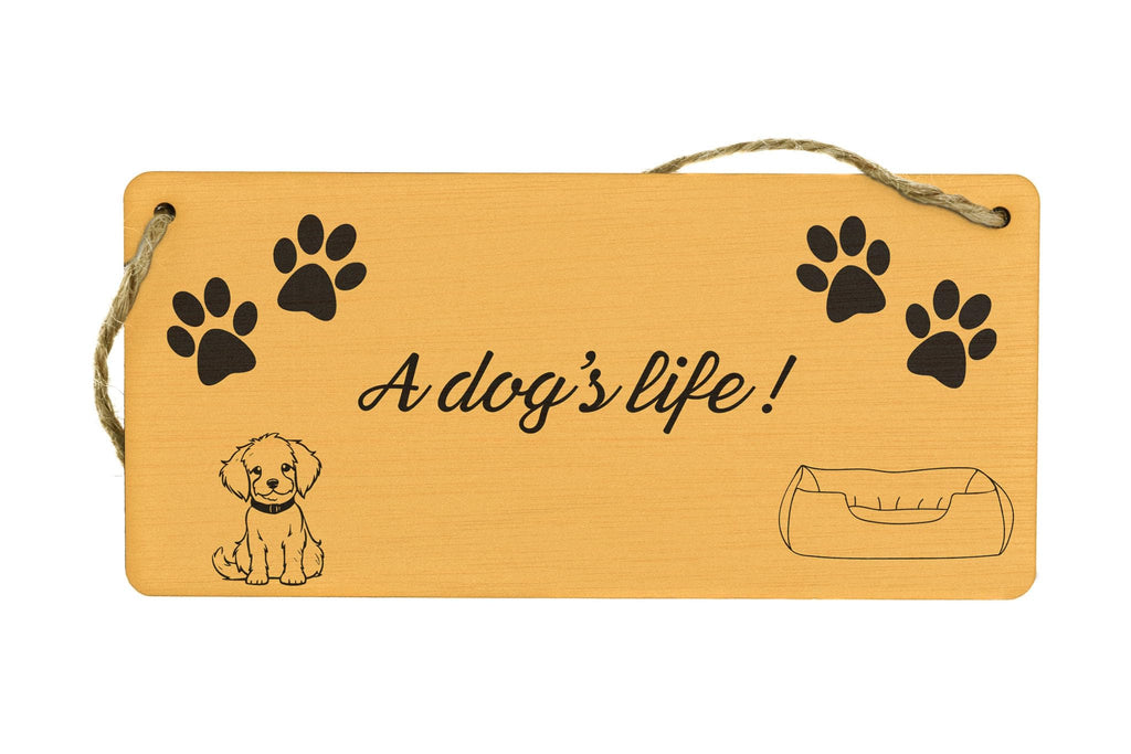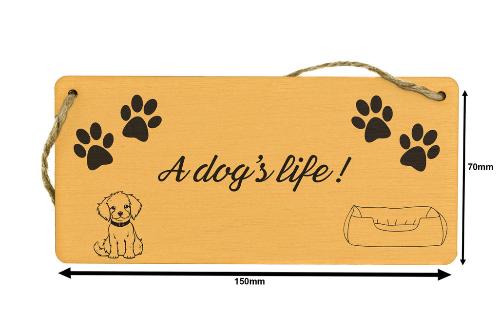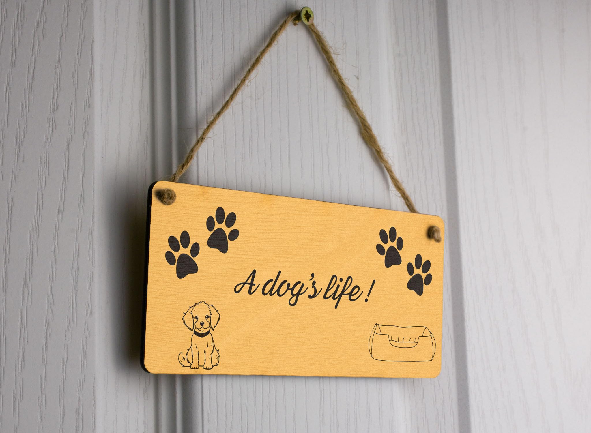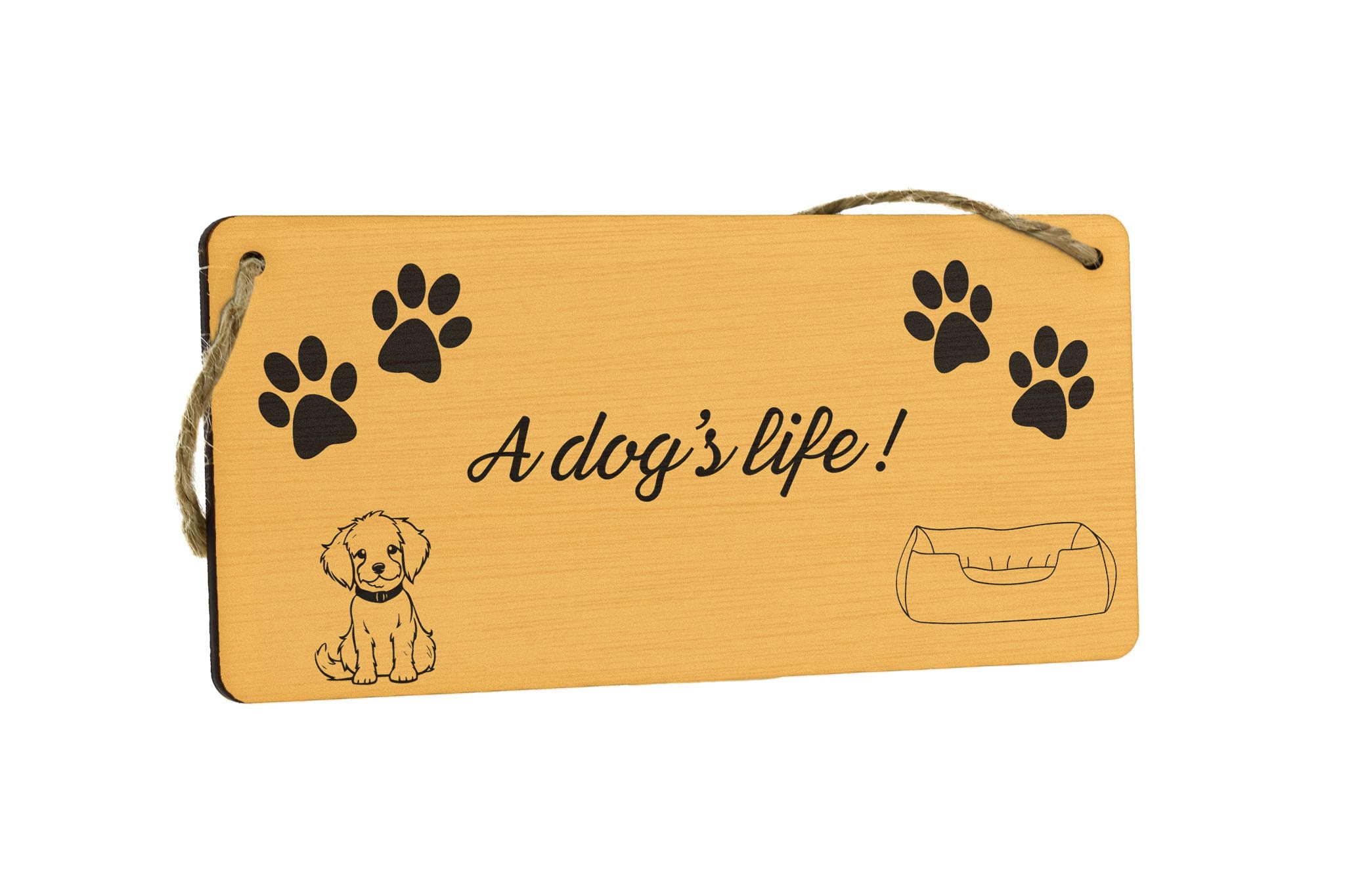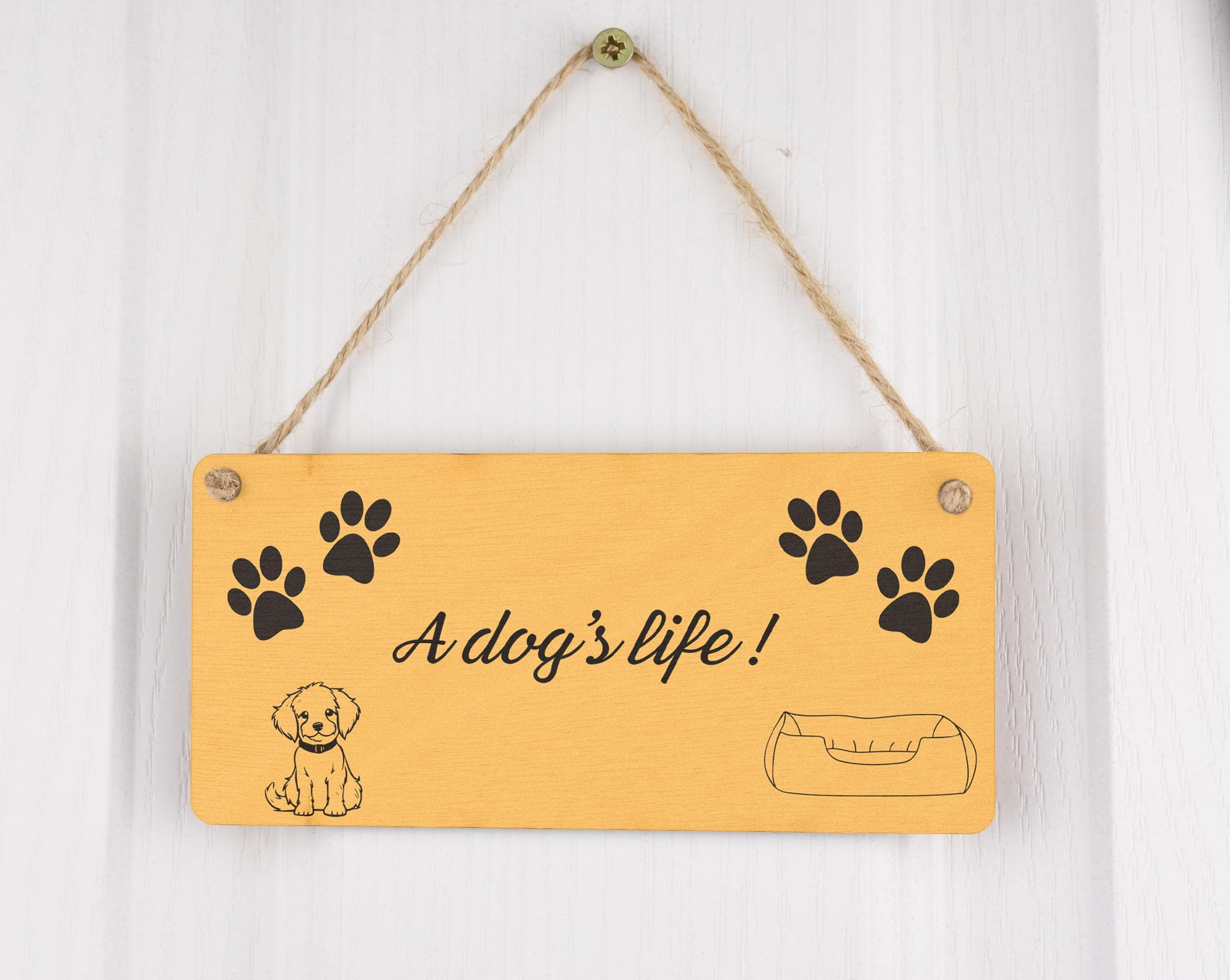 Add a touch of canine charm to your home decor with this delightful A Dogs Live - Plywood Hanging Sign! Crafted from quality plywood, this hanging sign features a full-colour design that will instantly brighten up any space. The sign boasts outline images of a dog and a dog bed, accompanied by adorable black pawprints, all set against a vibrant orange background. The text 'A Dog's Life' is prominently displayed in bold black writing, emphasizing the theme of this charming sign. This hanging sign is the perfect gift for dog owners and dog lovers alike. It offers a heart-warming addition to any home, making it ideal for wives, husbands, girlfriends, boyfriends, sons, daughters, and siblings. Whether you want to treat yourself or surprise a loved one, this sign is sure to bring joy and a sense of warmth to any living space.
