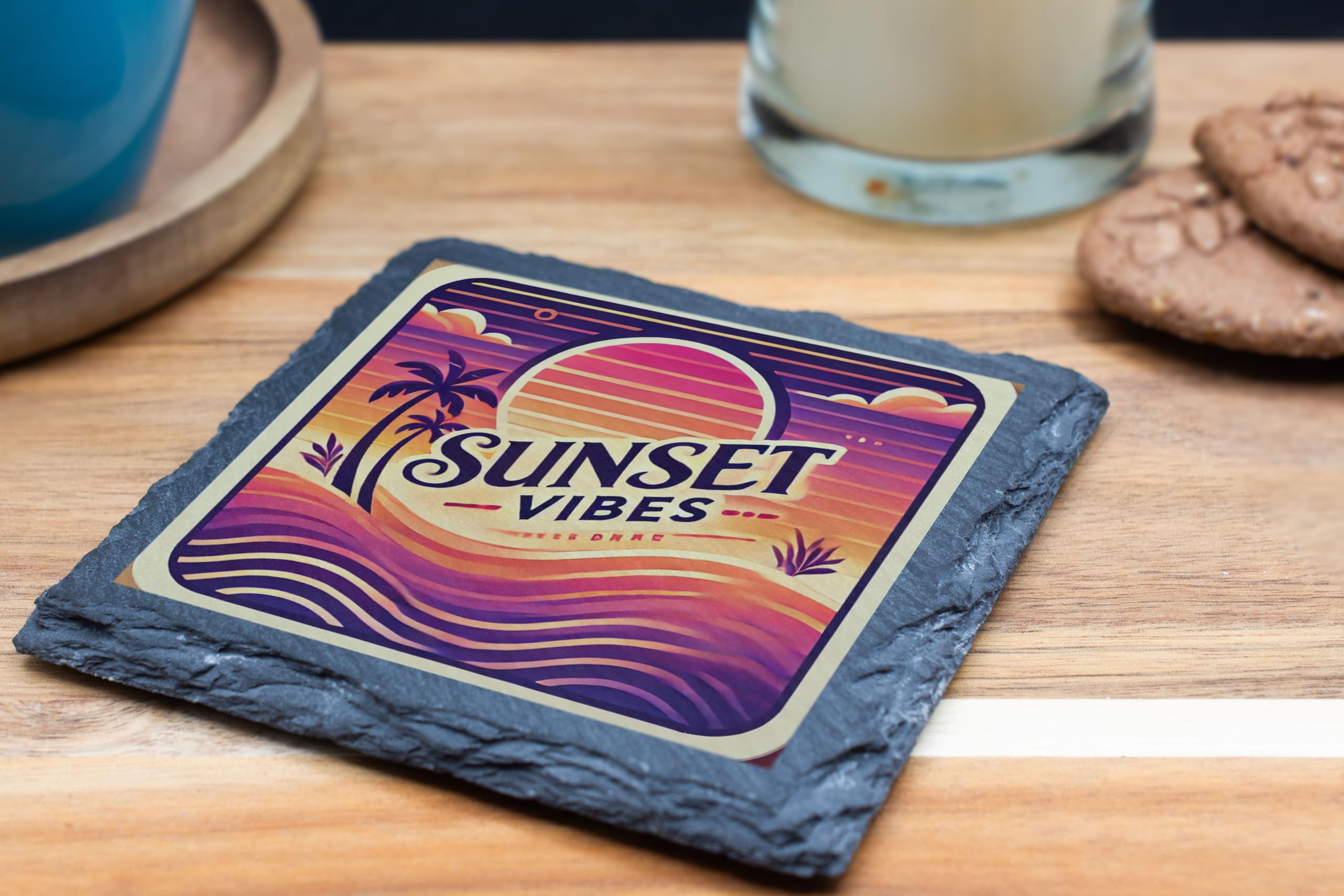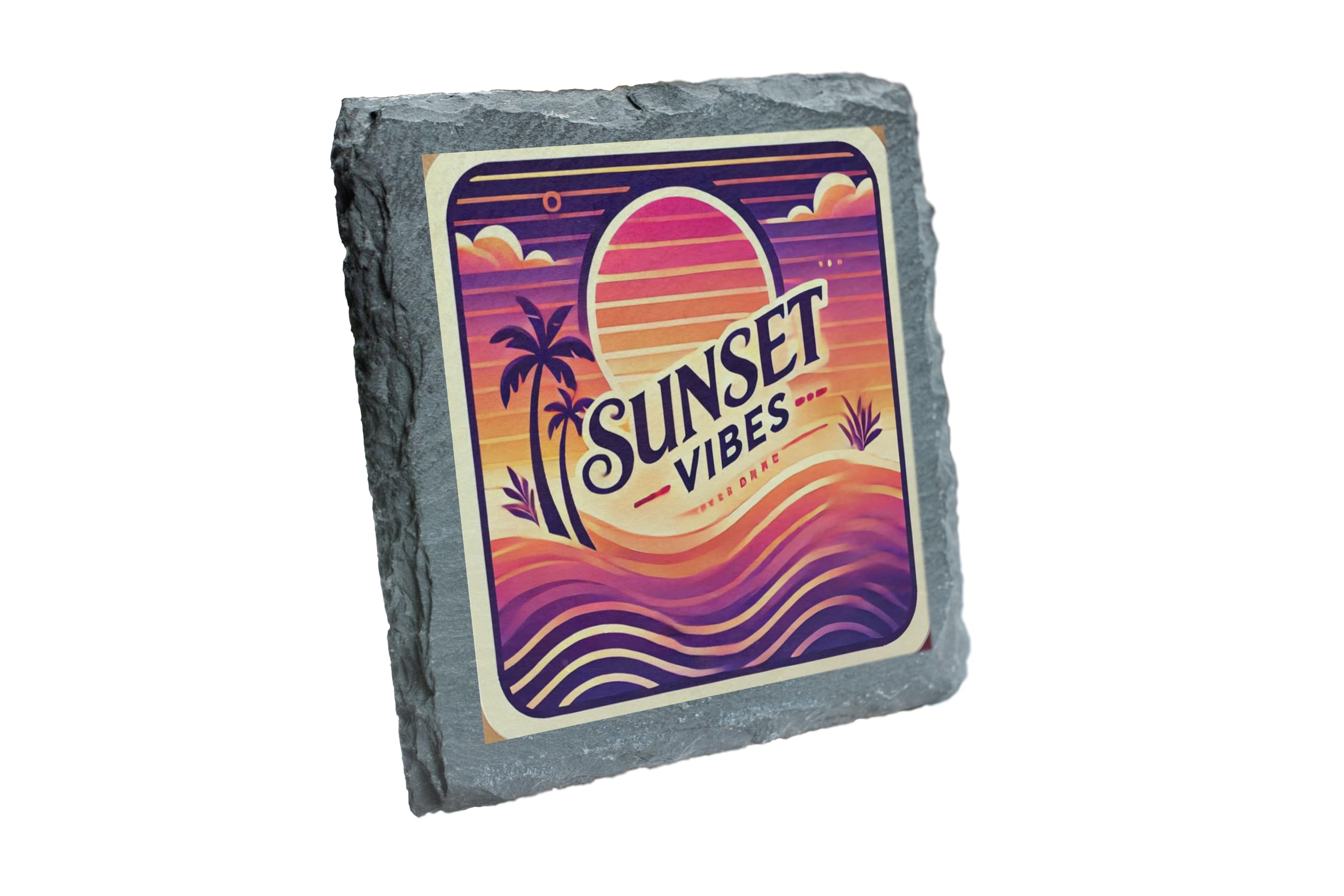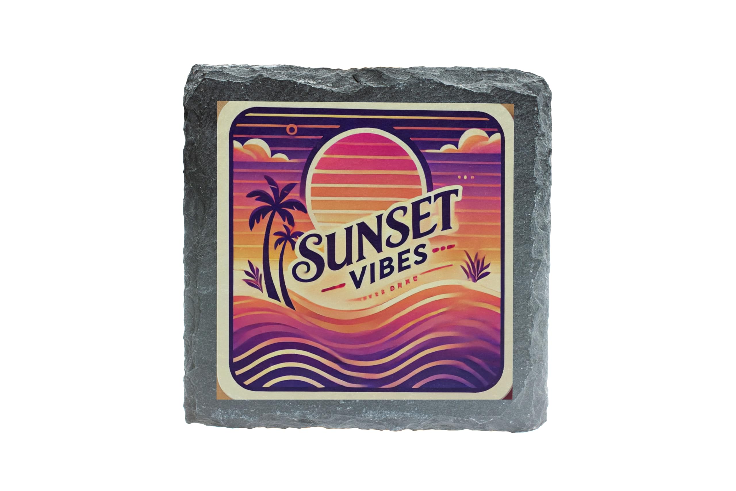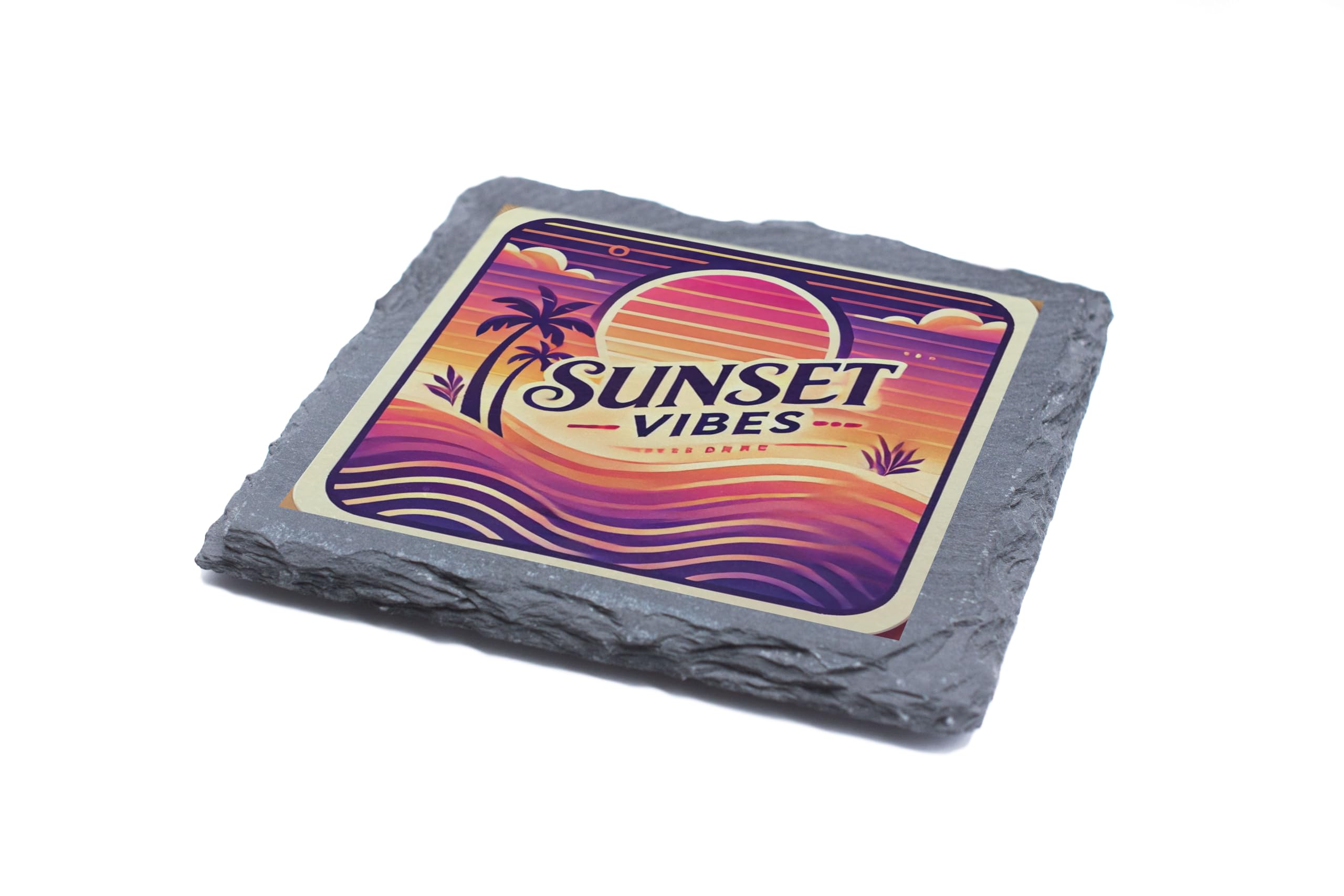 Create a relaxing tropical ambiance at home with this "Sunset Vibes" Slate Coaster. The bold and vivid colors of the sunset design bring a warm, laid-back feel to your space. Perfect for your morning coffee, evening cocktails, or as a stylish accent piece. Crafted from durable natural slate, this coaster not only protects your furniture but also adds a sophisticated touch. It?s an excellent choice for personal use or as a thoughtful gift for friends and family who appreciate tropical aesthetics.
