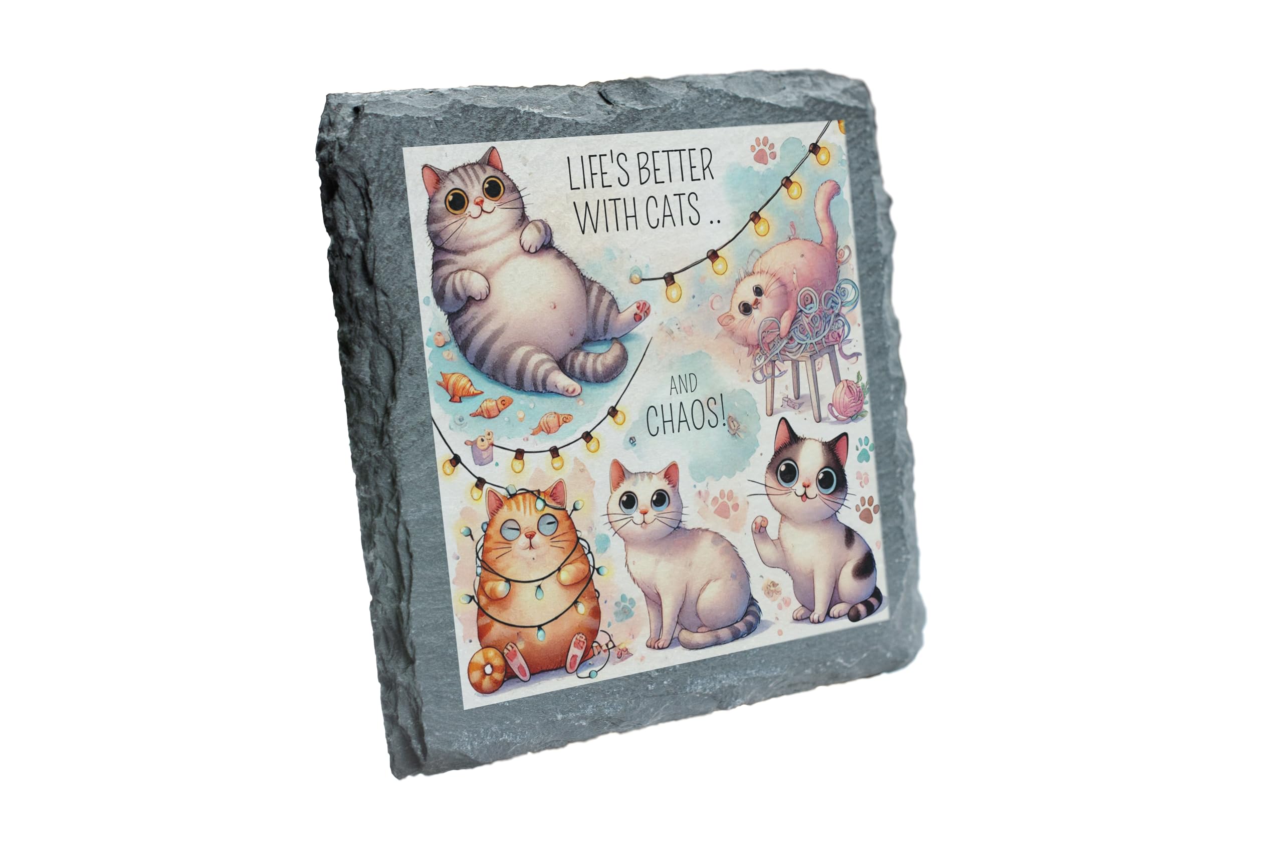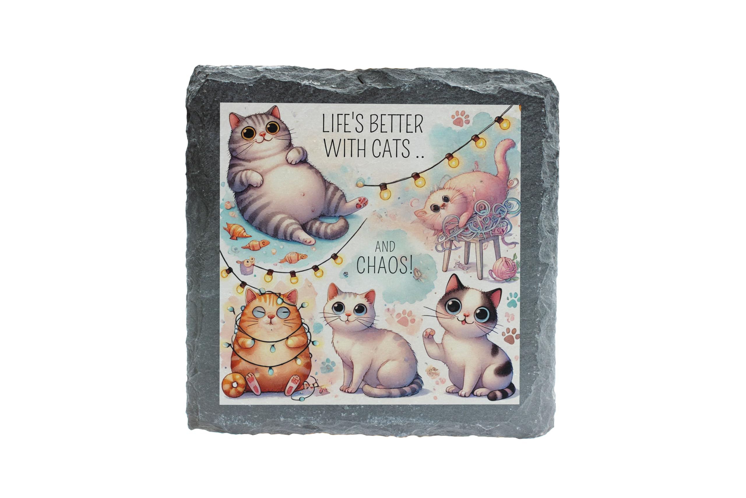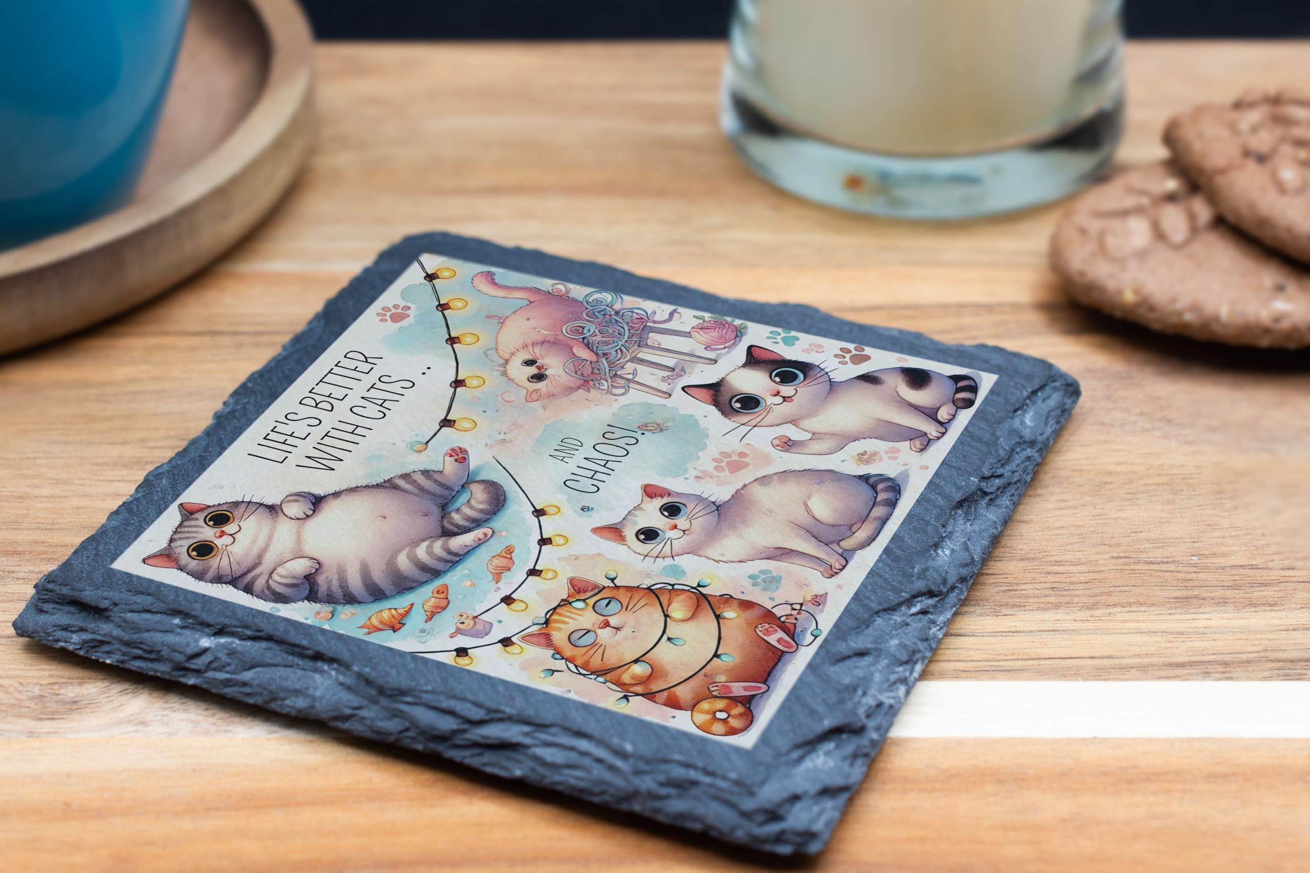 Bring a touch of humor and feline charm to your home with the "Adorable Cats Chaos Decorative Slate Coaster." Designed for cat enthusiasts, this coaster showcases an endearing illustration of mischievous cats creating delightful chaos. The phrase "Life?s Better with Cats... and Chaos" captures the essence of life with our furry companions. Crafted from high-quality natural slate, this coaster is not only visually appealing but also highly practical. It provides a sturdy, heat-resistant surface to protect your furniture while adding a stylish and fun element to your decor. Whether you're enjoying a coffee break or entertaining guests, this coaster is sure to spark conversations and brighten your day. Perfect as a gift for cat lovers, this charming coaster is ideal for birthdays, holidays, or as a thoughtful surprise for anyone who can't resist the antics of adorable cats. Make your home cozier, quirkier, and full of personality with this one-of-a-kind decorative coaster.