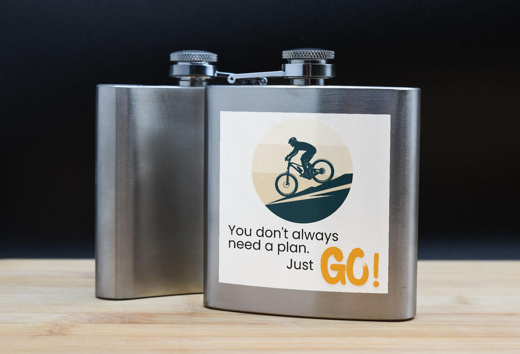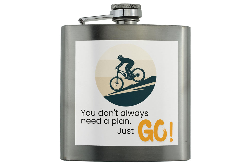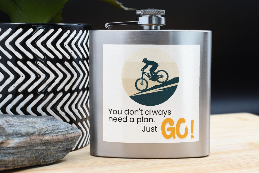 Introducing our Adventure Flask - Mountain Bike You Don't Always Need a Plan Just Go Design! This stainless steel flask is not just your ordinary beverage container, it is a piece of motivation and inspiration for all outdoor enthusiasts. The UV printed design on this portable flask features a sleek mountain bike theme with the powerful message 'you don't always need a plan, just go'. This full colour printed flask is perfect for hiking, cycling, or any outdoor adventure. Made from durable stainless steel, this rugged flask is the ideal companion for all your travels and sports activities. Whether you are hitting the trails or exploring new paths, this Adventure Flask will keep your favourite beverage close at hand. Get one for yourself or gift it to a friend who shares your passion for adventure!