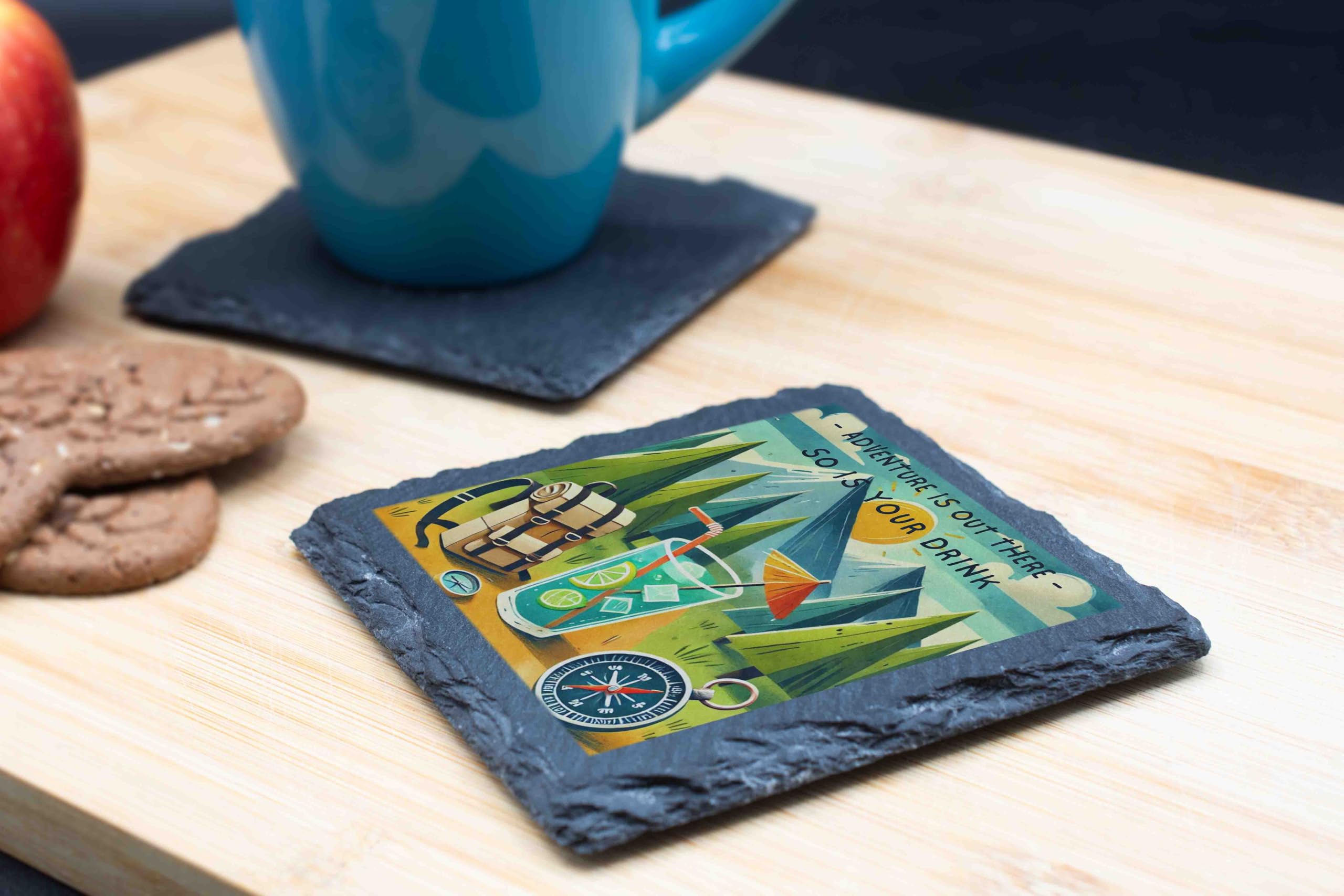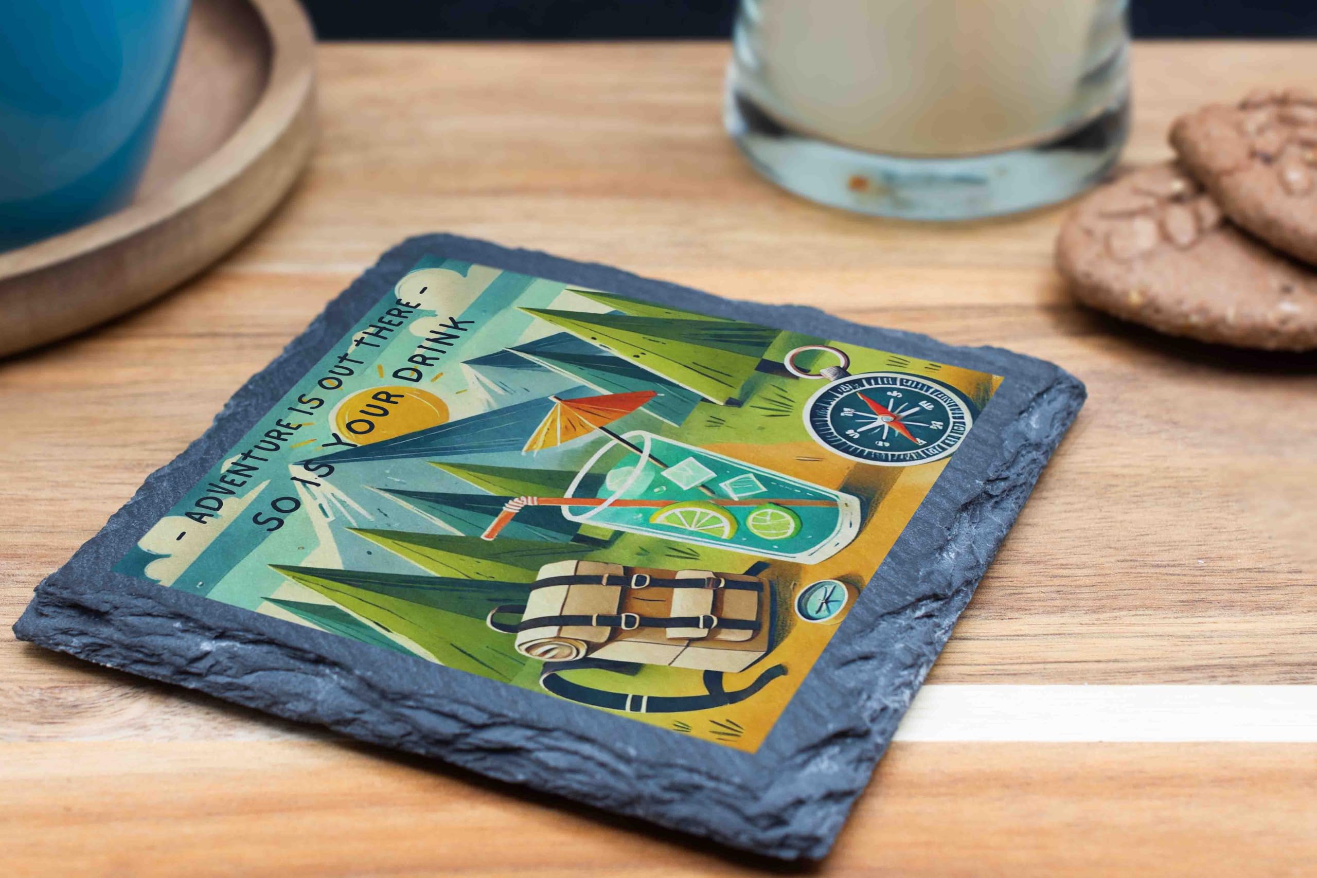 Bring the spirit of adventure to your home with this "Adventure is Out There" slate coaster. The vibrant design celebrates the love for the great outdoors, featuring a scene of towering mountains, a trusty compass, and a refreshing drink illustration. This coaster is perfect for those who find joy in exploring nature and enjoying life's simple pleasures. Crafted from natural slate, this coaster combines durability with rustic charm. The protective felt backing ensures it stays securely in place while preventing scratches on surfaces. Whether you use it to hold your favorite drink or as a decorative piece, this coaster is a versatile addition to any space. A thoughtful gift for hikers, campers, and adventure seekers, this coaster adds a touch of wanderlust to daily life. Celebrate the beauty of exploration with this functional and inspiring drinkware accessory.