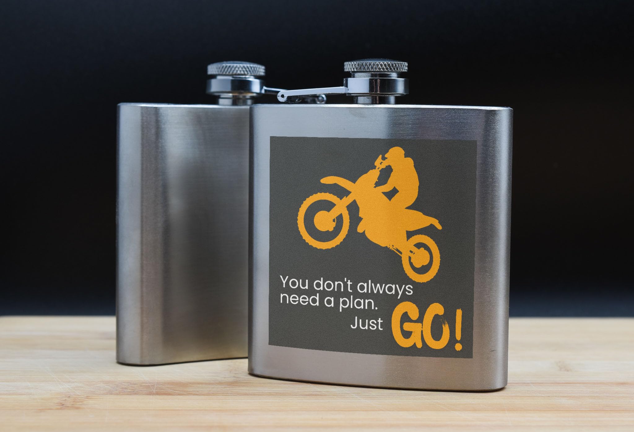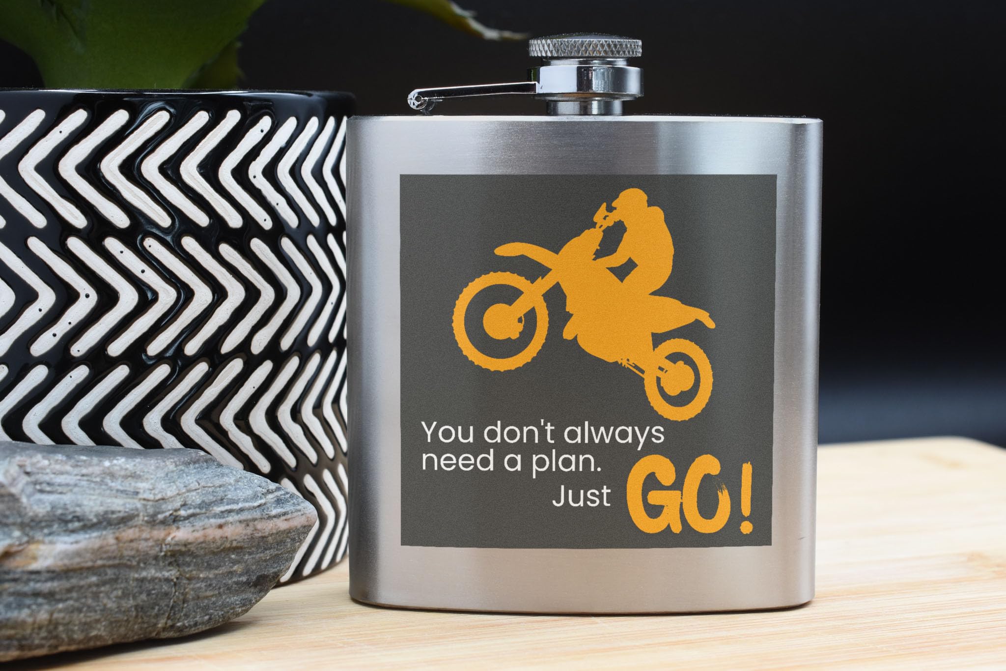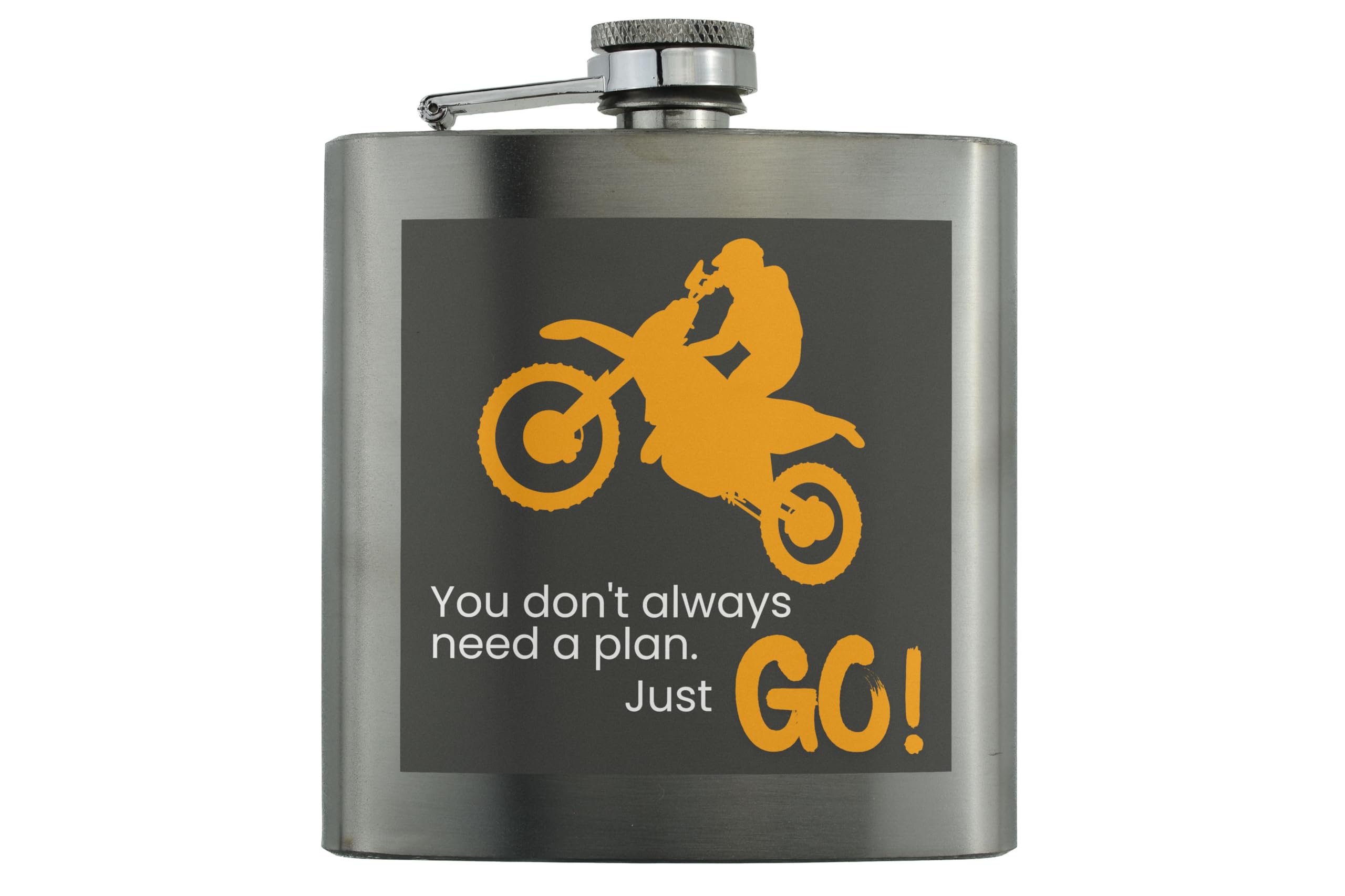 Introducing our Adventure Motorcycle Flask, the perfect gift for any motocross enthusiast or outdoor adventurer! This stainless steel flask features a bold and vibrant design inspired by off-road biking, making it the ultimate accessory for any rider. The UV printed design reads 'You don't always need a plan. Just GO!', reminding you to embrace the spirit of adventure and live life to the fullest. Whether you're hitting the trails or cruising on your bike, this flask is sure to keep you hydrated in style. Add this high-adrenaline flask to your collection or give it as a thoughtful gift to a motorcycle lover in your life!