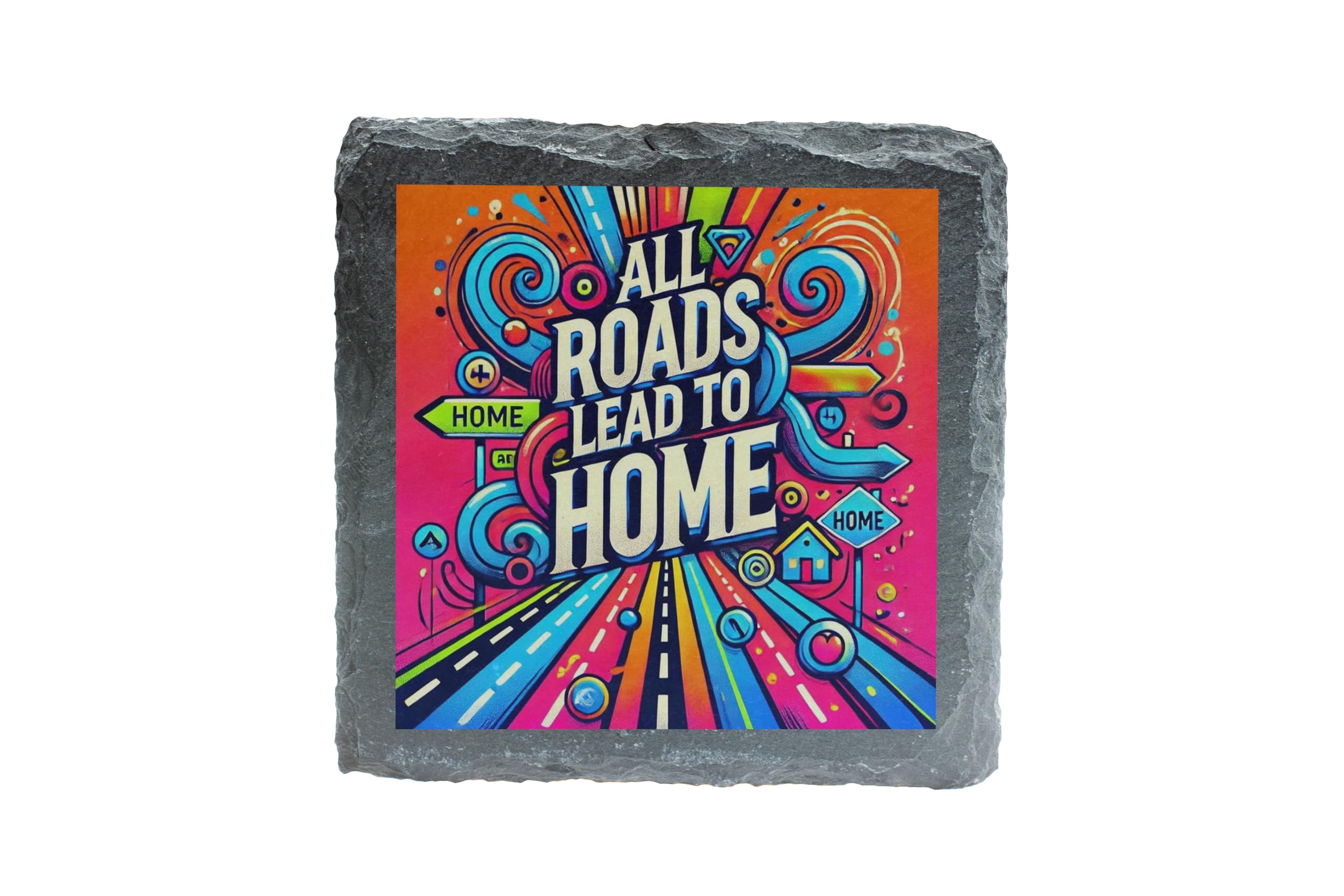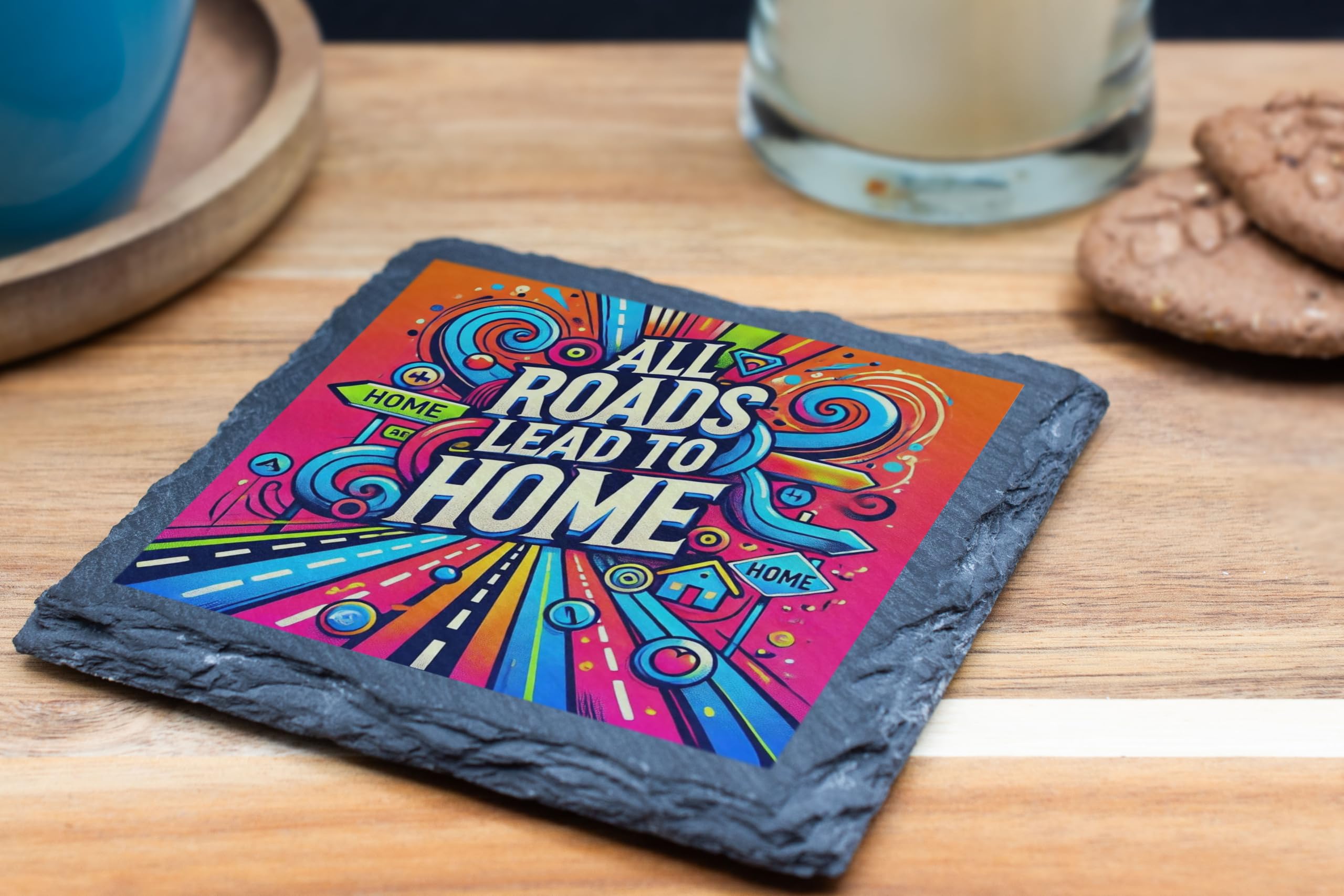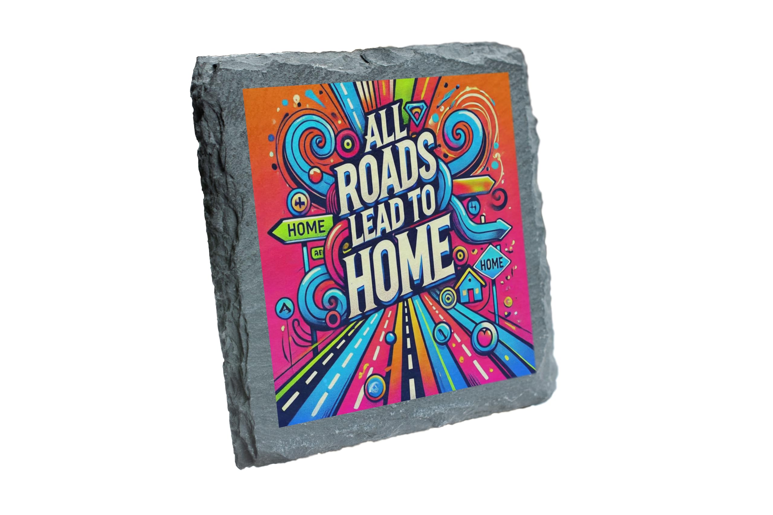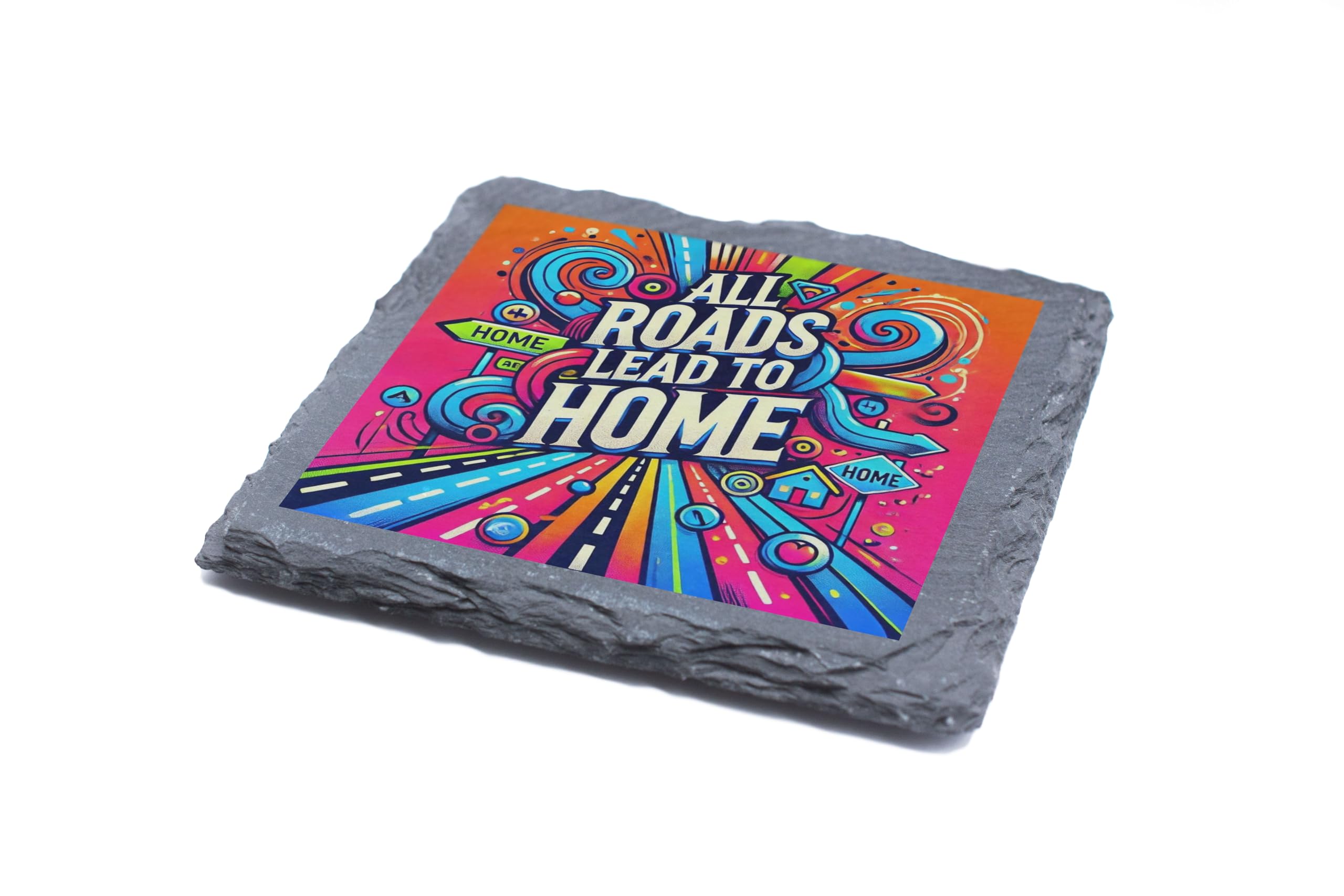 Brighten up your living space with the "All Roads Lead to Home" Slate Coaster. Crafted from high-quality natural slate, this coaster is not only functional but also a vibrant piece of art. Its dynamic design and heartfelt message serve as a constant reminder of the love and warmth that home provides. Ideal for any room, this coaster is perfect for protecting your surfaces from drinkware while adding a cheerful and meaningful touch to your decor. Its durable construction and non-slip backing ensure stability and long-term use. Whether you're looking to enhance your own home or searching for a thoughtful gift, this coaster is the perfect choice. Celebrate the comfort of home with a practical yet stylish addition to your collection!
