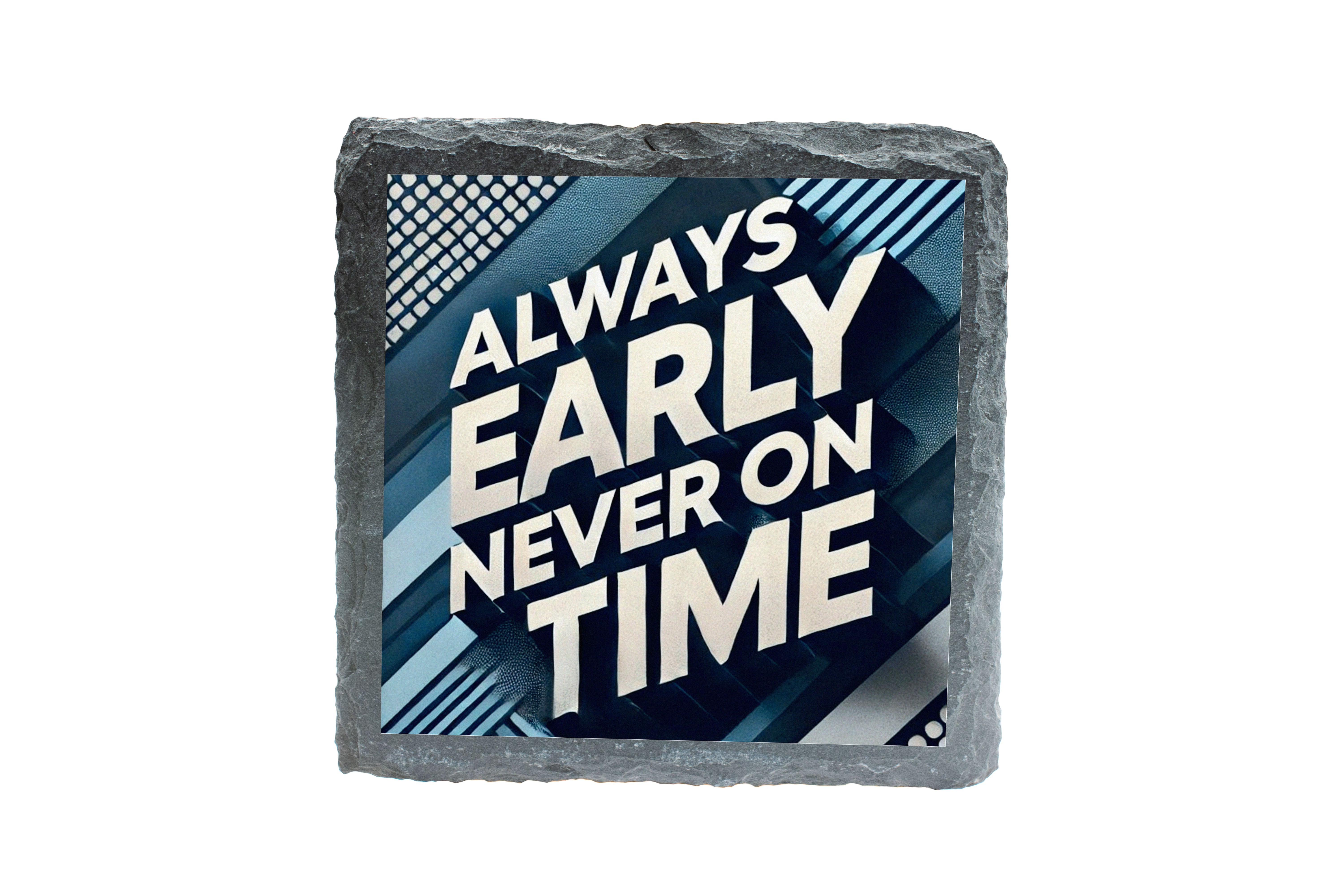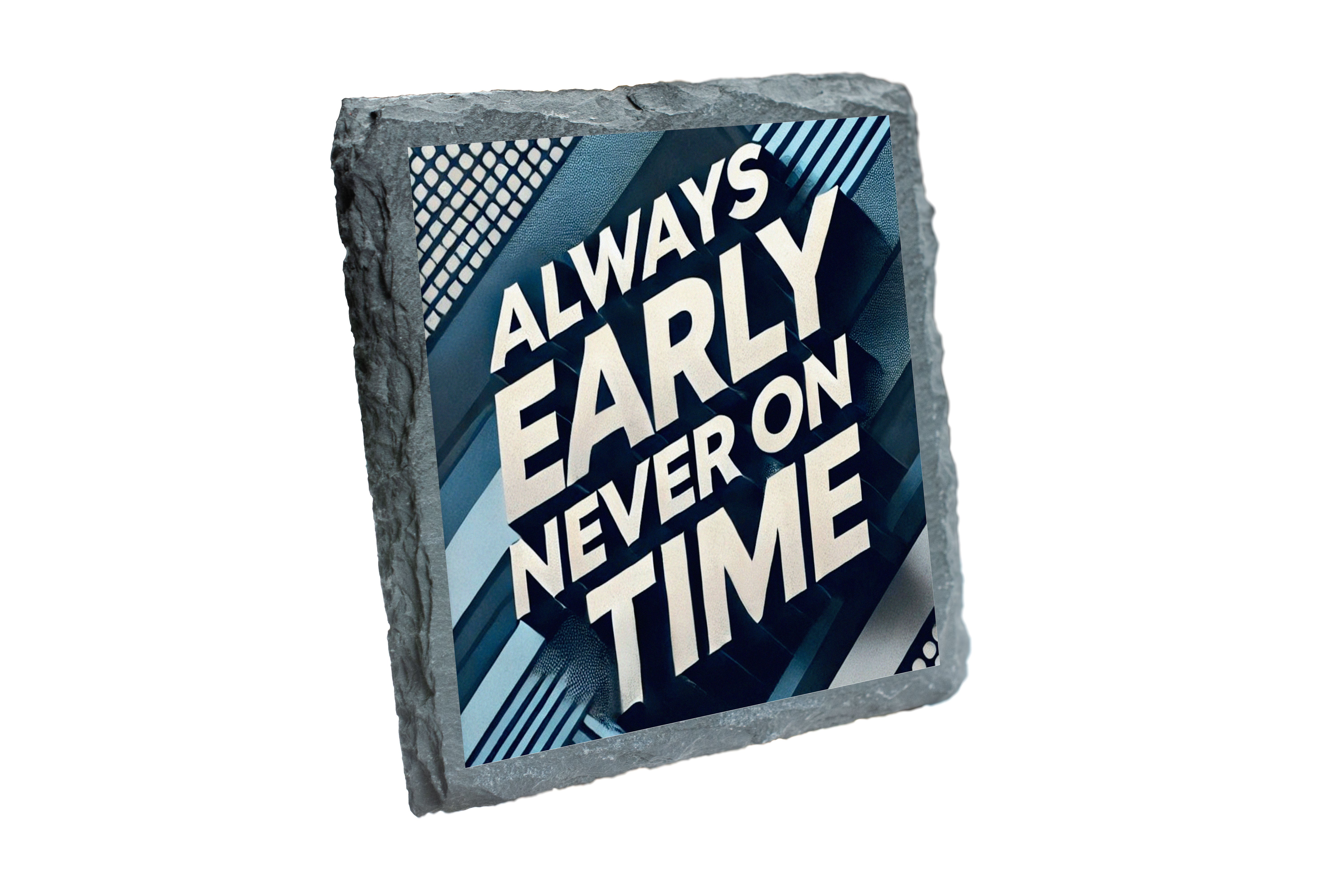 Add a touch of humor to your coffee table with this unique slate coaster featuring the bold and witty phrase 'Always Early, Never On Time'. Made from high-quality natural slate, this coaster is perfect for protecting your surfaces from drink rings and spills. The rugged texture and modern design make it a stylish addition to any home or office. Ideal for gifts or personal use, this coaster combines functionality with a playful twist.