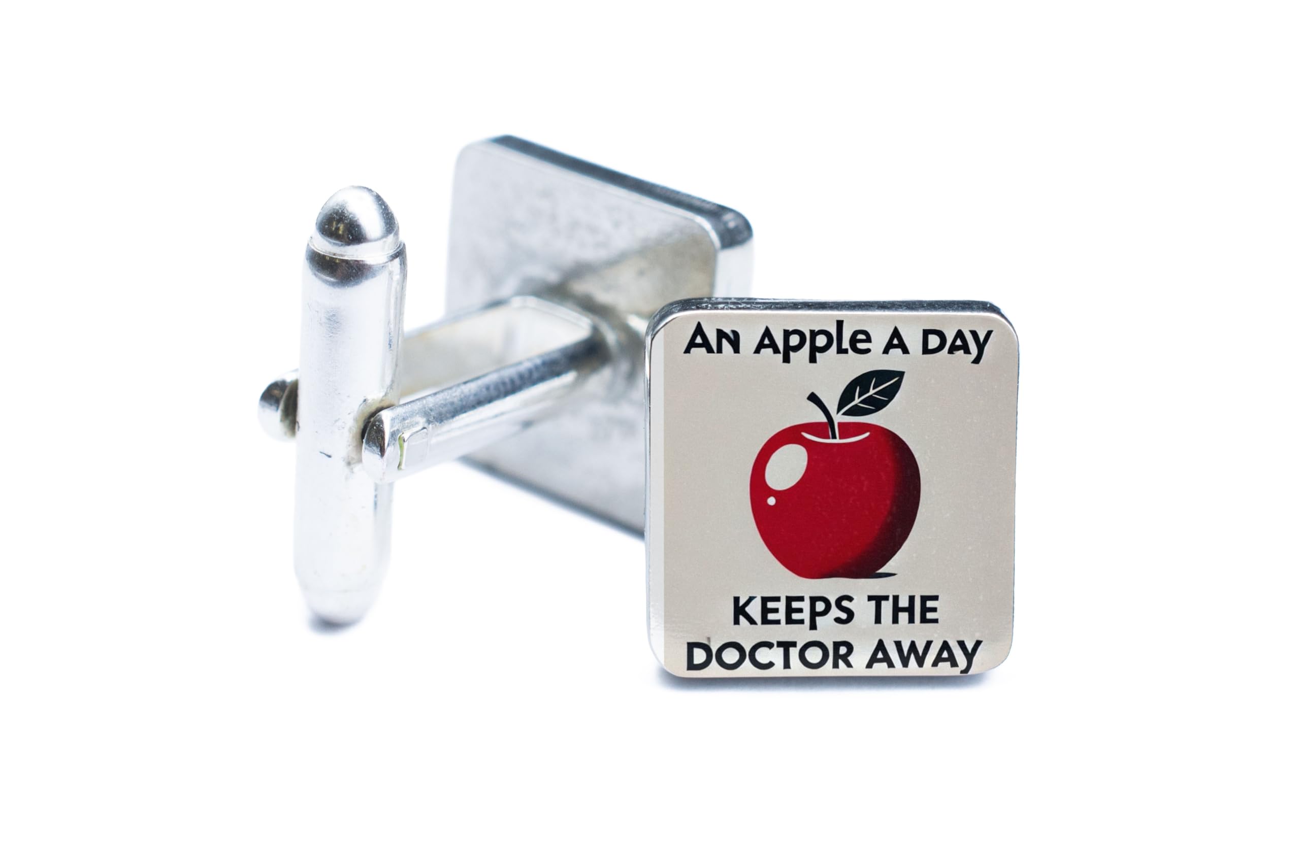 Bring a smile to any outfit with these ?An Apple a Day? Cufflinks! Showcasing a bold red apple and the classic phrase, these cufflinks combine charm and humor to create a standout accessory. Whether you?re looking to add personality to a formal suit or a fun touch to your everyday wardrobe, these cufflinks are perfect for any occasion. Made from high-quality materials, they feature a polished finish and vibrant enamel design that?s built to last. Ideal as a gift for health enthusiasts, doctors, or anyone who enjoys a good pun, these cufflinks come packaged in a stylish box, making them a ready-to-go present.