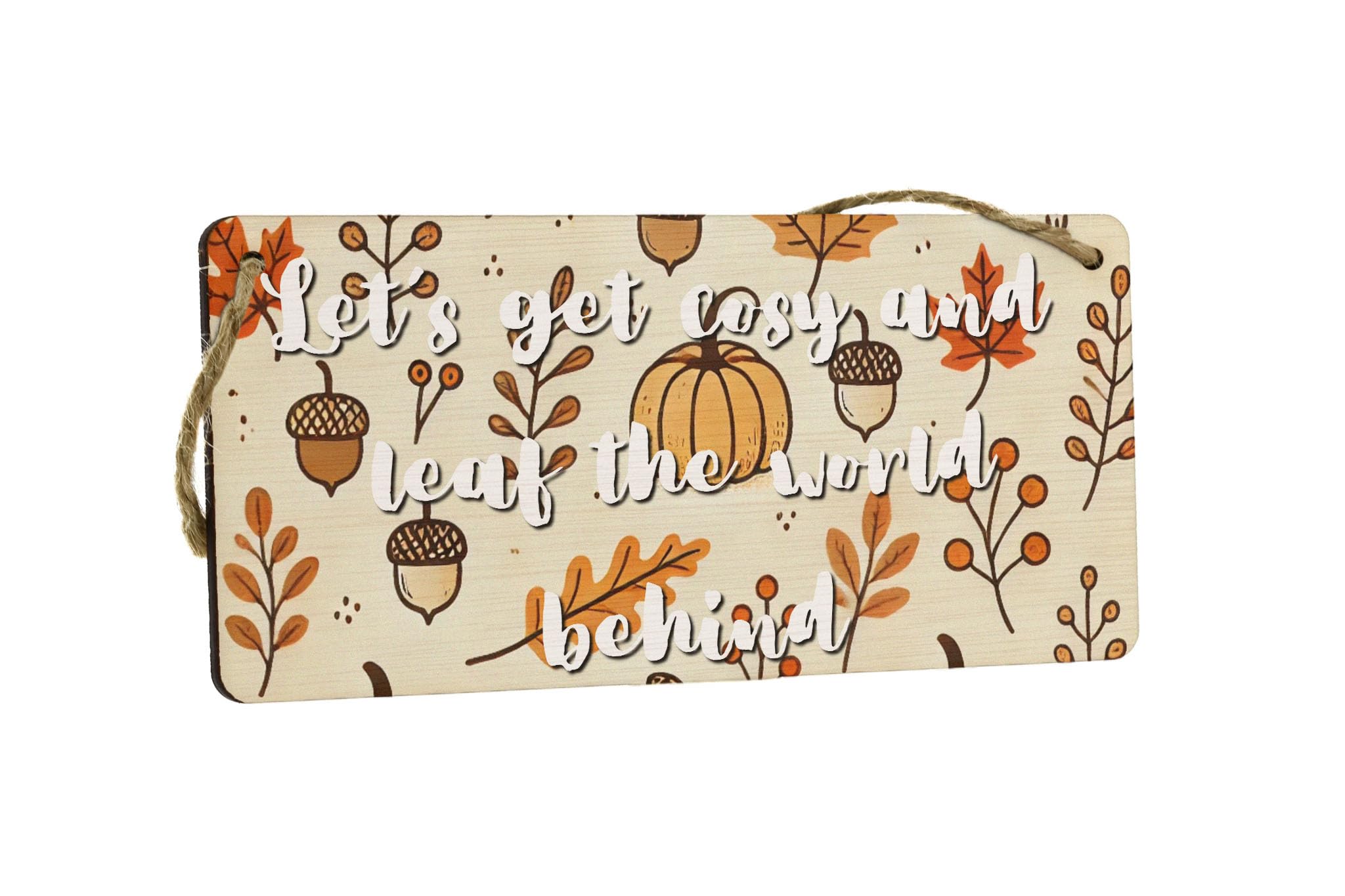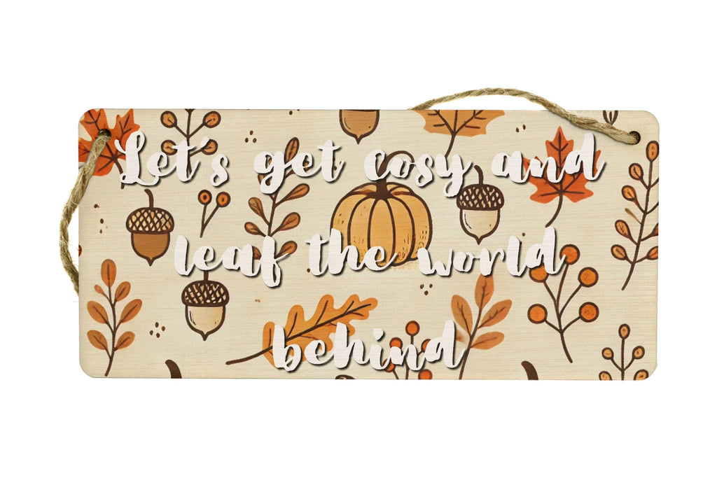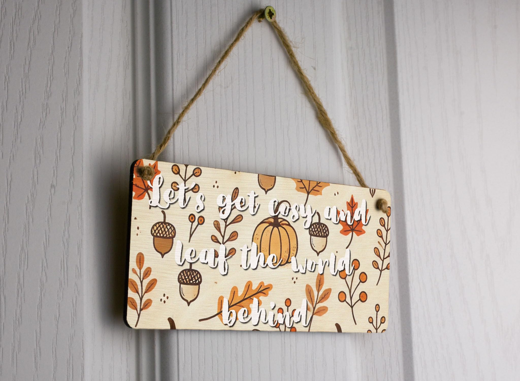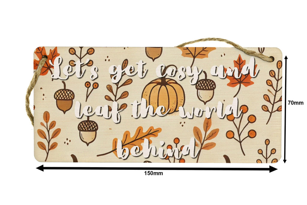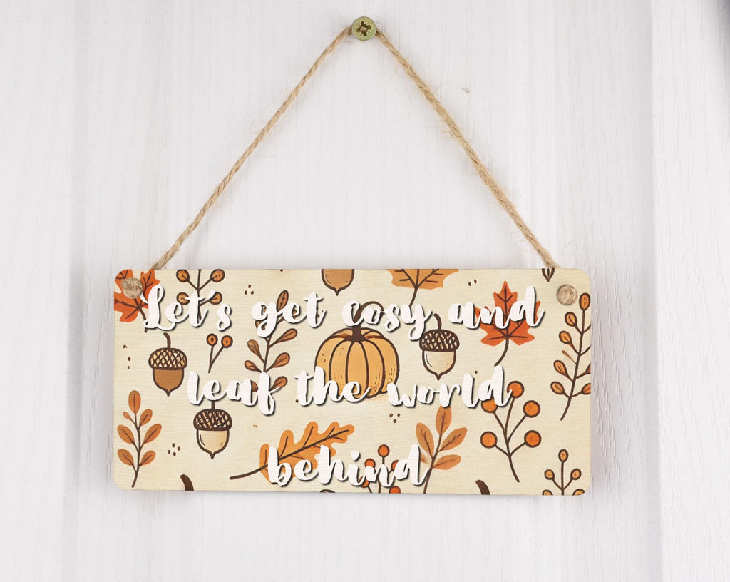 - Autumn themed wooden sign featuring a cosy and inspirational 'Let's get cosy and leaf the world behind' message