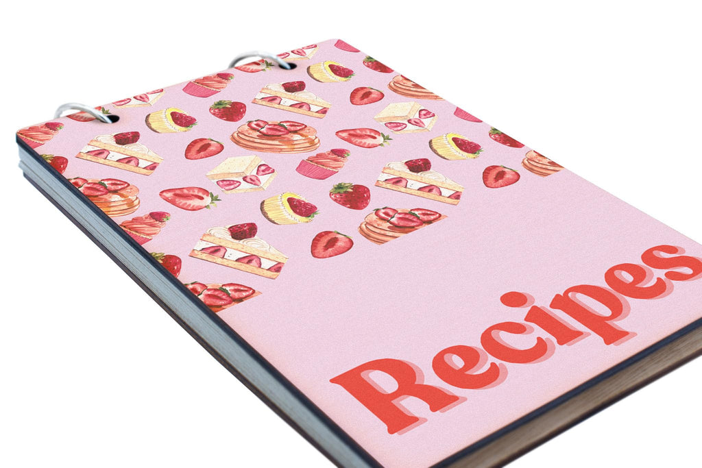 - Handmade recipe book with wooden cover and 'recipes' engraving