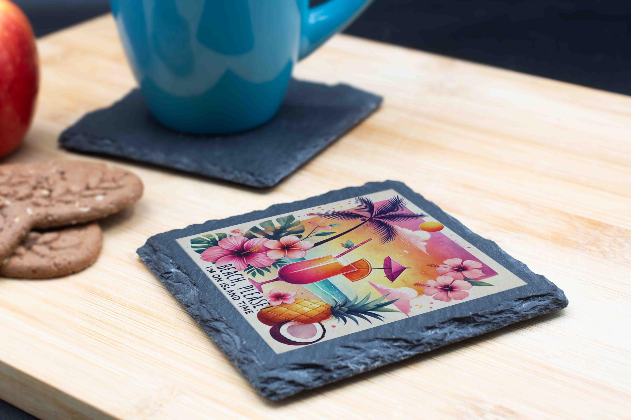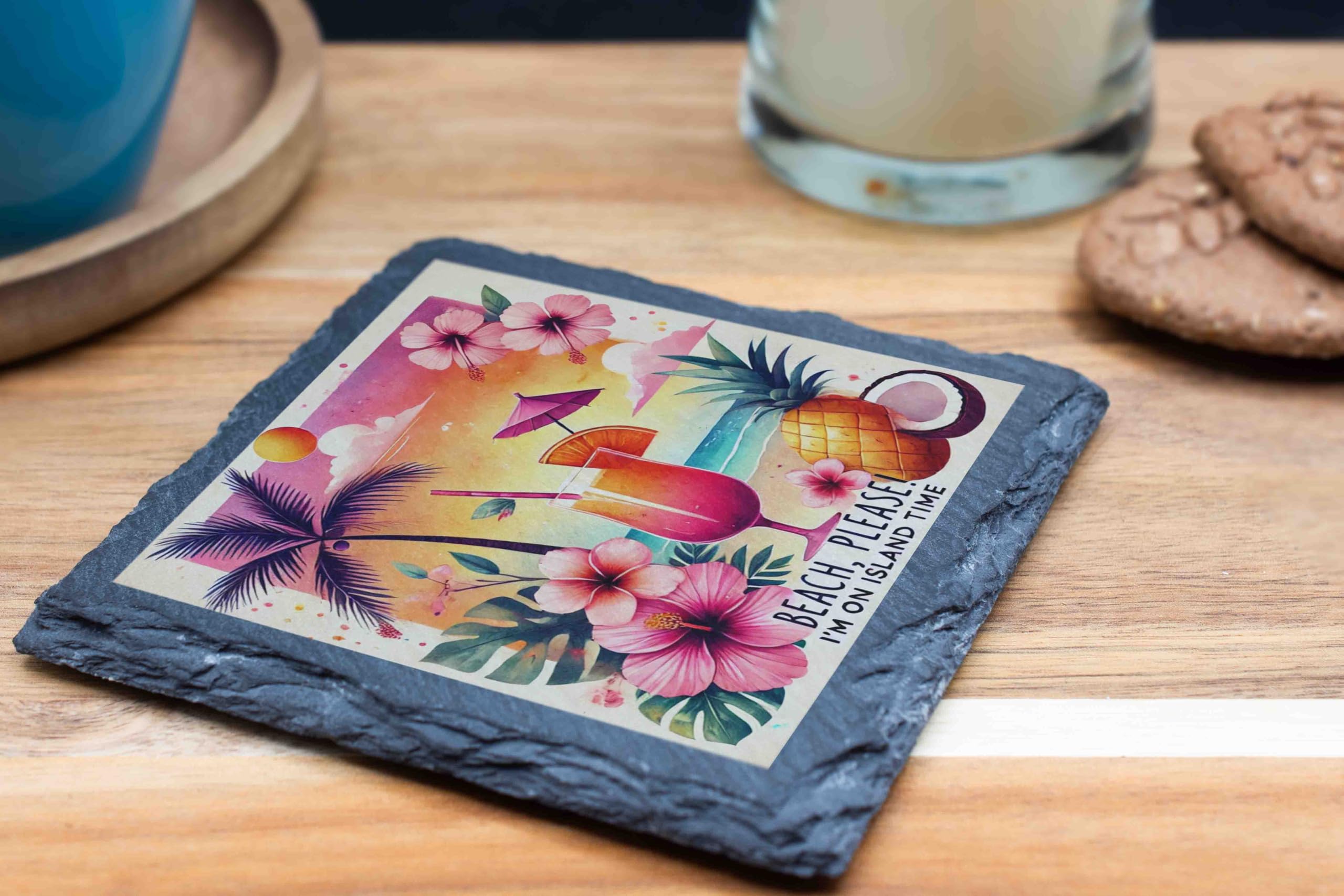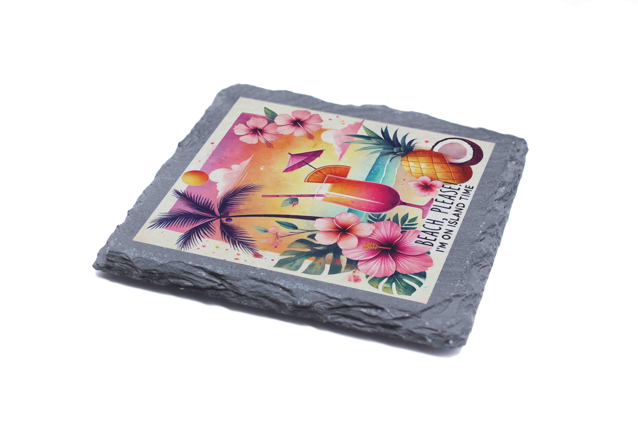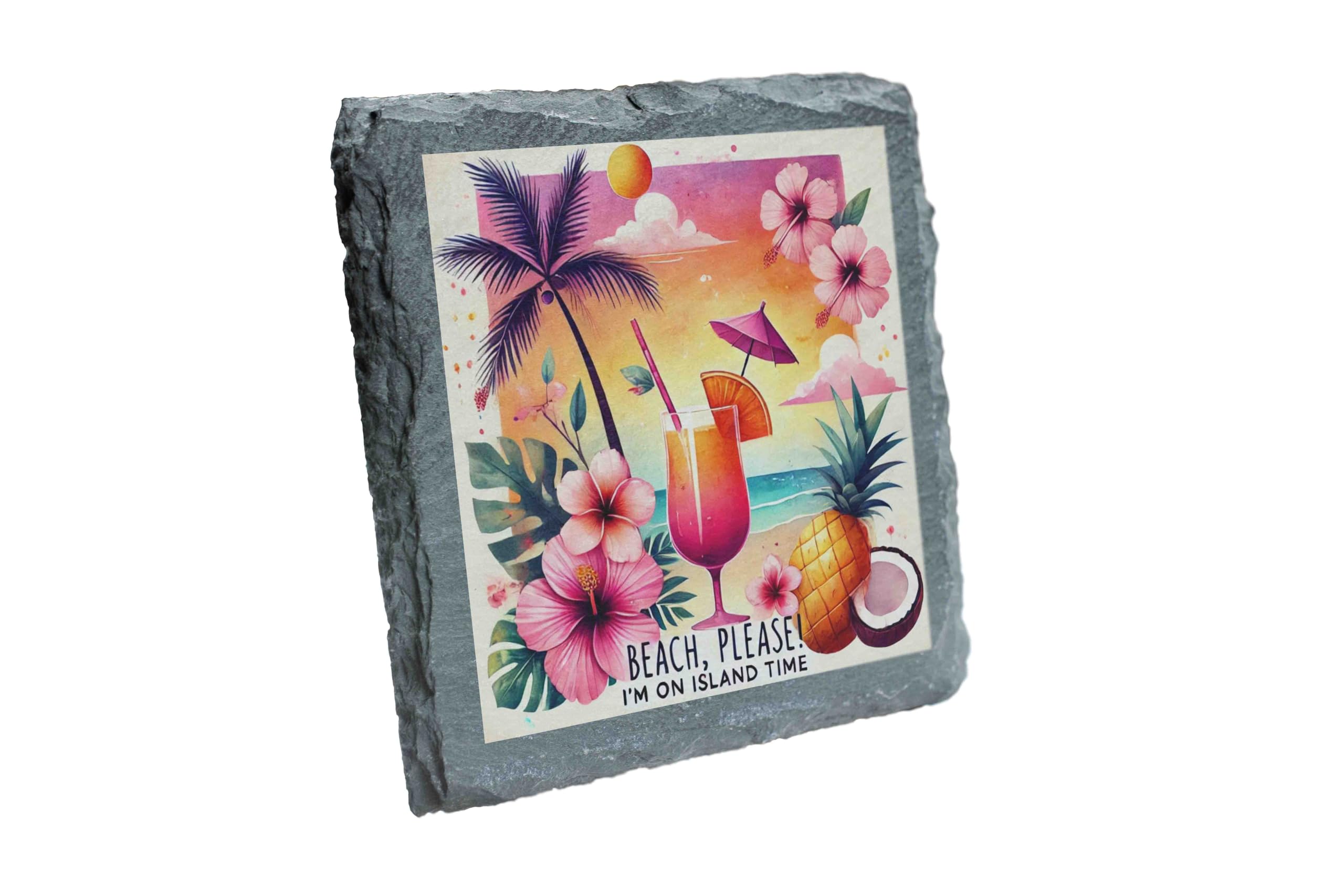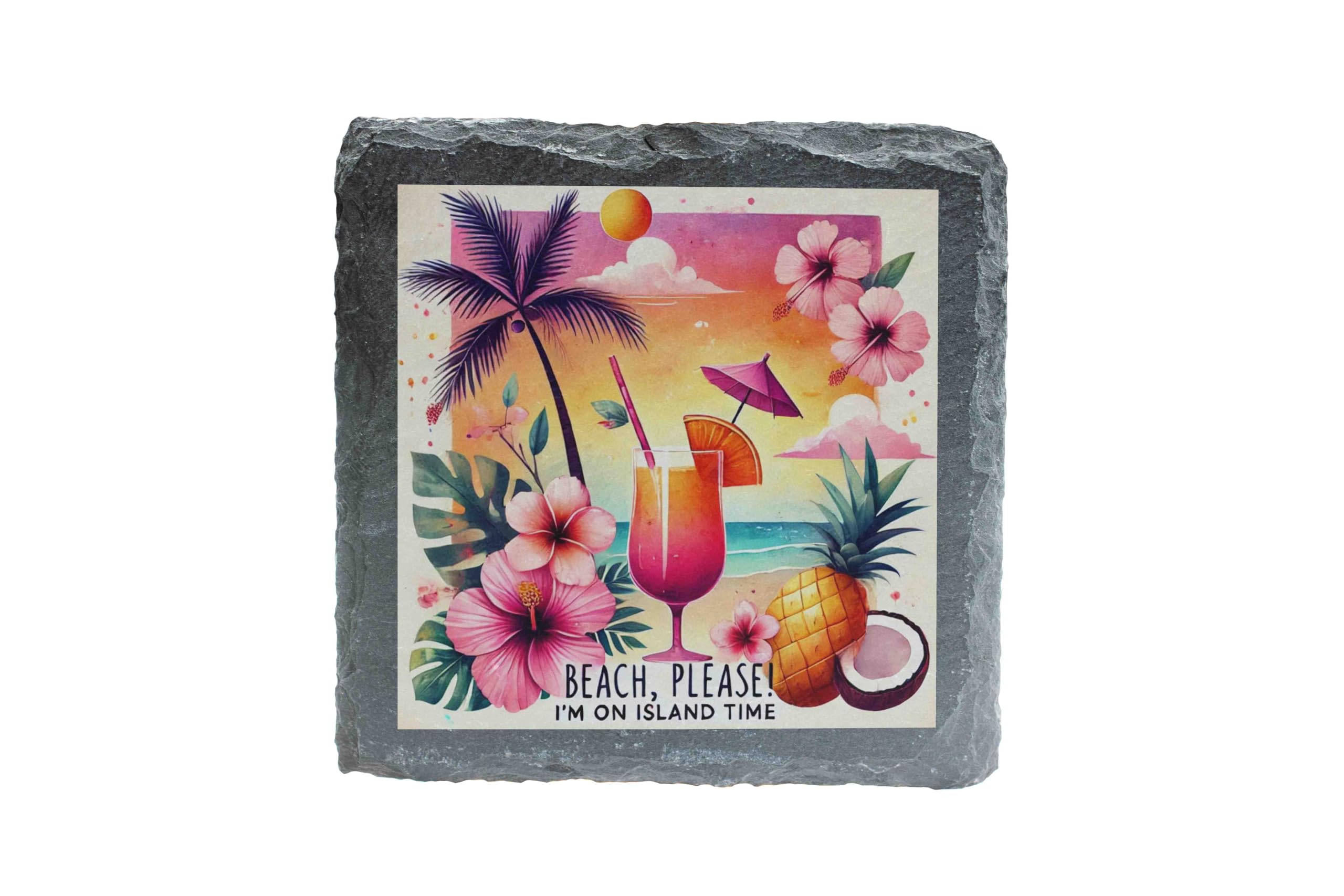 Escape to paradise with this "Beach Please" slate coaster, the perfect way to bring tropical charm to your home. Designed with a stunning mix of sunset hues, lush hibiscus flowers, and playful palm tree accents, it embodies island vibes in every detail. The cheeky phrase "Beach Please, I'm on Island Time" adds a touch of humor, making it a must-have for cocktail parties, beach-themed decor, or everyday use. Crafted from high-quality natural slate, this coaster offers exceptional durability and style. Its felt backing ensures your surfaces are protected from scratches while staying securely in place. Whether you're sipping on a pi?a colada or a refreshing iced tea, this coaster will make every drink feel like a vacation. Perfect as a gift for beach lovers or as a standout addition to your summer decor collection!