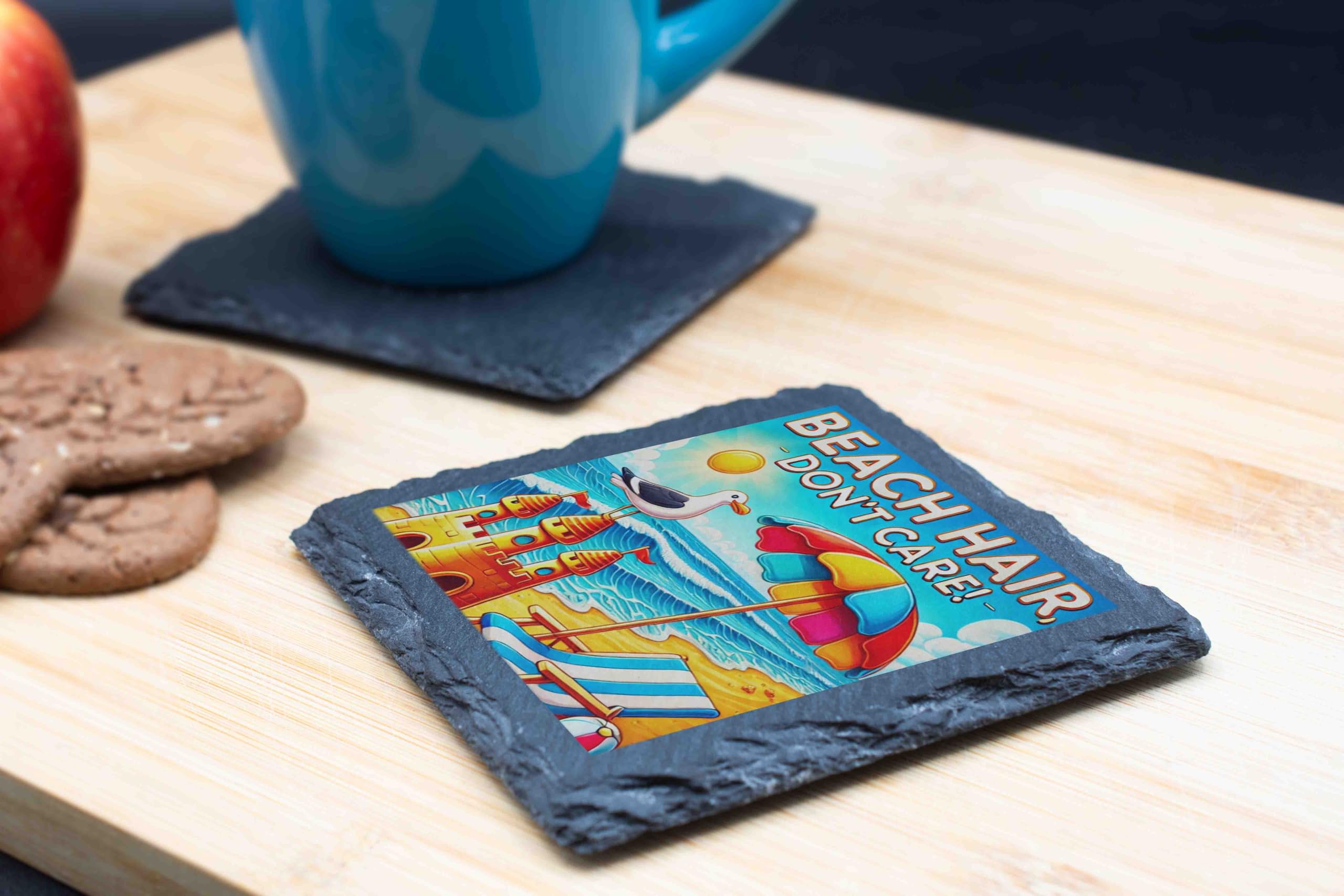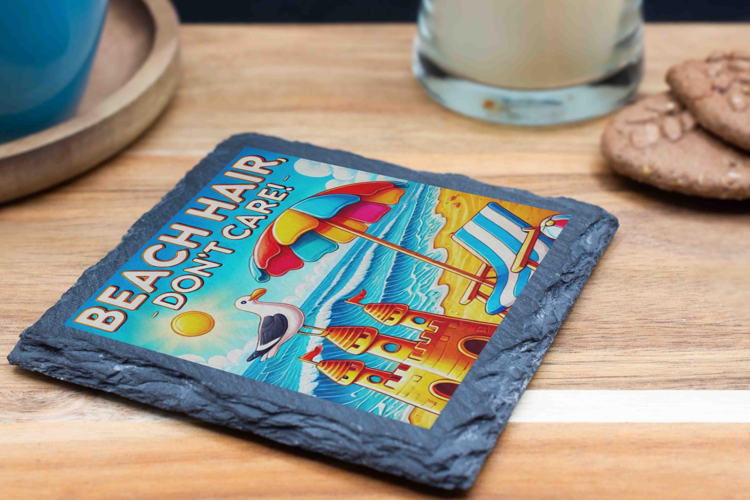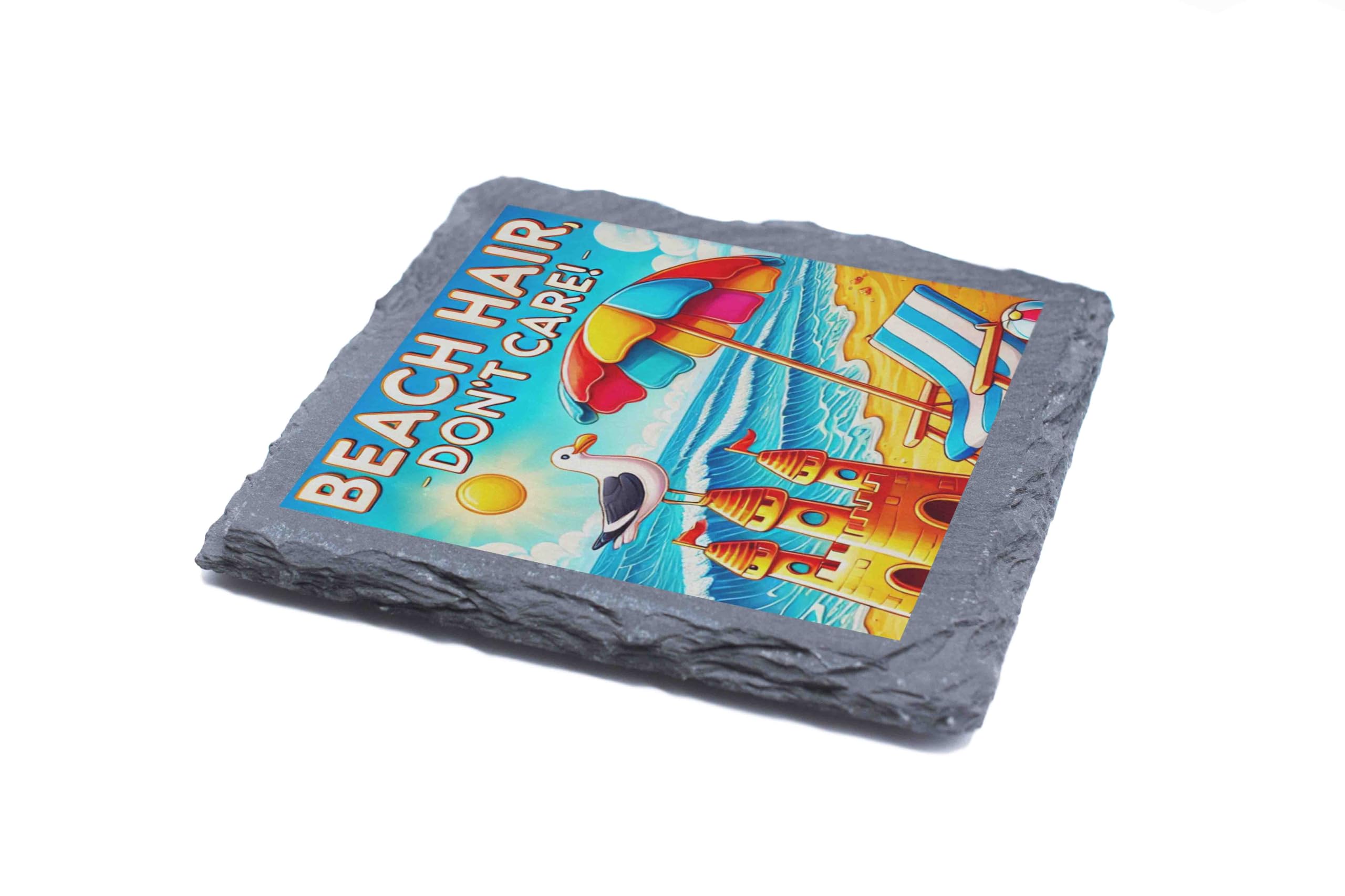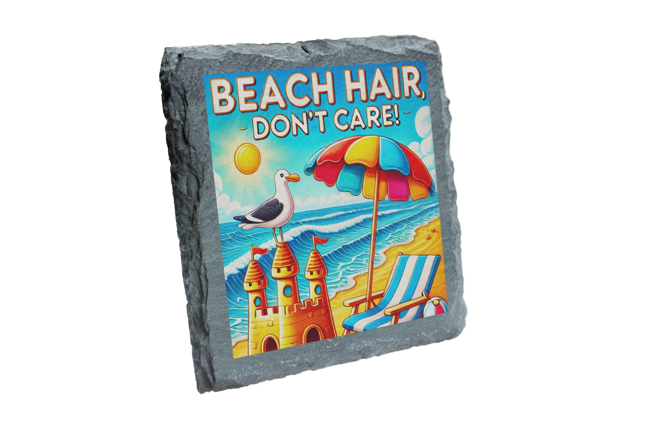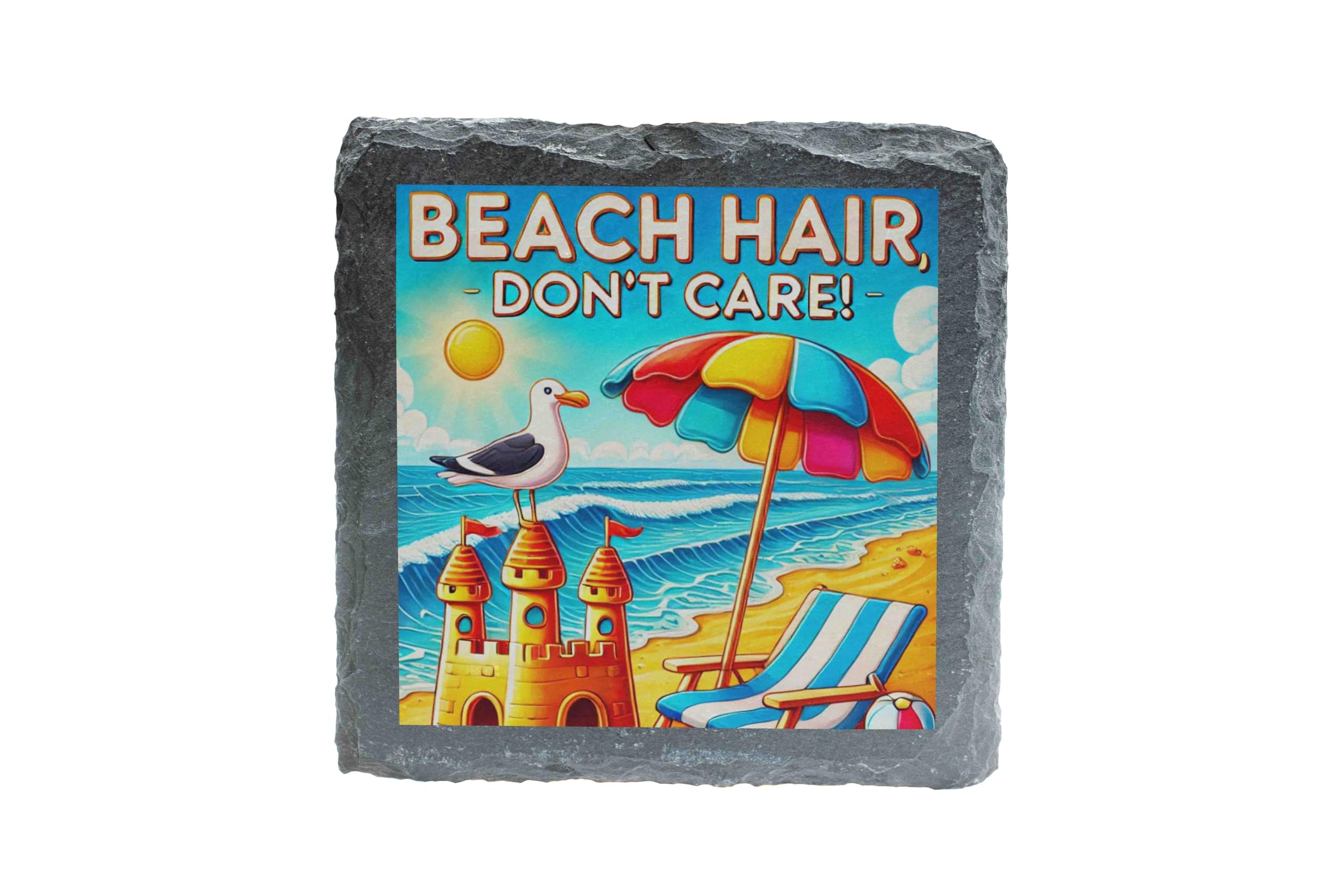Capture the carefree spirit of summer with this Beach-Themed Slate Coaster, a perfect combination of functionality and vibrant artistry. The design features a lively beach scene, complete with a sandcastle, colorful umbrella, and the cheerful text "Beach Hair Don't Care!" bringing the ocean breeze right to your table. Handcrafted from natural slate, this coaster offers durable protection for your furniture against heat and moisture. Its rugged edges and rich colors make it a decorative accent that?s sure to spark conversations. This coaster makes an excellent gift for beach enthusiasts or anyone looking to add a touch of seaside charm to their home. Whether you're hosting a summer party or sipping your morning coffee, let this coaster transport you to the sandy shores.