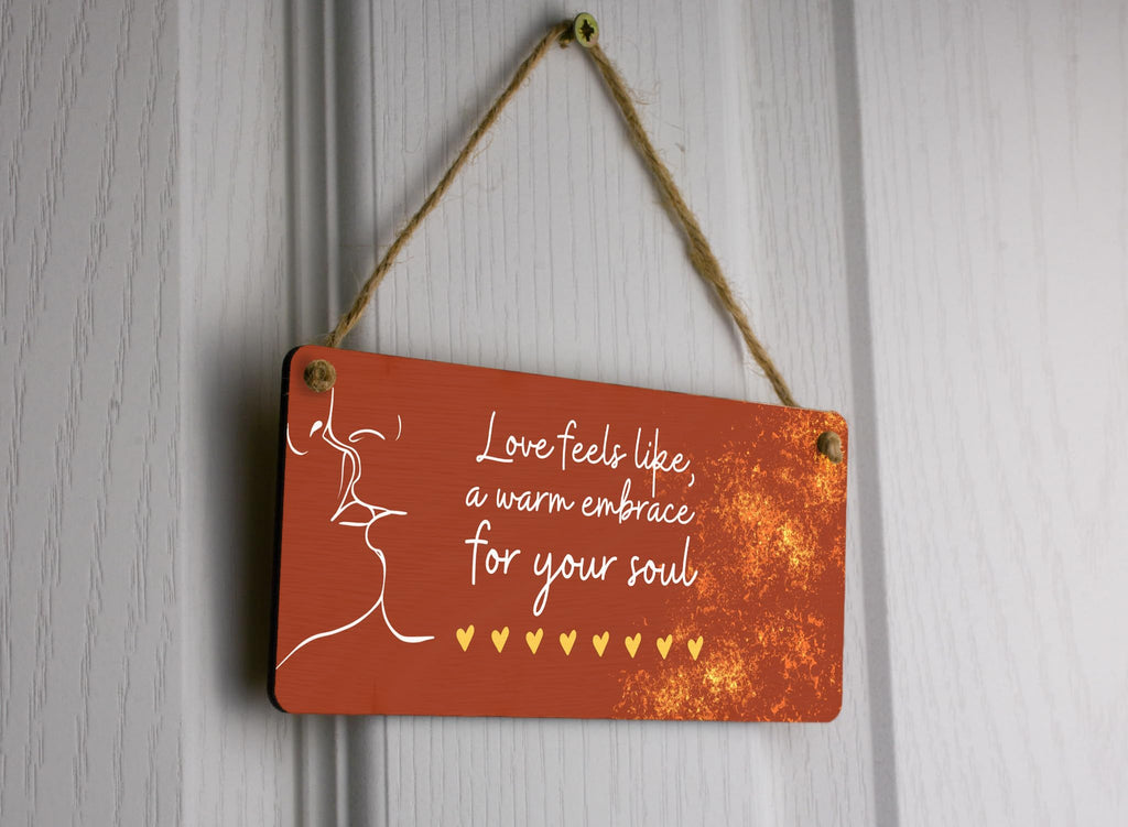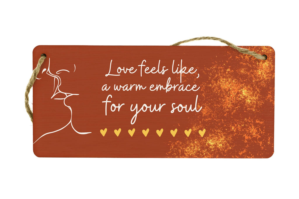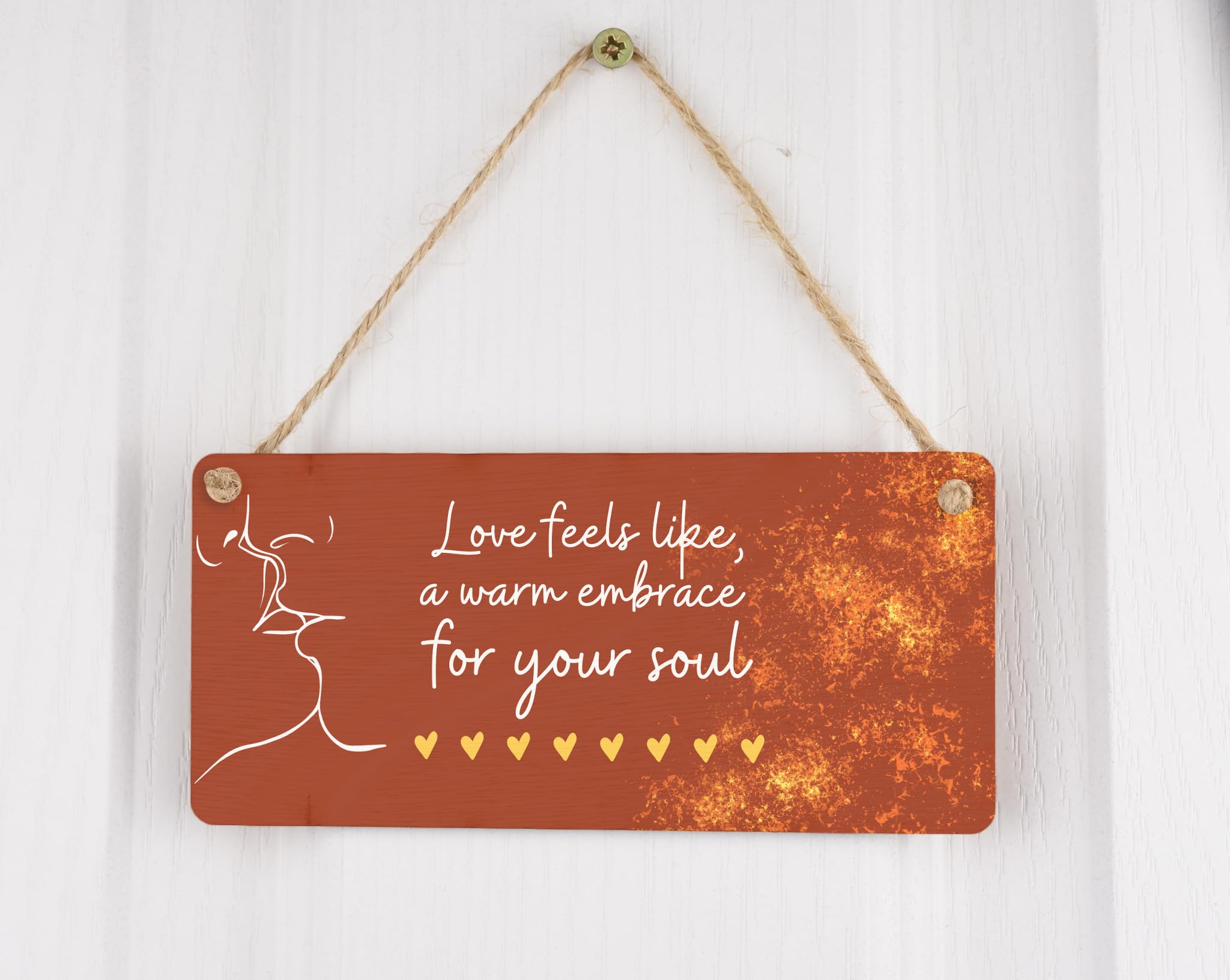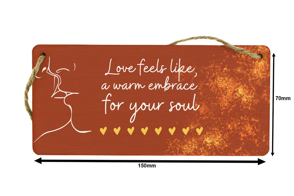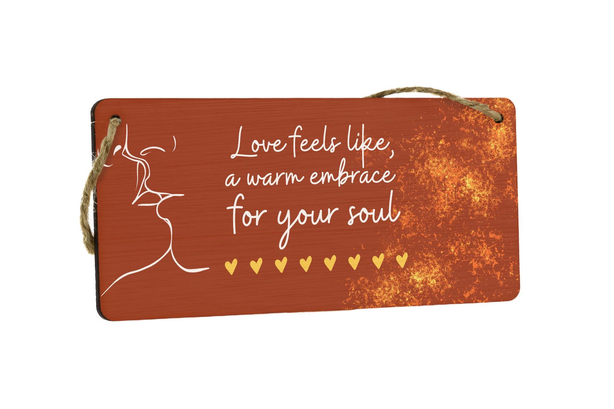 Enhance the ambiance of your home with this exquisite wooden hanging sign. Made from quality plywood, this hanging sign features a beautiful design that reads 'Love feels like a warm embrace for your soul.' Its elegant and rustic appearance makes it the perfect addition to any home decor. This full-colour sign is not only a stunning piece of art but also a thoughtful gift for your loved ones on Valentine's Day. Hang it in your living room, bedroom, or any other space to create a warm and loving atmosphere.