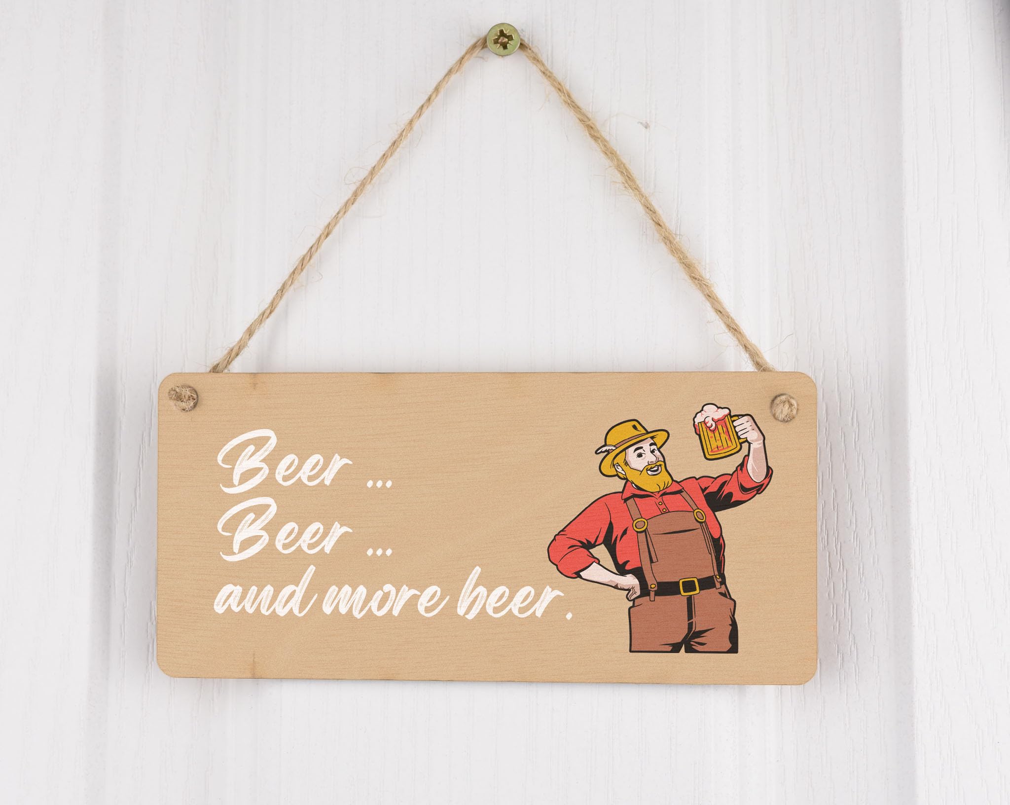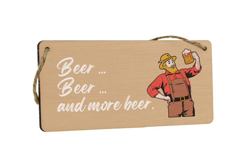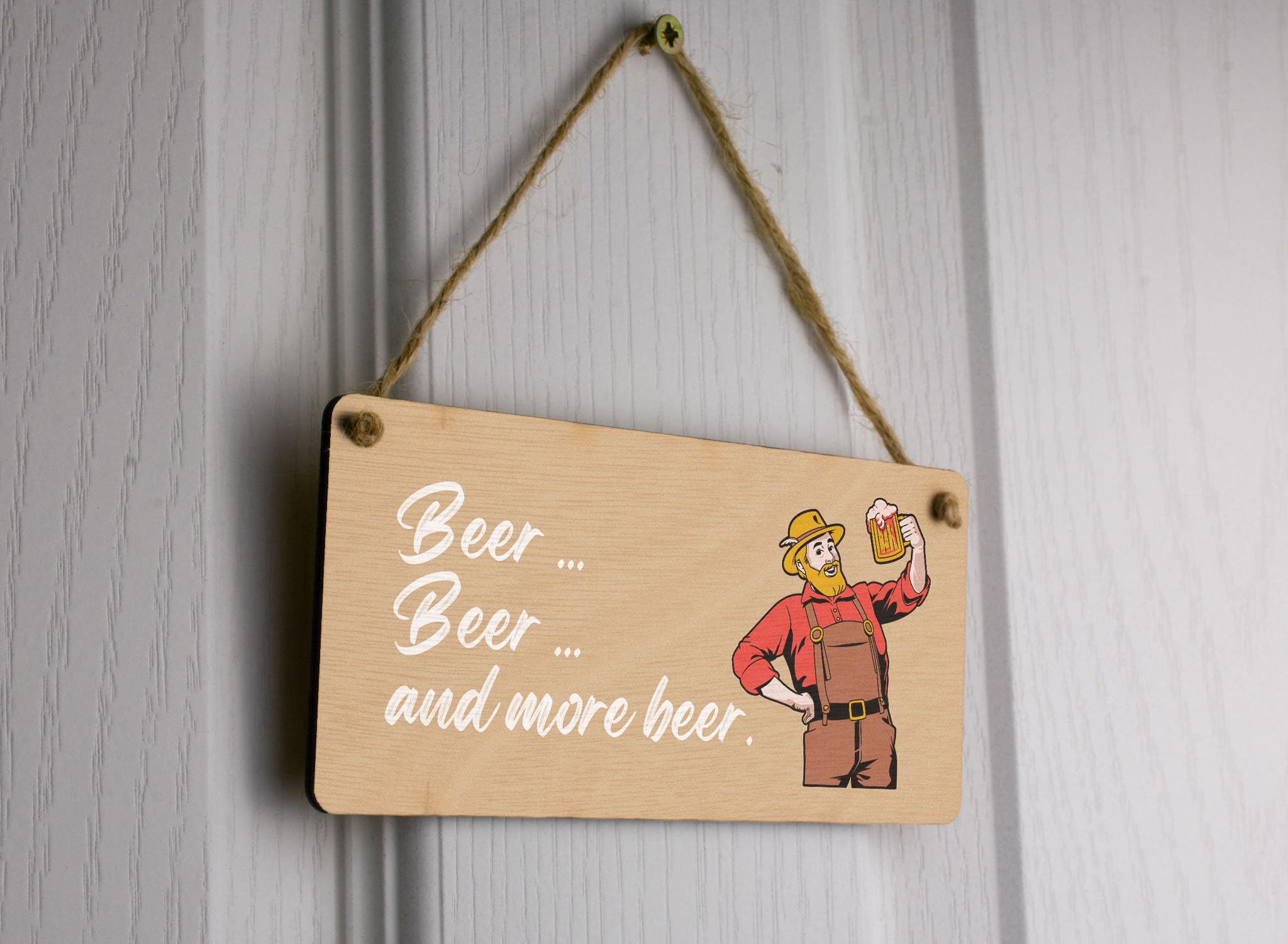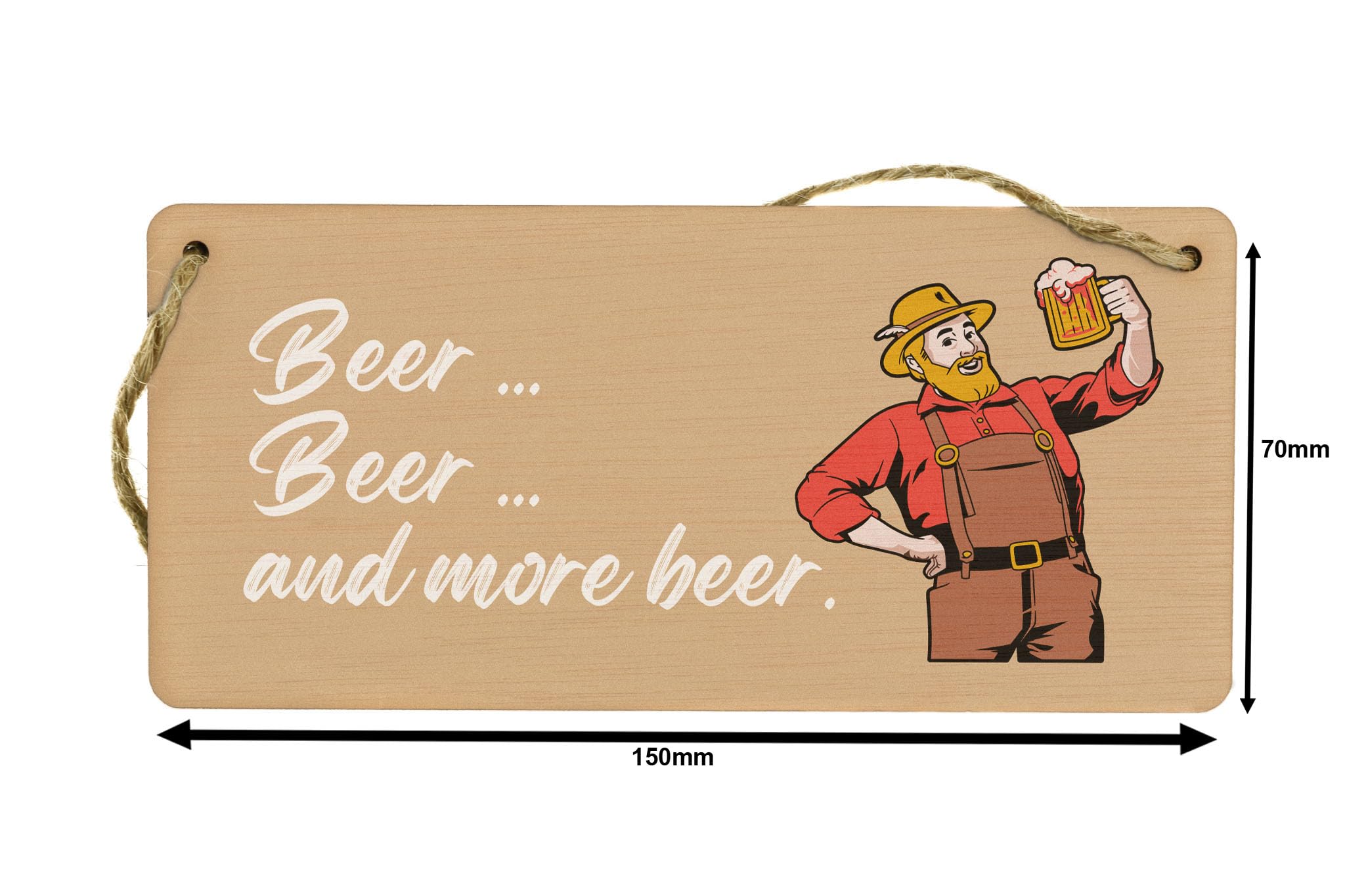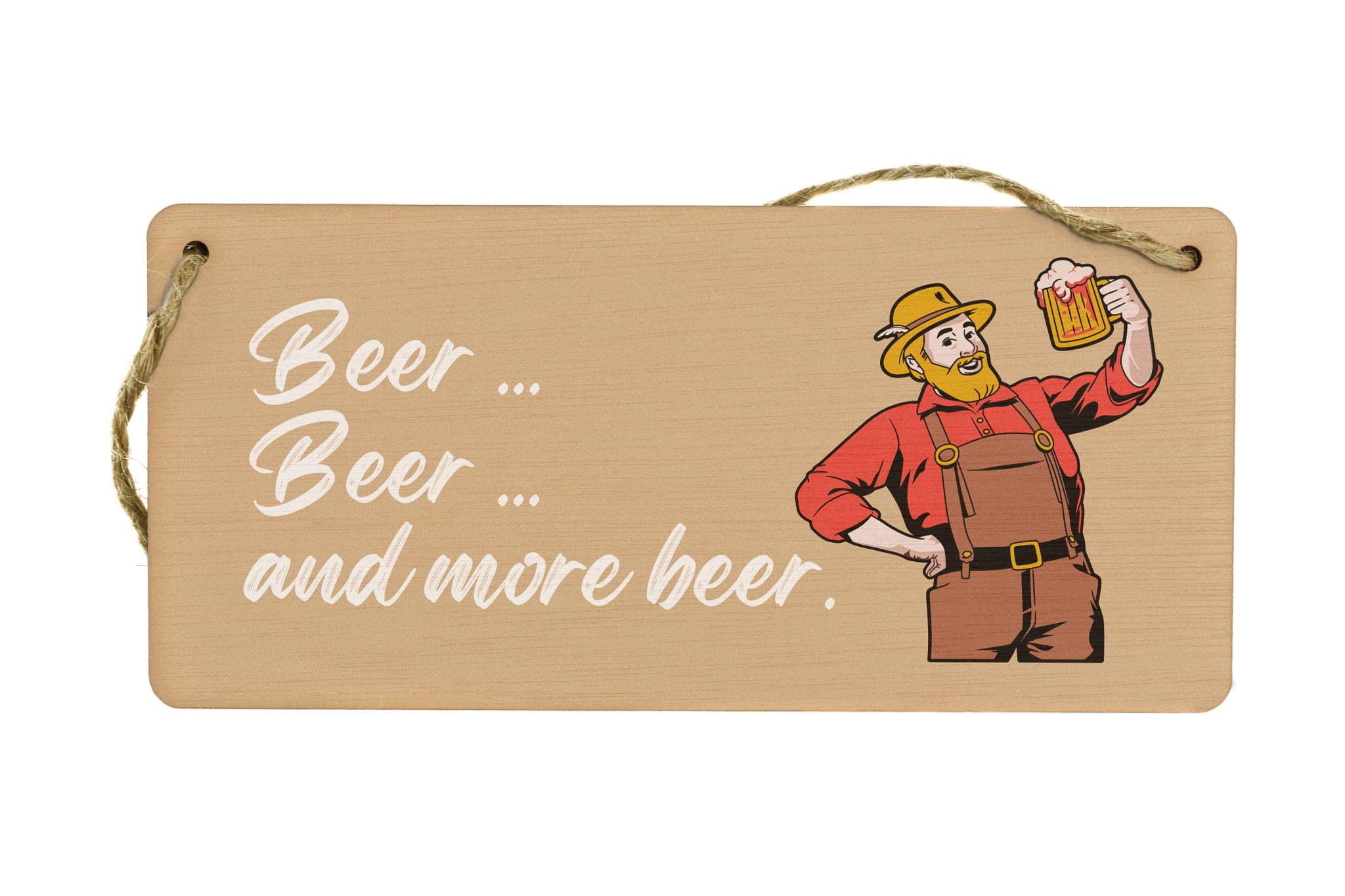 - Sign reads 'beer beer and more beer' - a playful and humorous addition to your home