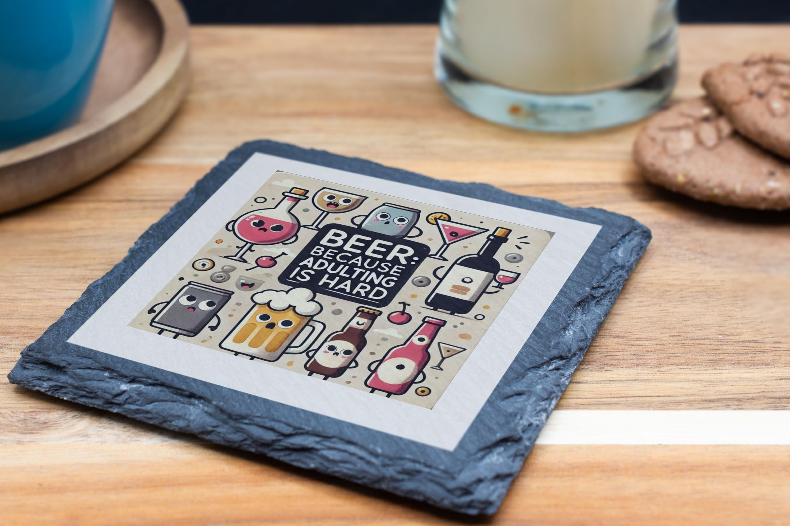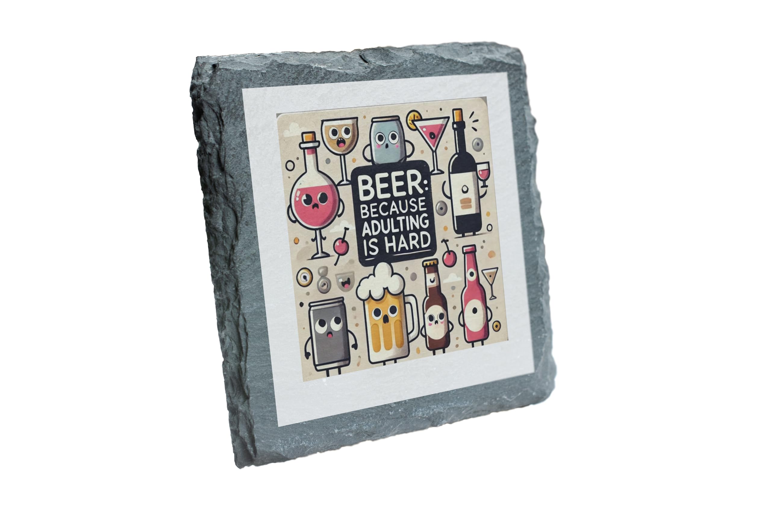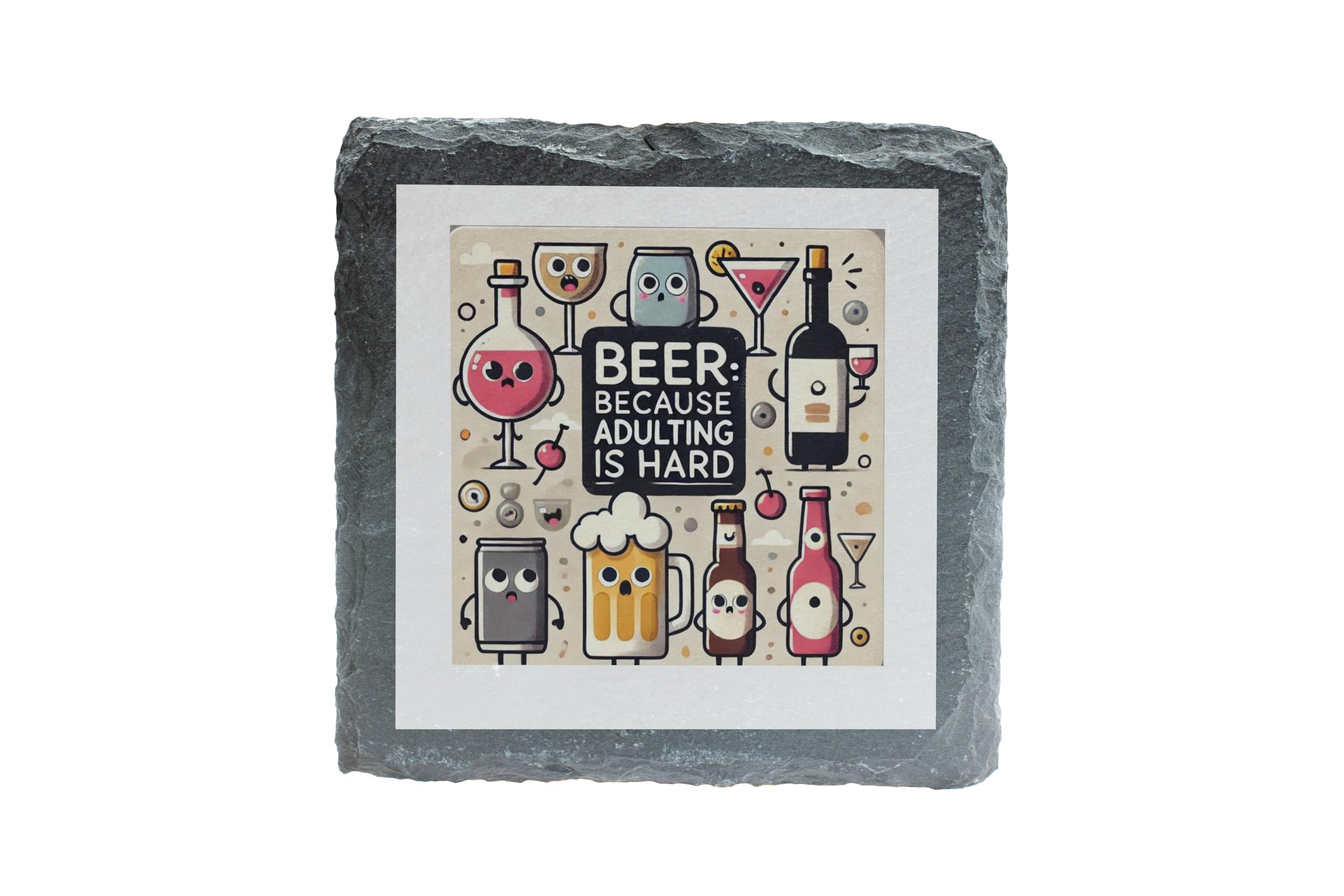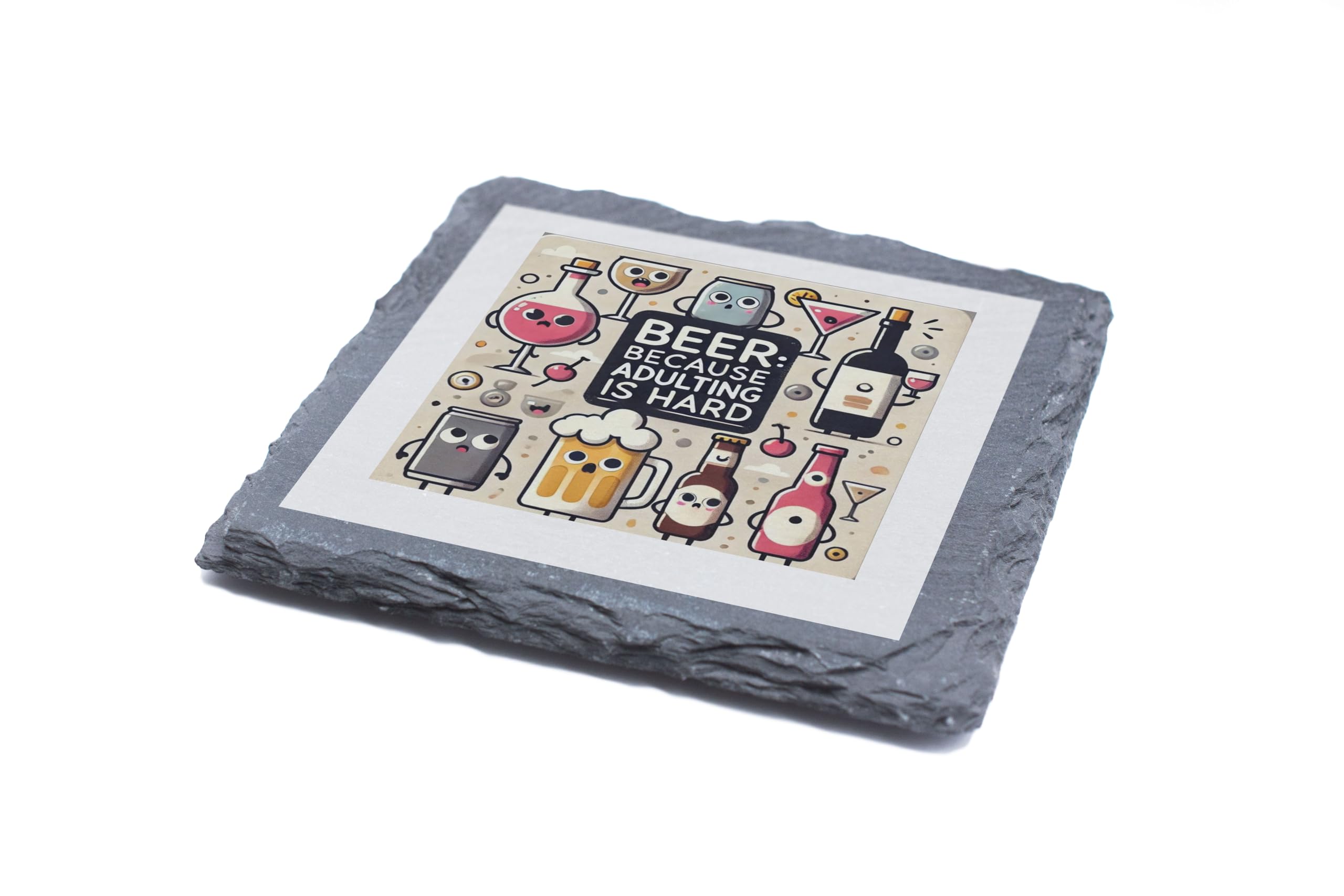 Celebrate life's little struggles with humor and style using the "Beer: Because Adulting is Hard" Slate Coaster. Crafted from natural slate, this coaster is both functional and fun, offering a unique way to protect your furniture while showcasing your personality. The vibrant and whimsical design features adorable drink characters and the relatable phrase "Adulting is Hard," making it a perfect addition to your bar, kitchen, or living room. Whether you're enjoying a cold beer, a glass of wine, or your morning coffee, this versatile coaster is designed to hold it all securely while adding a touch of humor to your day. This coaster is more than just a practical item; it's a conversation starter and a delightful gift for beer enthusiasts, coworkers, or anyone who appreciates a good laugh and a good drink. Bring a smile to someone's face or enjoy it for yourself?because let's face it, adulting is hard!