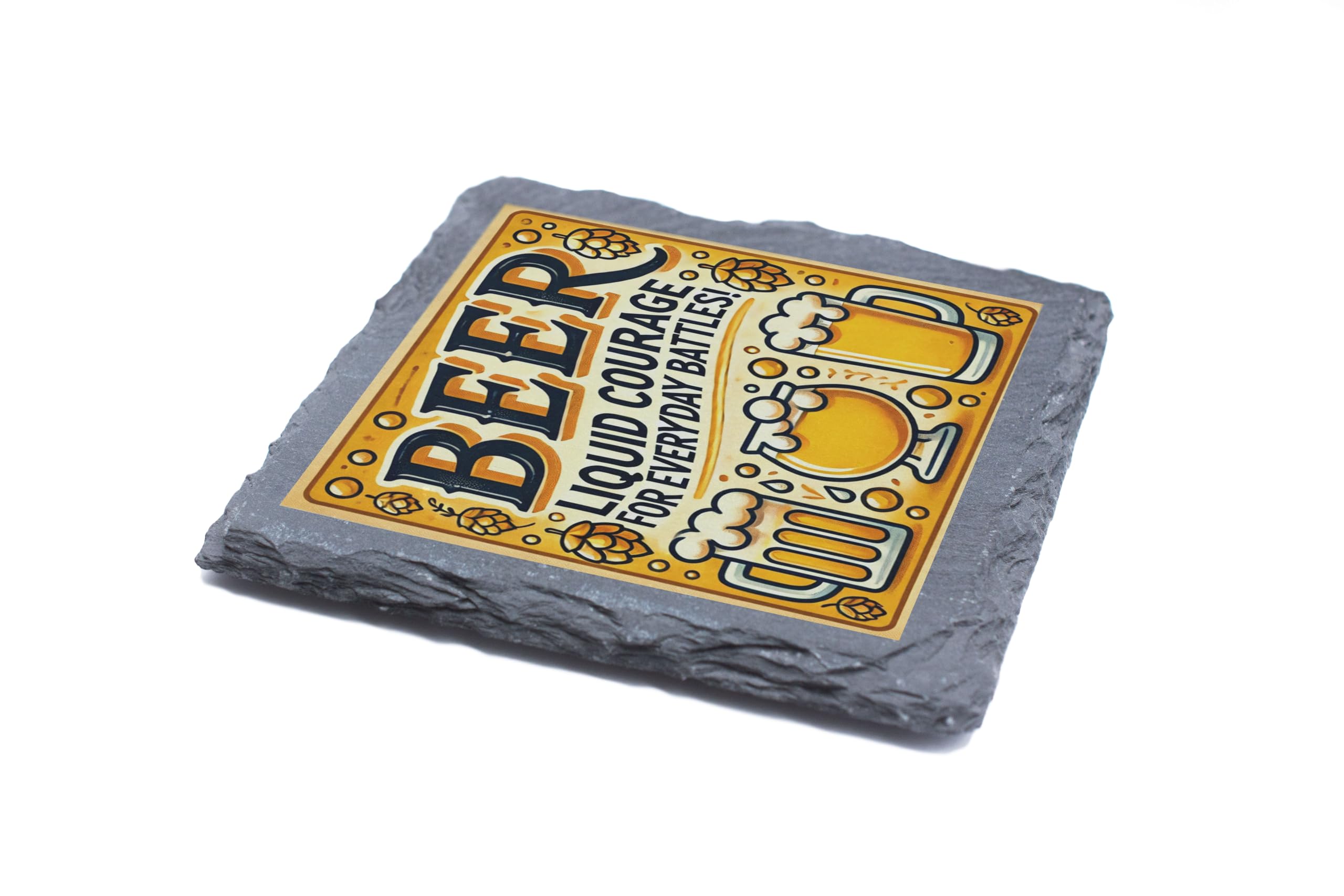 Elevate your drink game with this unique rustic slate coaster featuring the spirited phrase "Beer: Liquid Courage for Everyday Battles." The bold yellow design paired with charming beer mugs and hops adds a touch of humor and vibrance to your space. Handcrafted from natural slate, this durable coaster not only protects your surfaces but also brings character to your table setting. Whether you?re hosting a beer night or looking for the perfect gift for a beer enthusiast, this coaster is both practical and memorable. Cheers to tackling everyday battles with a pint in hand!
