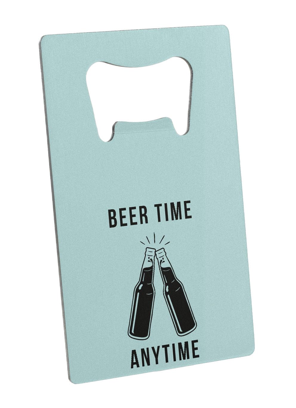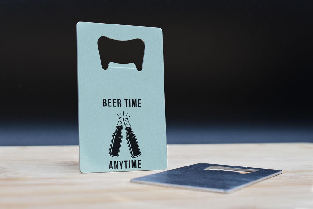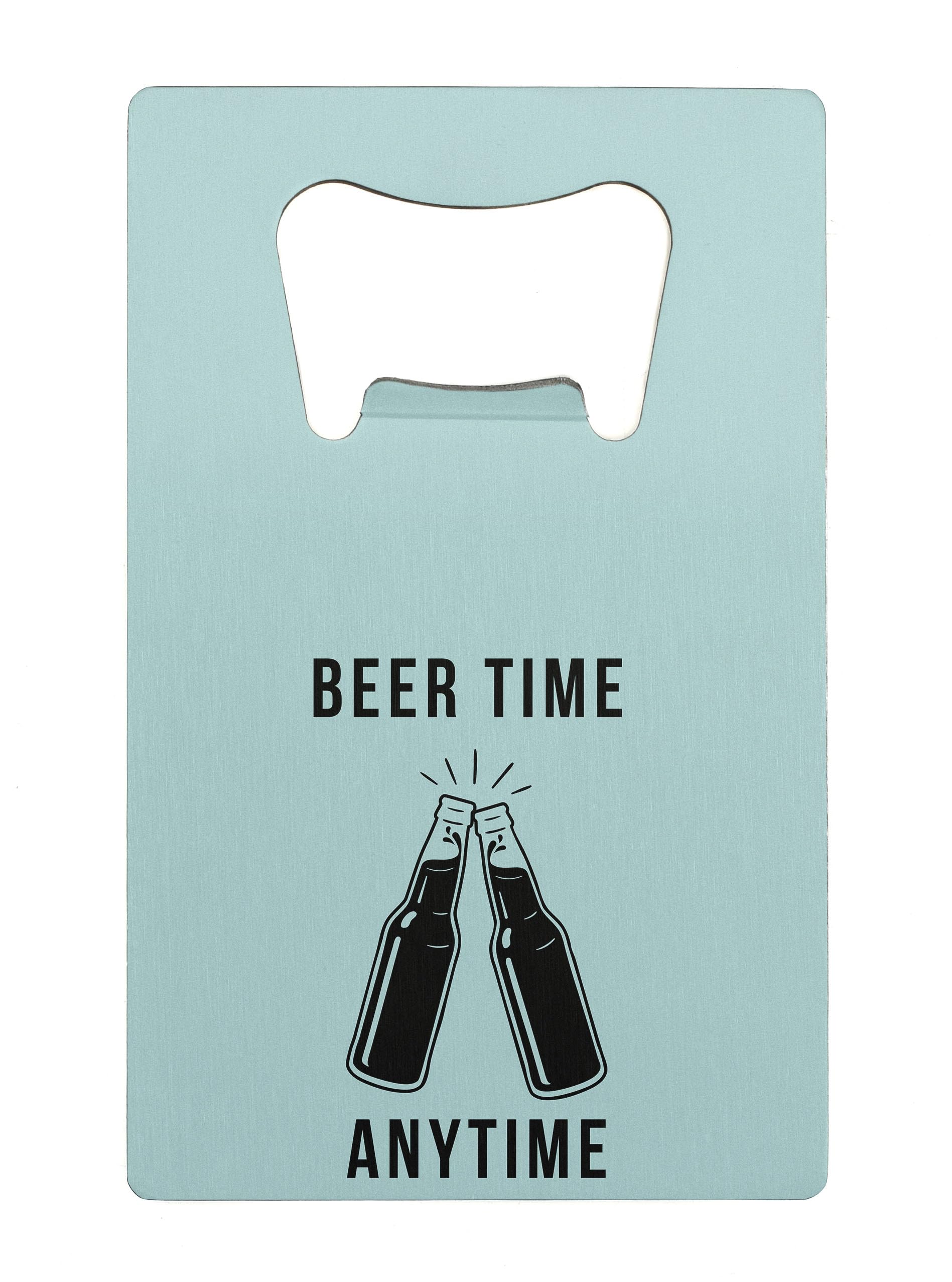 Introducing the Beer Time Anytime Novelty Bottle Opener, the ultimate beer lover's tool and party essential gadget. This Cheers-themed opener is a unique bar tool that adds a touch of fun to any social gathering or event. Made from quality stainless steel, this pocket-sized opener is both durable and stylish, making it the perfect beverage accessory for any beer enthusiast. The quirky design features a full color UV printed 'beer time anytime' slogan on a simple baby blue backdrop, making it a cool and fun gift for beer lovers everywhere. Whether you're hosting a party or just enjoying a casual drink, this portable bottle opener is sure to become your go-to anytime drink tool.