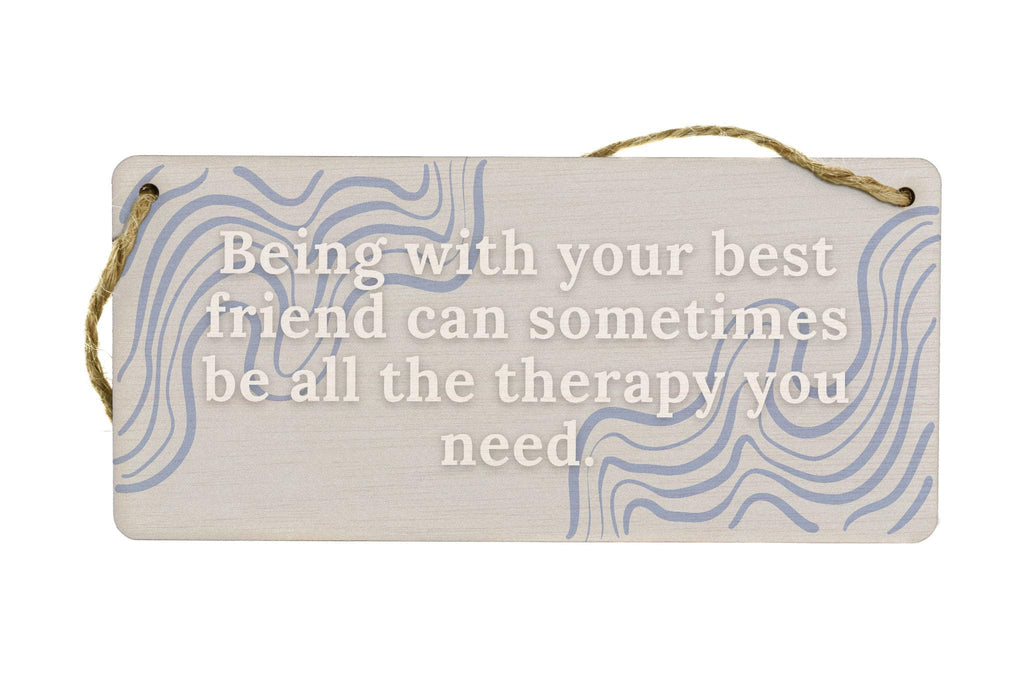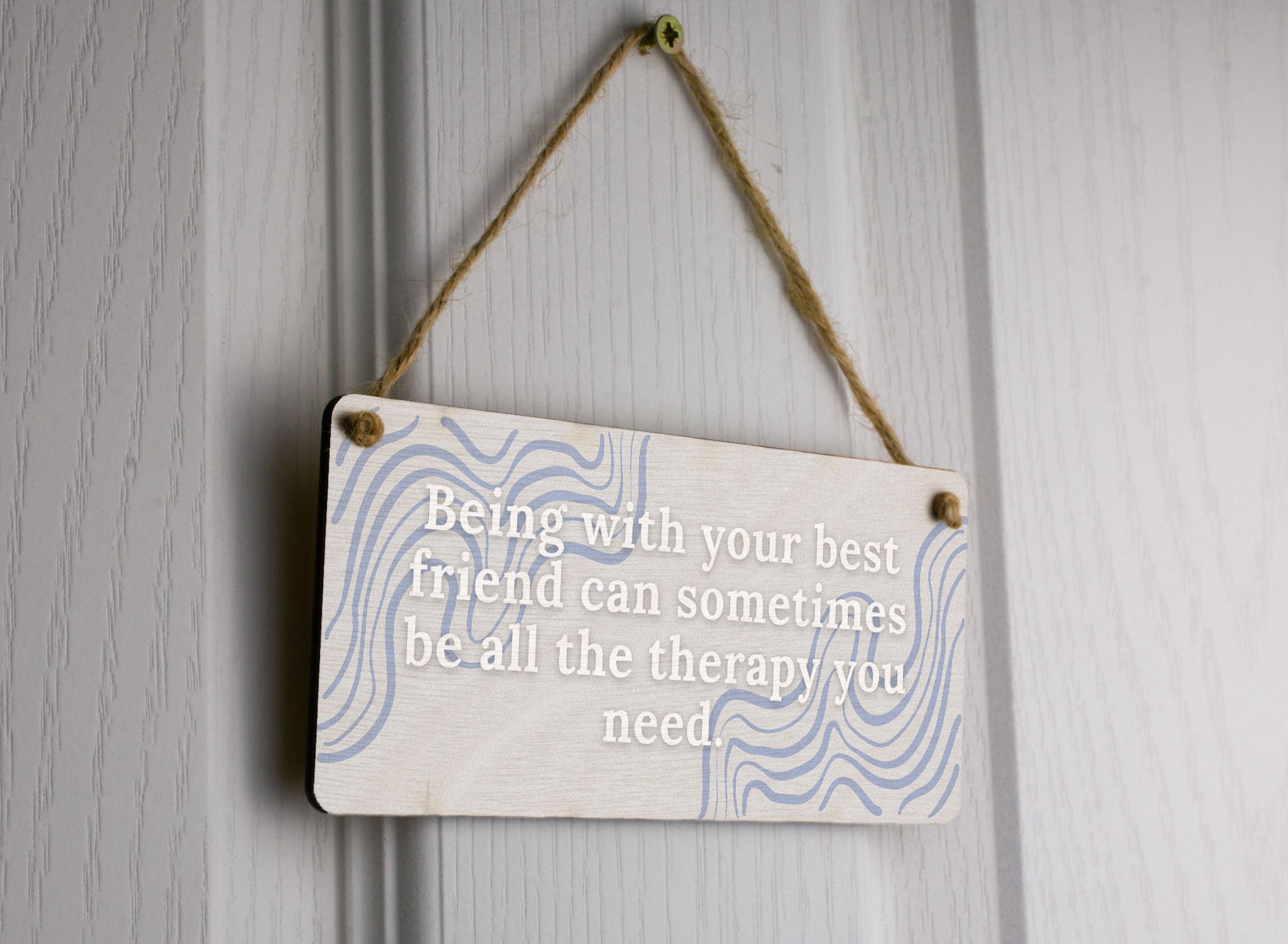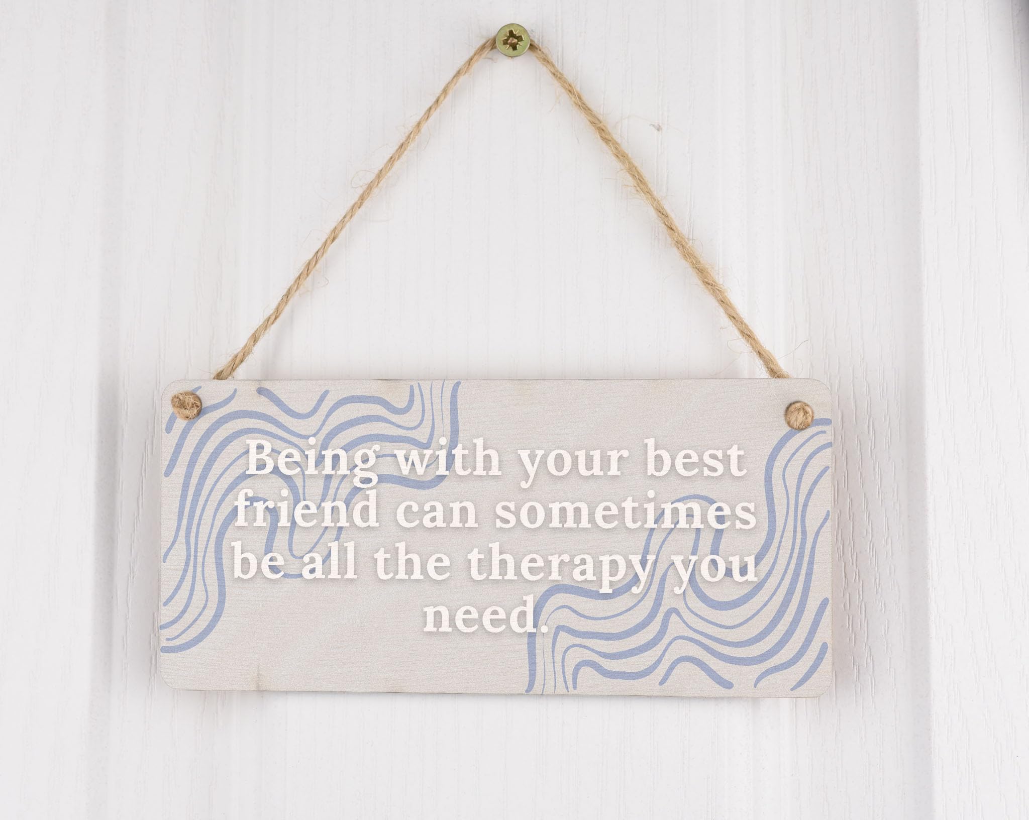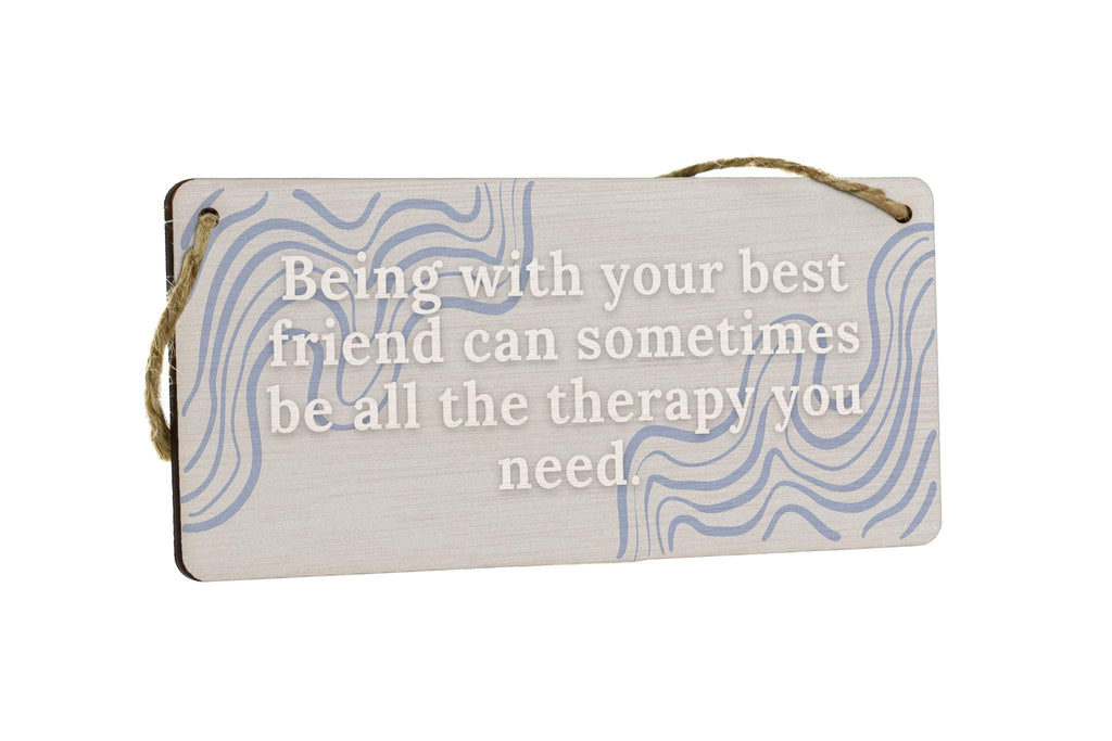The Best Friend Therapy Wooden Hanging Sign is the perfect addition to any home wall decor. This inspirational wall art is a small hanging plaque made of handcrafted laser cut plywood. The UV printed design features an uplifting message that reads 'being with your best friend can sometimes be all the therapy you need'. The full color printed sign shows a simple yet eye-catching text based design with a heartfelt message, making it a great novelty friendship gift or gift for your best friend. The sign comes with twine included for easy hanging and is sure to bring positive vibes and motivational energy to any room.
