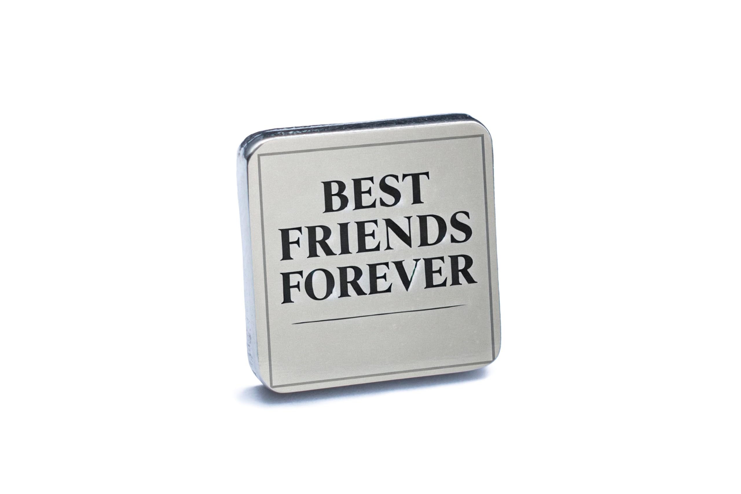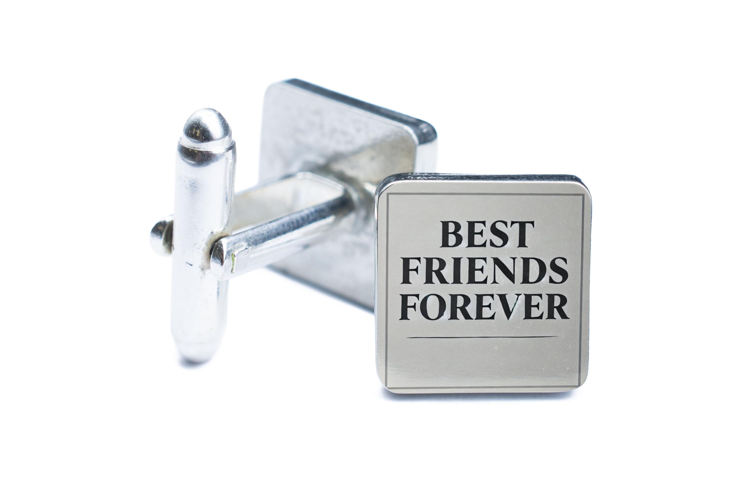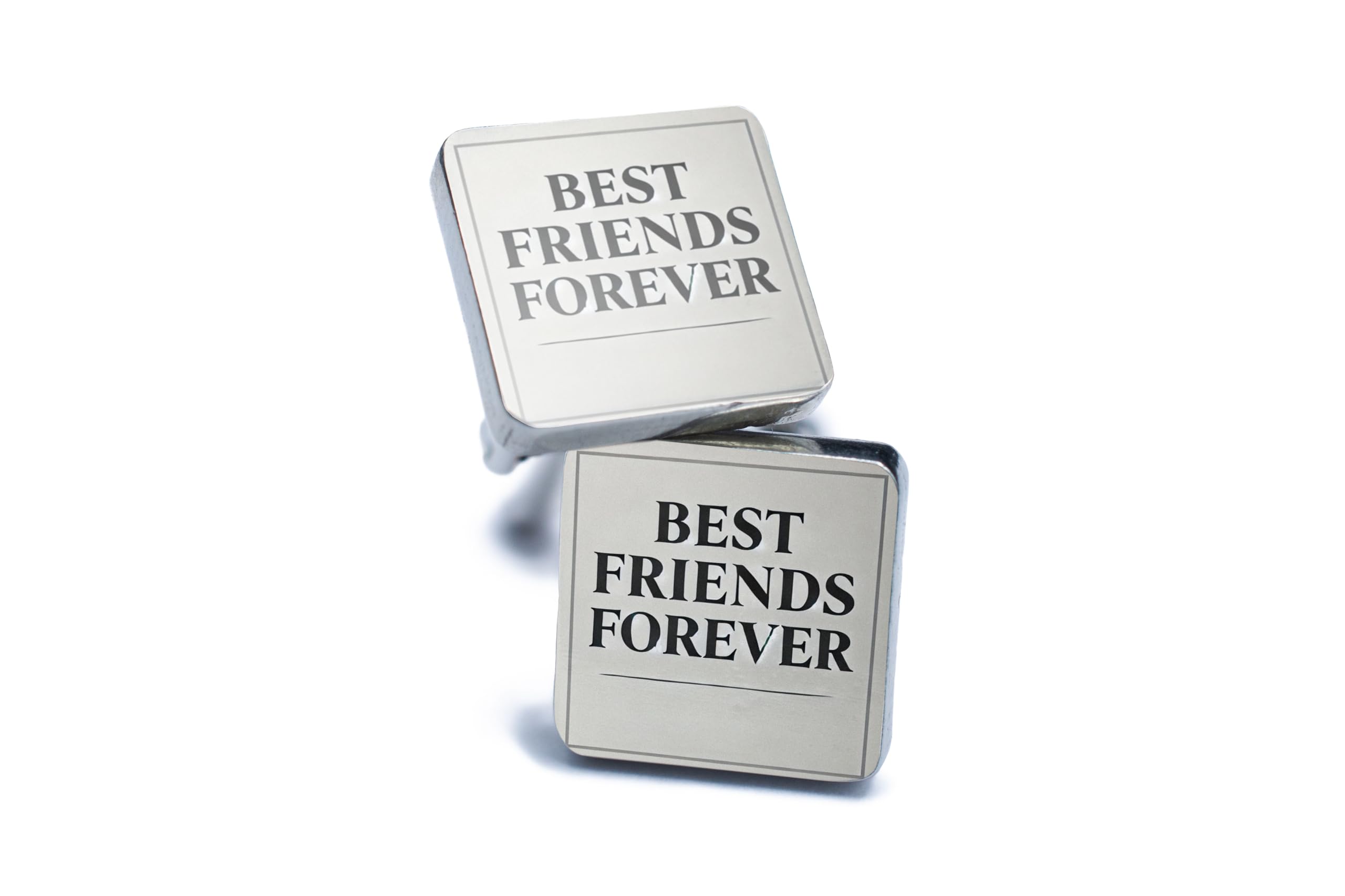 Show your appreciation for a cherished friendship with these "Best Friends Forever" cufflinks. Featuring a classic silver-tone finish and bold black lettering, this accessory is a heartfelt token that speaks volumes. Whether it's for a birthday, a graduation, or a memorable event, these cufflinks are a thoughtful way to celebrate a bond that stands the test of time. Crafted with precision and durability, they are perfect for any formal or casual outfit, adding a touch of meaning to your style. Give the gift of timeless friendship with this elegant accessory?because best friends are forever.