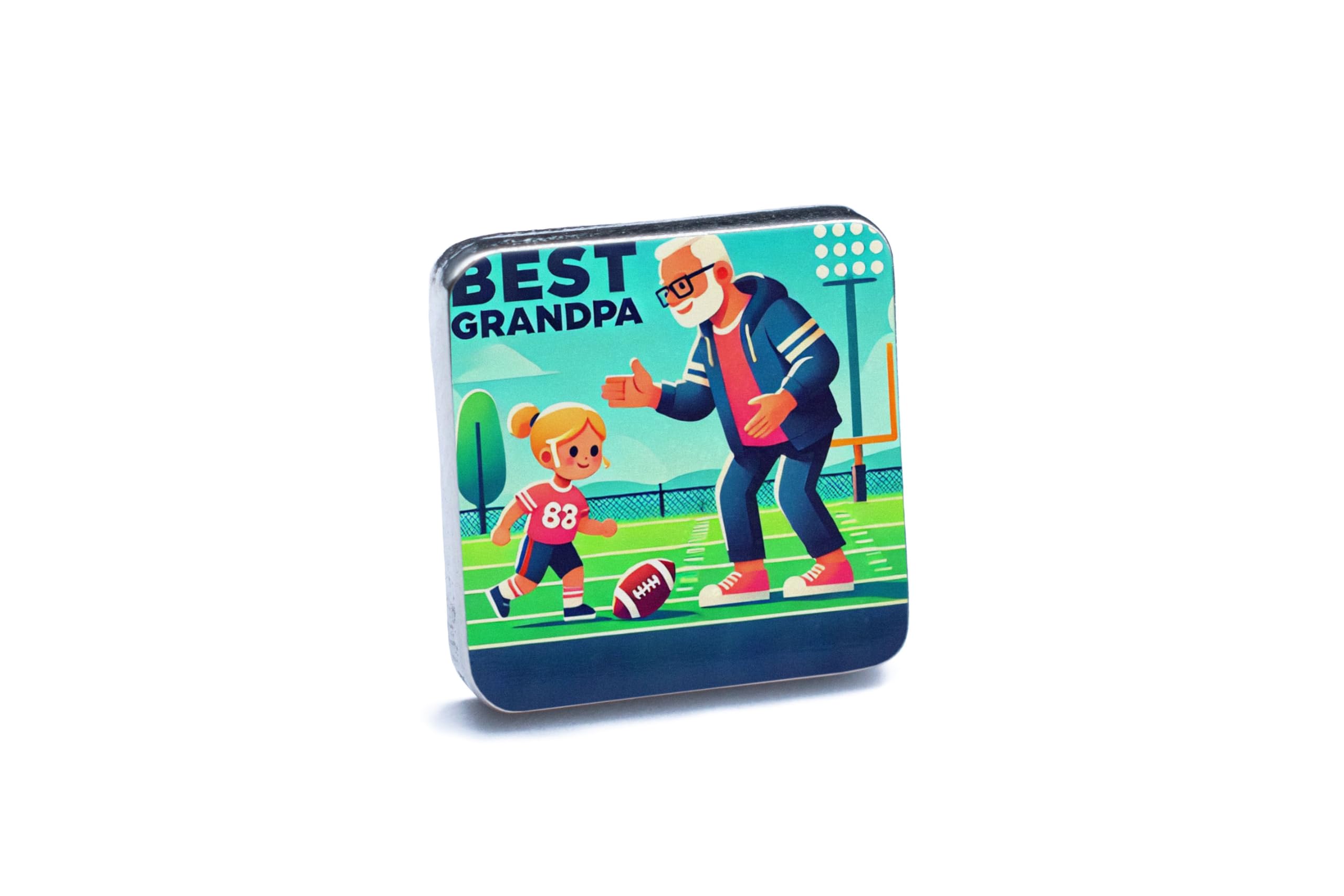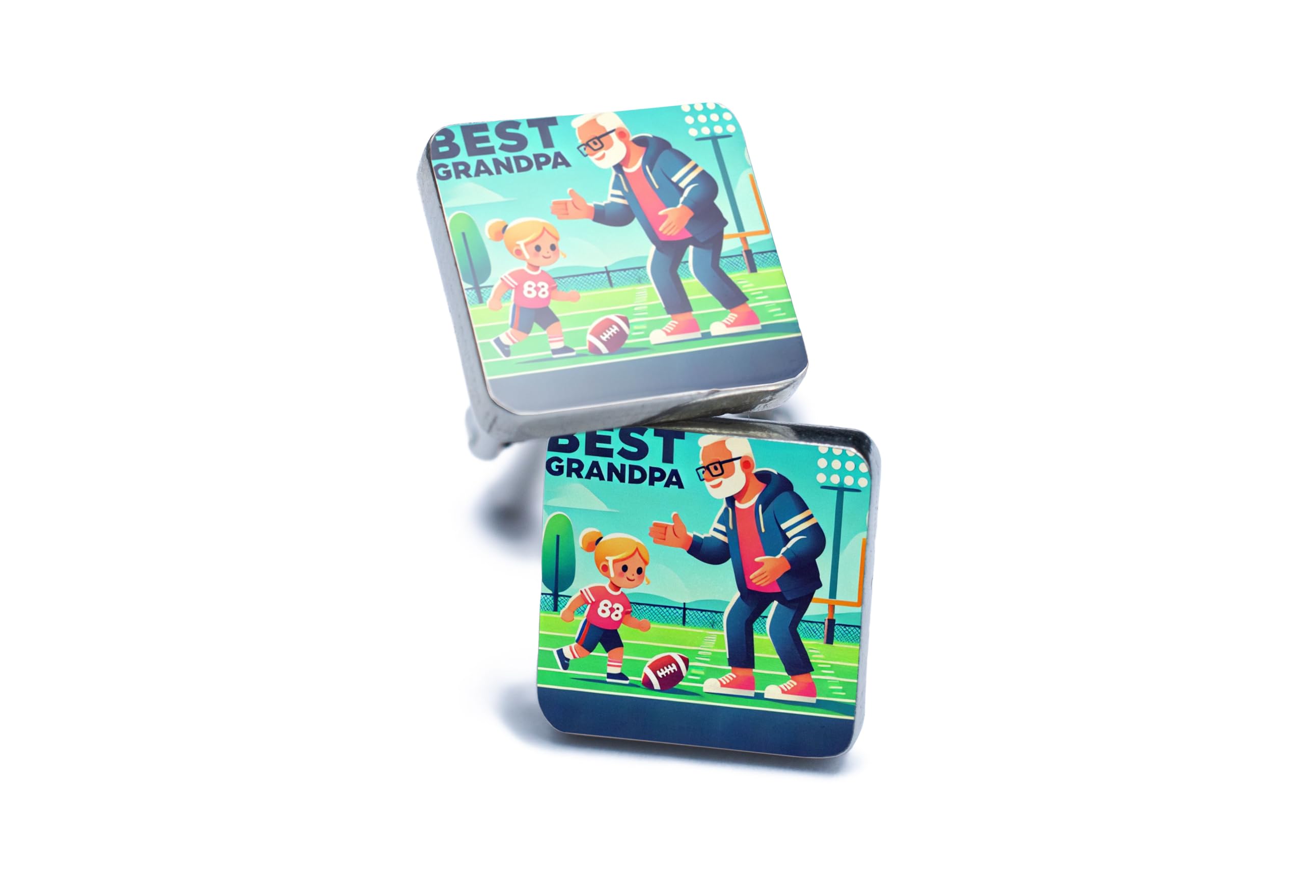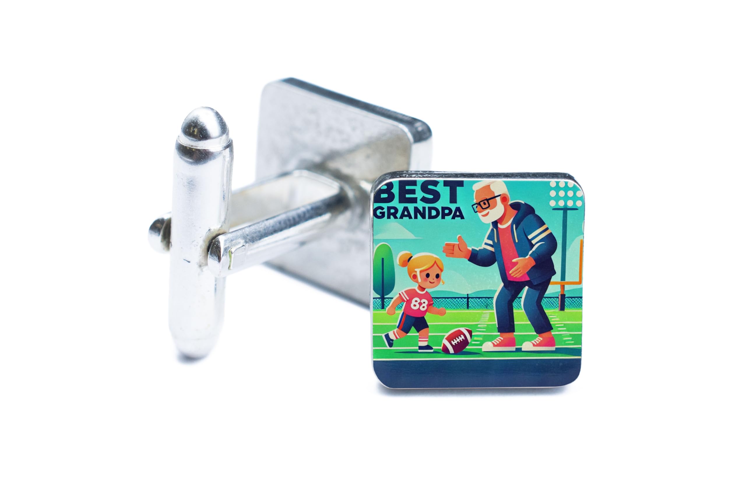 Celebrate your grandpa?s love for family and sports with these playful "Best Grandpa" cufflinks. Featuring a vibrant illustration of a grandpa playing football with his grandchild, these cufflinks capture the joy and bond shared between generations. The polished silver finish ensures a sophisticated and stylish look, perfect for formal events or casual family gatherings. Crafted with care and attention to detail, these cufflinks are a unique accessory that combines durability with sentimentality. Whether your grandpa wears them to a special event, family reunion, or just to show his pride, these cufflinks are a meaningful addition to his wardrobe. Packaged in a sleek gift box, these cufflinks are ready to delight your grandpa on Father?s Day, birthdays, or any special occasion. Show your appreciation with these heartwarming and stylish cufflinks that celebrate the "Best Grandpa" in your life!