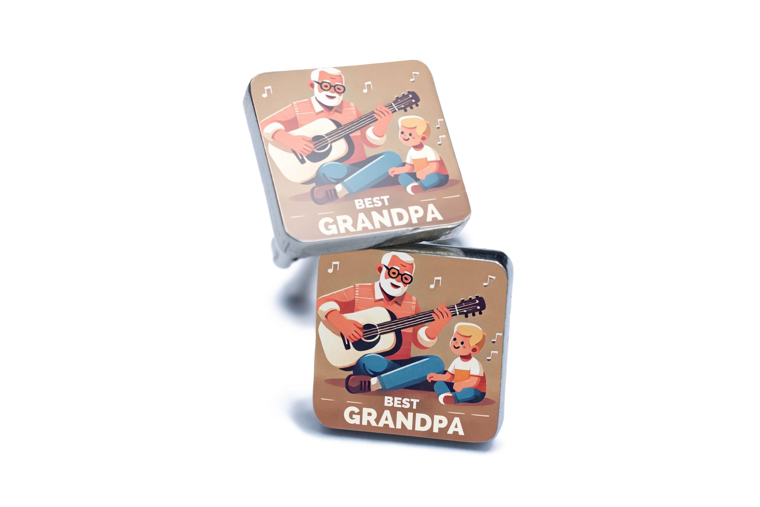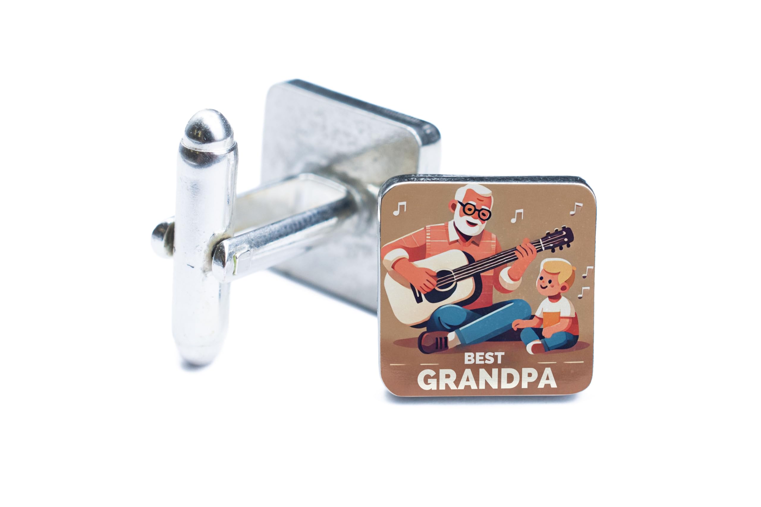 Celebrate the timeless bond between a grandfather and his grandchild with these heartwarming "Best Grandpa" guitar-themed cufflinks. The design features a vibrant and joyful illustration of a grandpa playing the guitar, creating a scene that radiates love, family, and music. A perfect accessory for grandfathers who cherish special family moments and have a passion for music. Made with premium materials and a polished silver finish, these cufflinks are durable and elegant, suitable for any occasion. Whether for a family reunion, Father's Day, or a birthday celebration, they serve as a meaningful and stylish token of appreciation. Packaged in a premium gift box, these cufflinks make gifting effortless and memorable. Show your grandpa how much he means to you with this unique and sentimental keepsake!