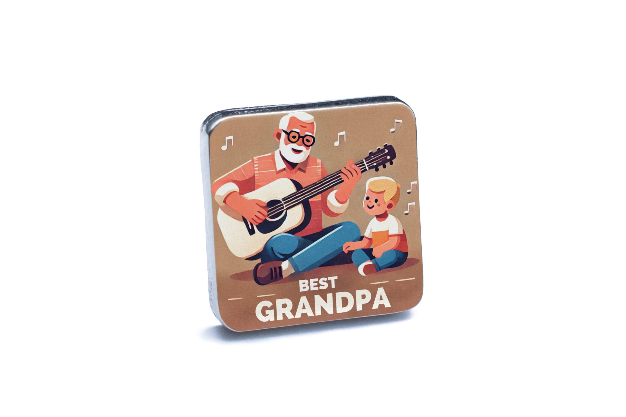 - Charming Guitar Design: Features a joyful illustration of a grandpa playing guitar with his grandchild, celebrating the warmth of family and music.