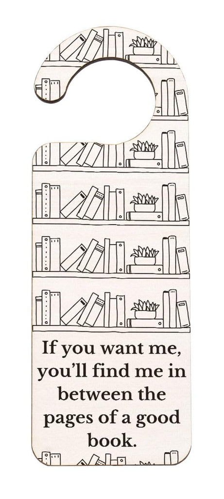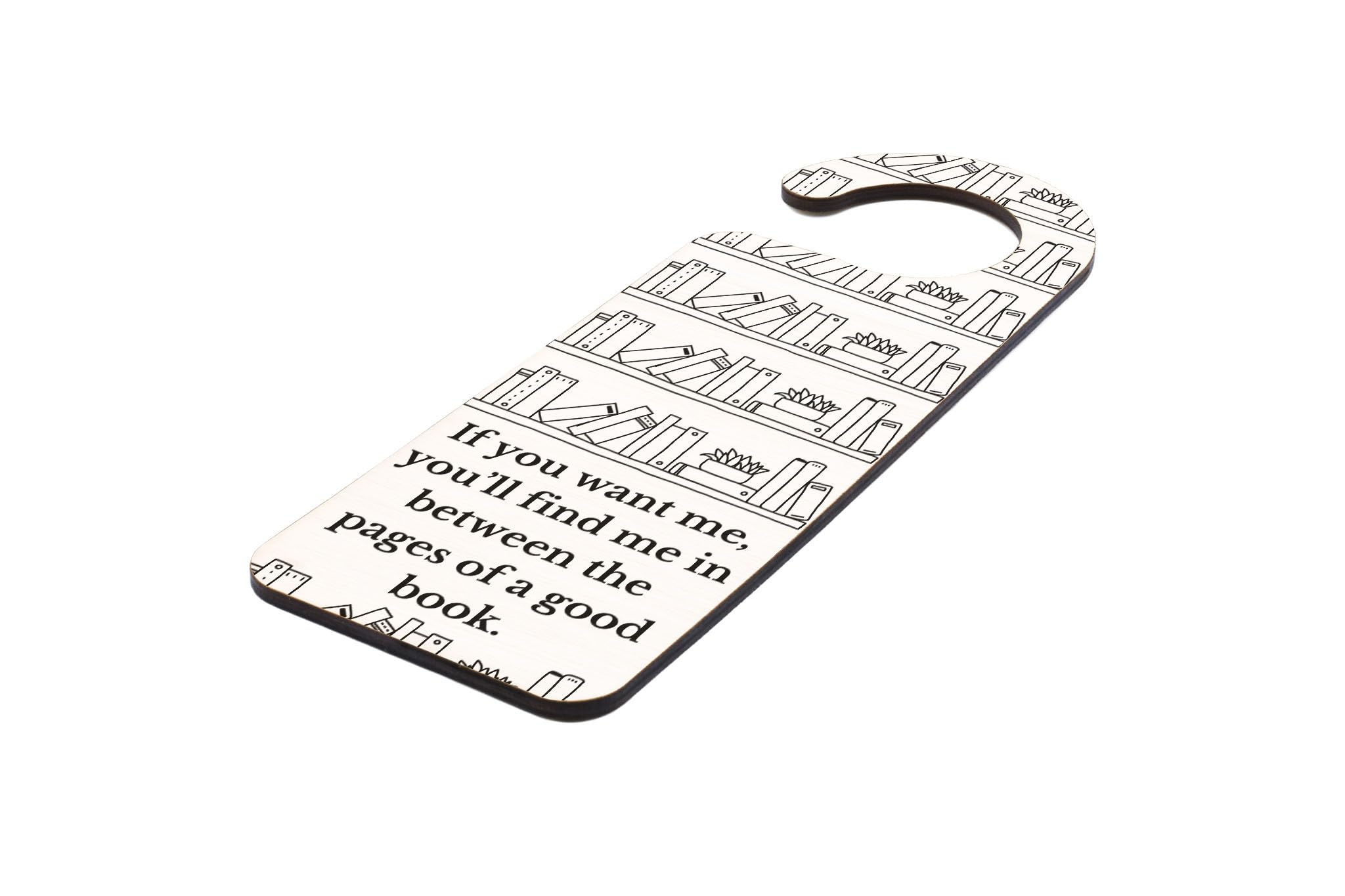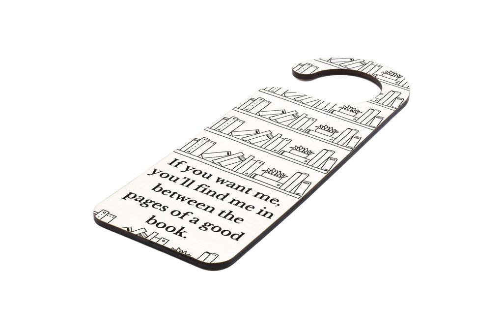 - Handmade laser cut plywood door sign with 'If you want me, you'll find me between the pages of a good book' design