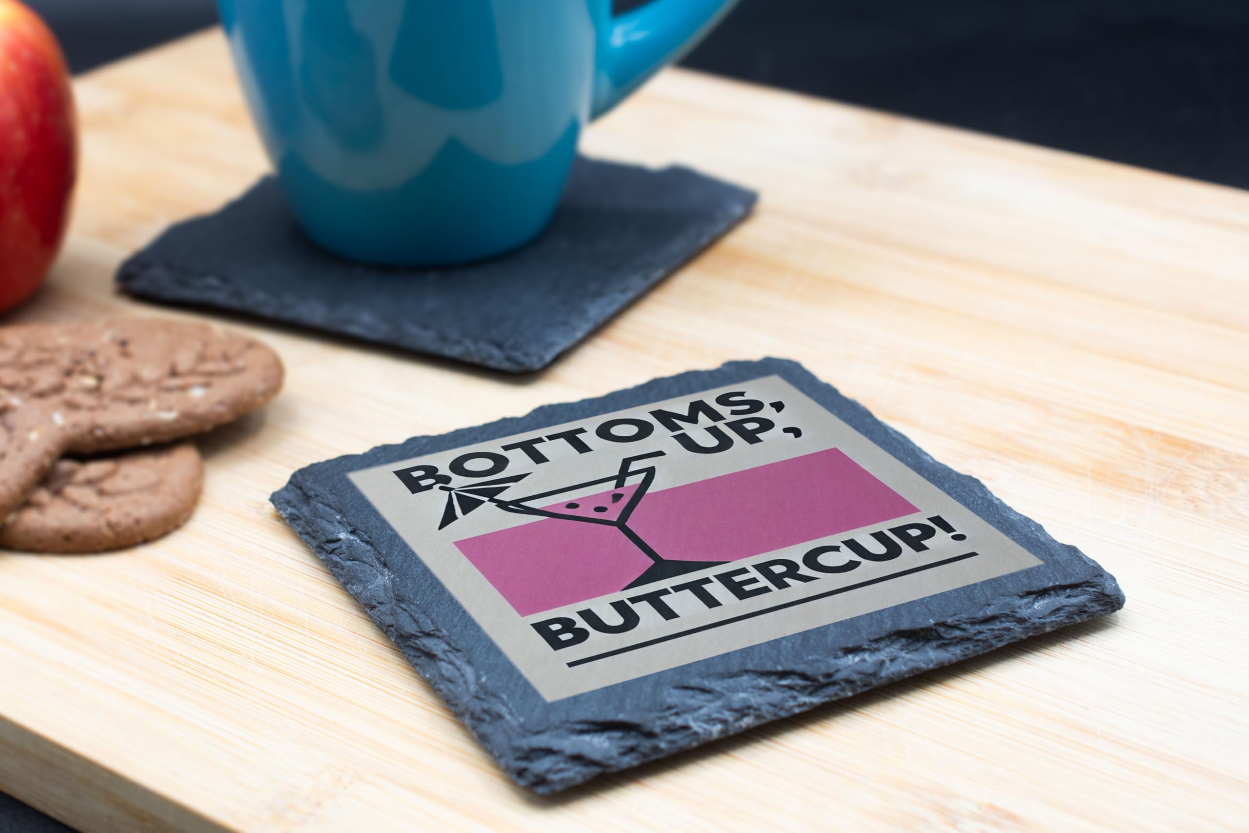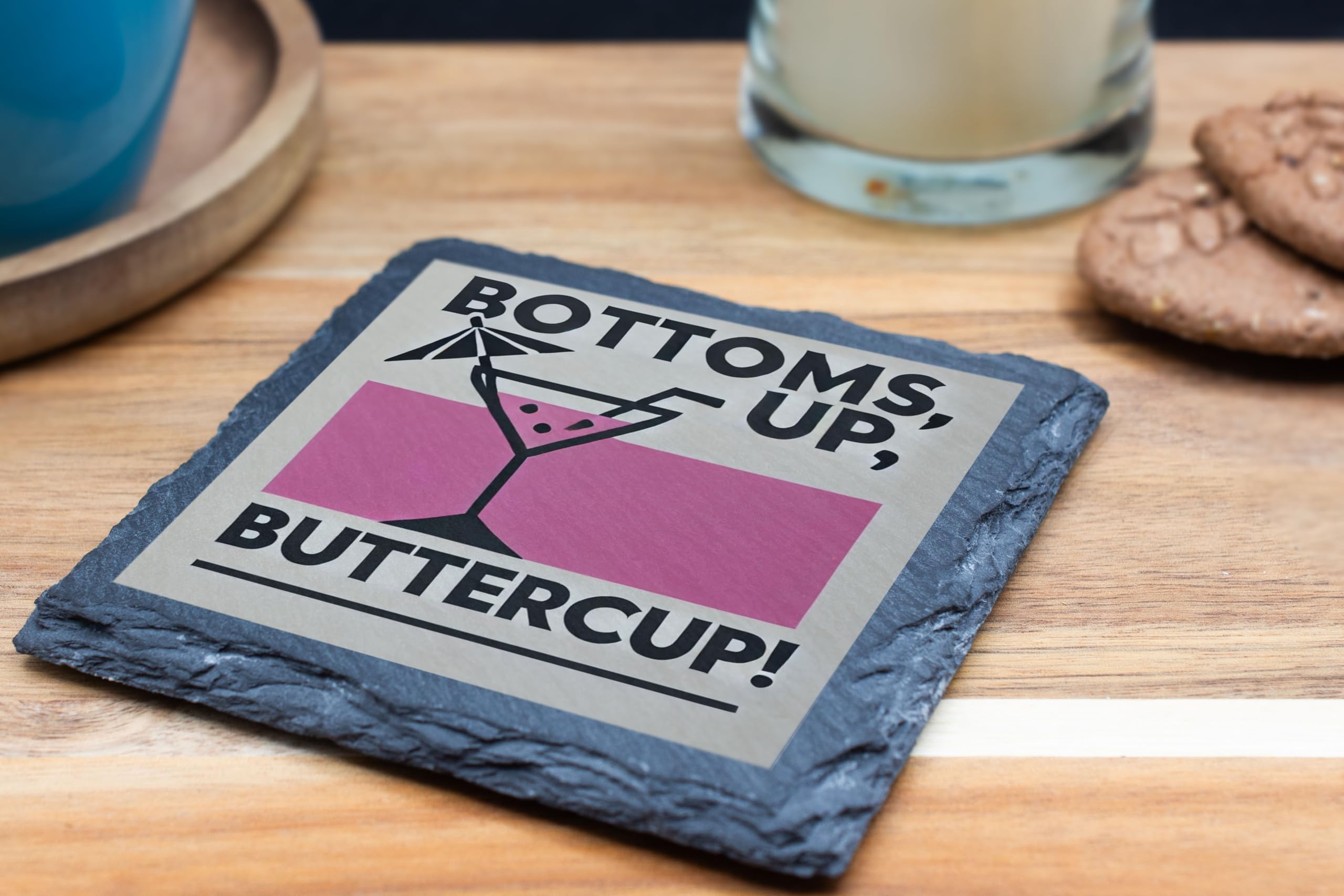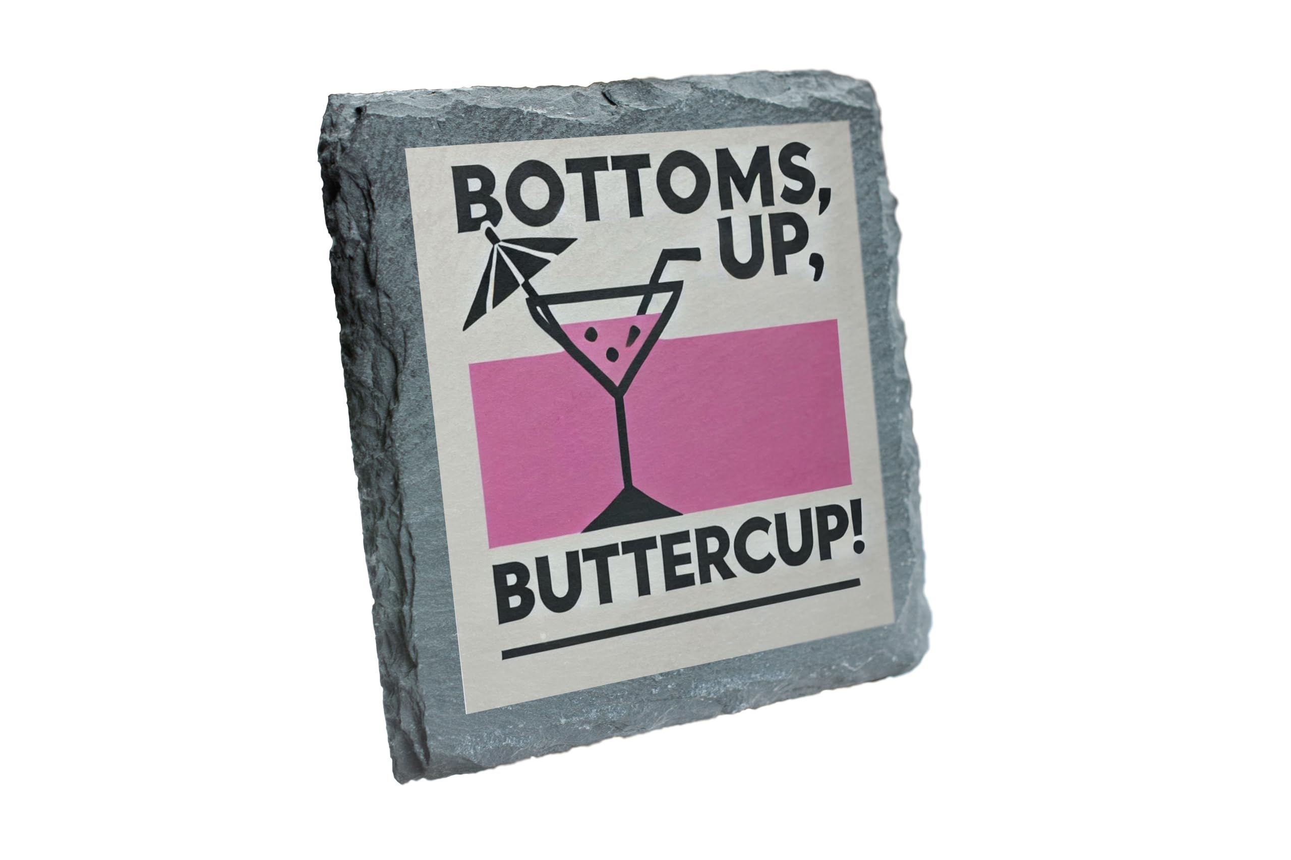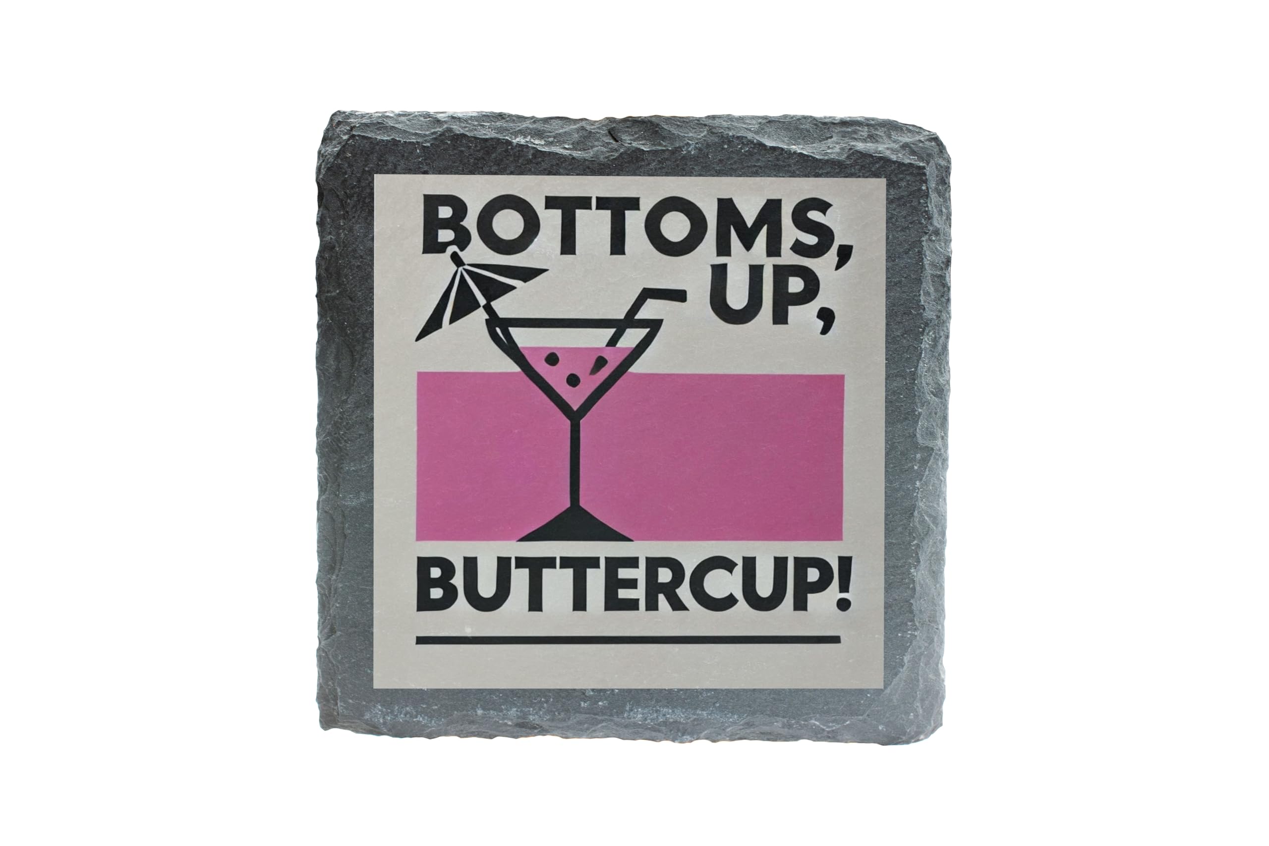 Add a splash of retro flair to your home or office with the "Bottoms Up, Buttercup!" Slate Coaster. This quirky and stylish coaster combines functionality with personality, making it a must-have for protecting your surfaces while showcasing your love for all things fun and fabulous. Crafted from premium slate, this coaster is durable, easy to clean, and perfect for any beverage ? whether it?s a sophisticated cocktail or a simple glass of water. It also makes for a great gift idea for anyone who loves a touch of humor in their decor. Cheers to good vibes and great drinks!