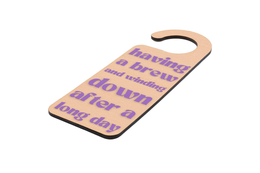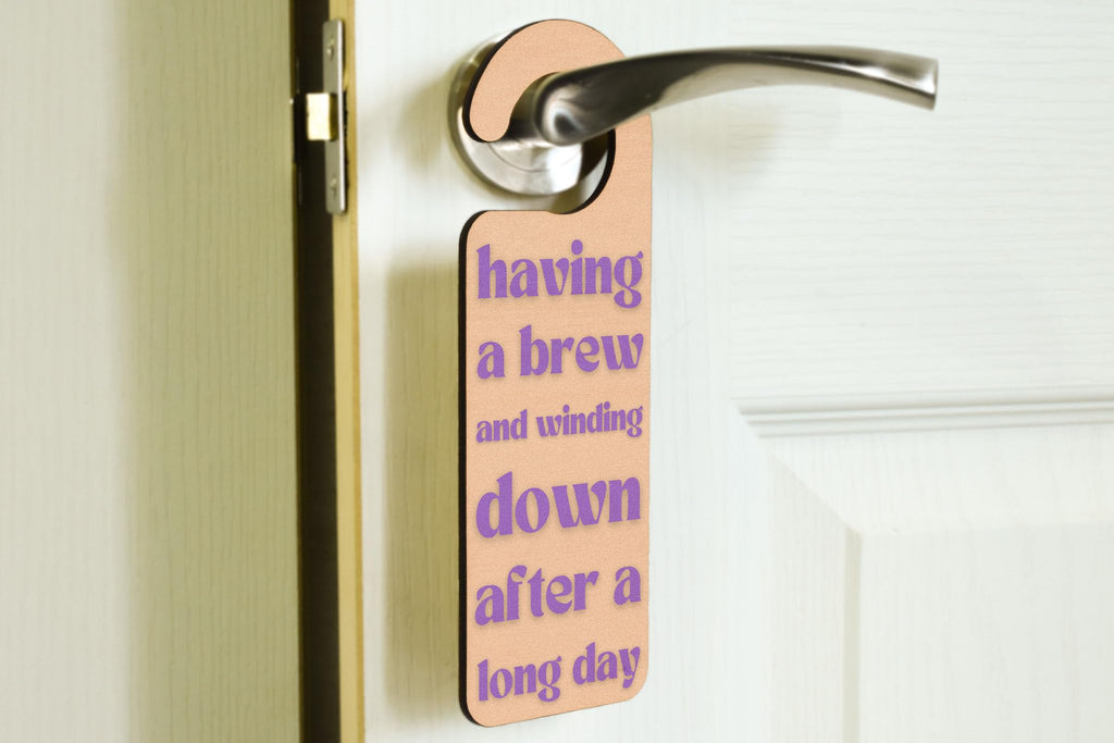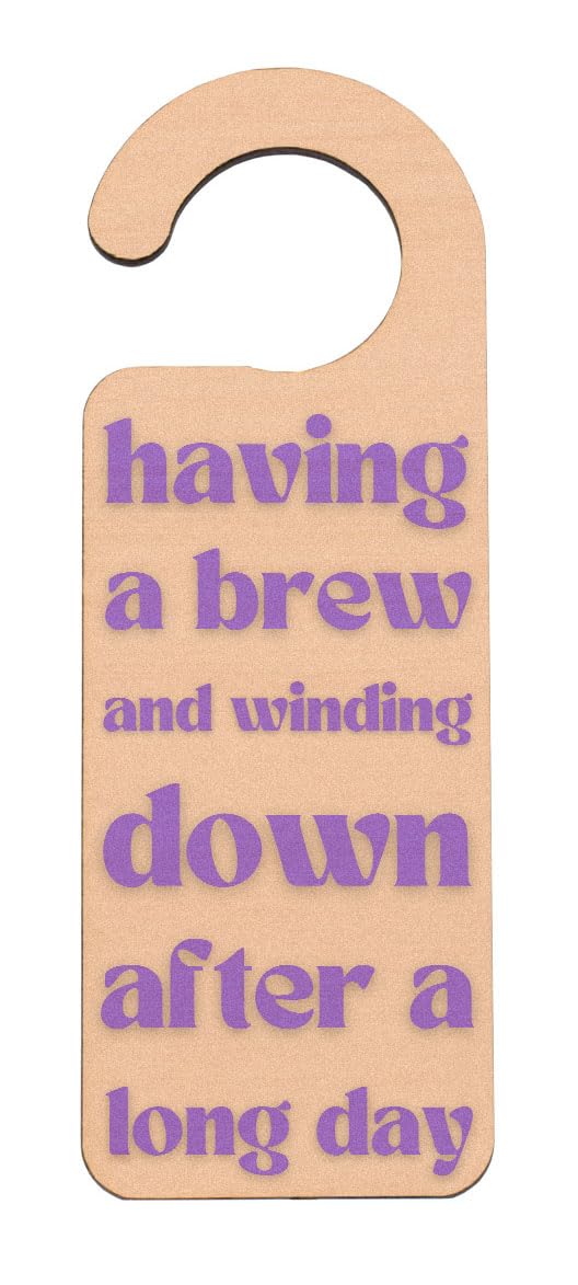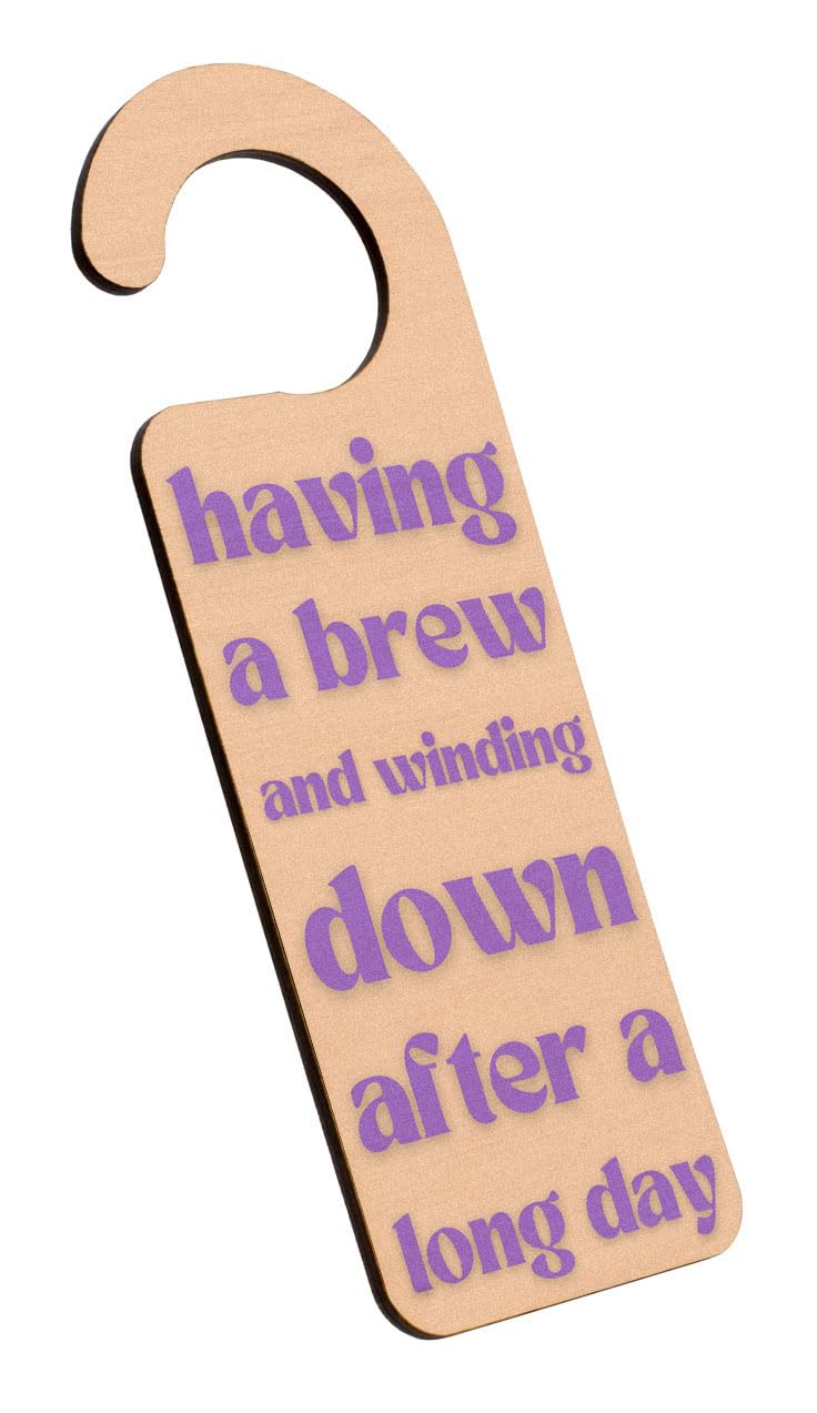 The Brew Time Relaxation Sign is the perfect addition to your home or office space for winding down after a long day. Handcrafted from laser cut plywood, this door hanger features a charming orange and purple graphic design that reads 'having a brew and winding down after a long day'. This full color sign is ideal for creating a tranquil and peaceful moment for yourself to enjoy a tea break, resting period, or beverage break. Hang it on your door to signify the end of the work day and prioritise some quiet time for yourself to unwind and destress. This sign is a great way to establish a calm zone in your surroundings and create a chill time for relaxation.