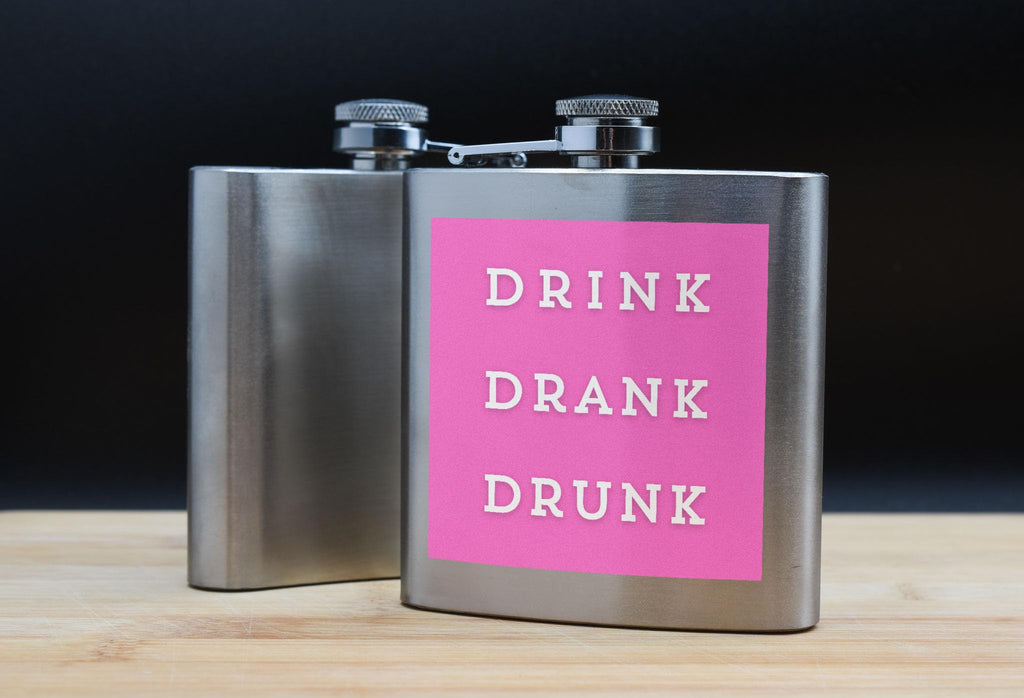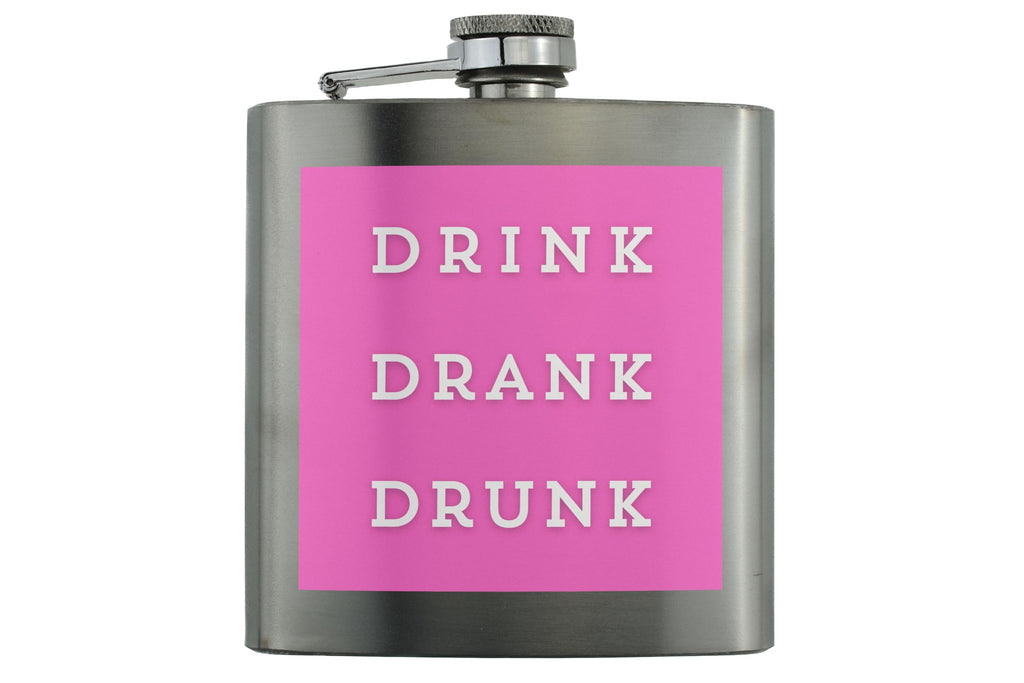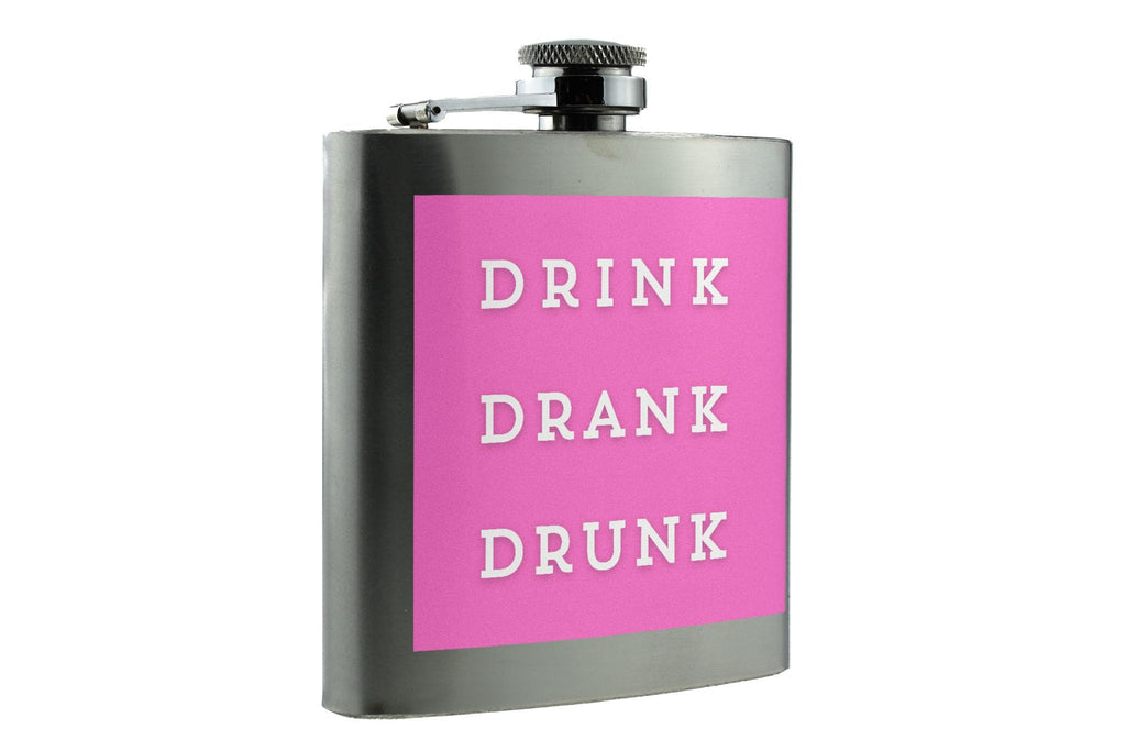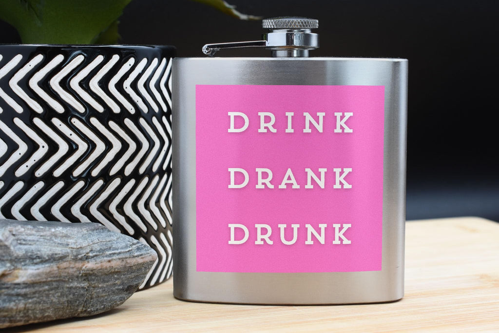 Introducing our Bright Pink 'Drink Drank Drunk' Stainless Steel Drinking Flask, the perfect addition to your next party or celebration! This fun and humorous flask features a bold text design in hot pink that reads 'drink drank drunk', making it a unique and eye-catching drinking accessory. Made from quality stainless steel, this portable flask is durable and perfect for enjoying your favourite beverages on the go. Whether you're looking for a gift for a friend who loves a good drink or simply want to add some humour to your own collection, this party flask is sure to impress. Add a touch of fun to your gatherings with this full colour printed flask, ideal for those who appreciate alcohol humour and enjoy unique hip flask designs.