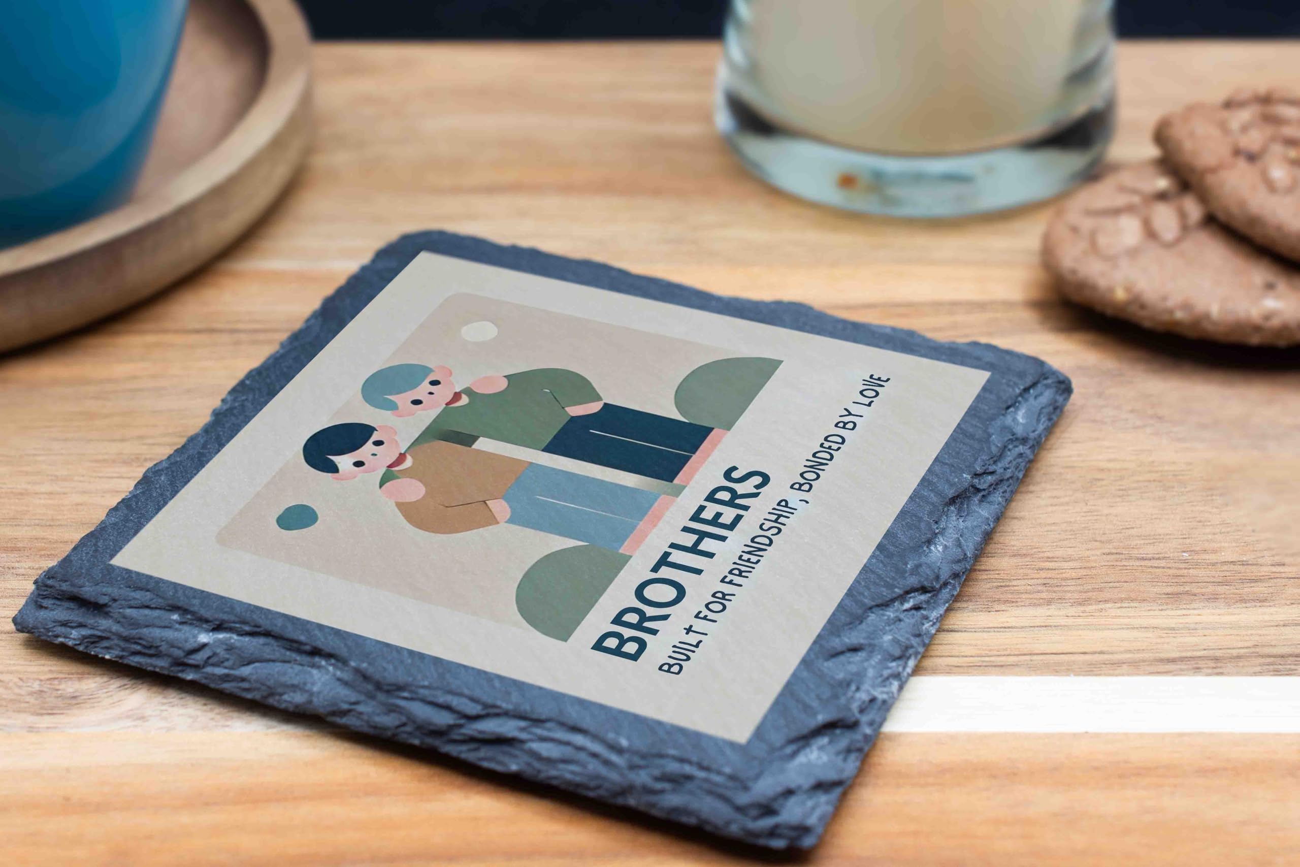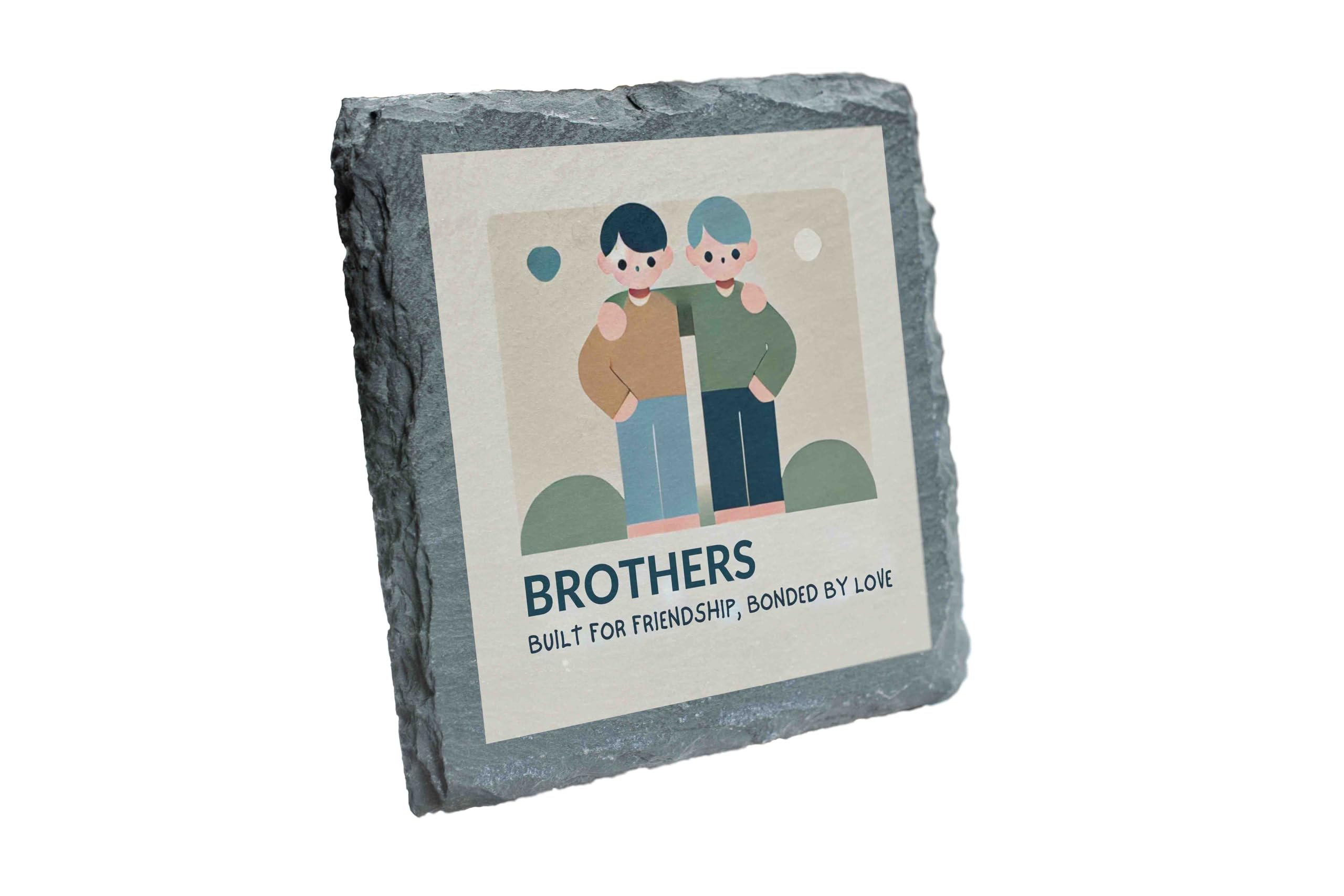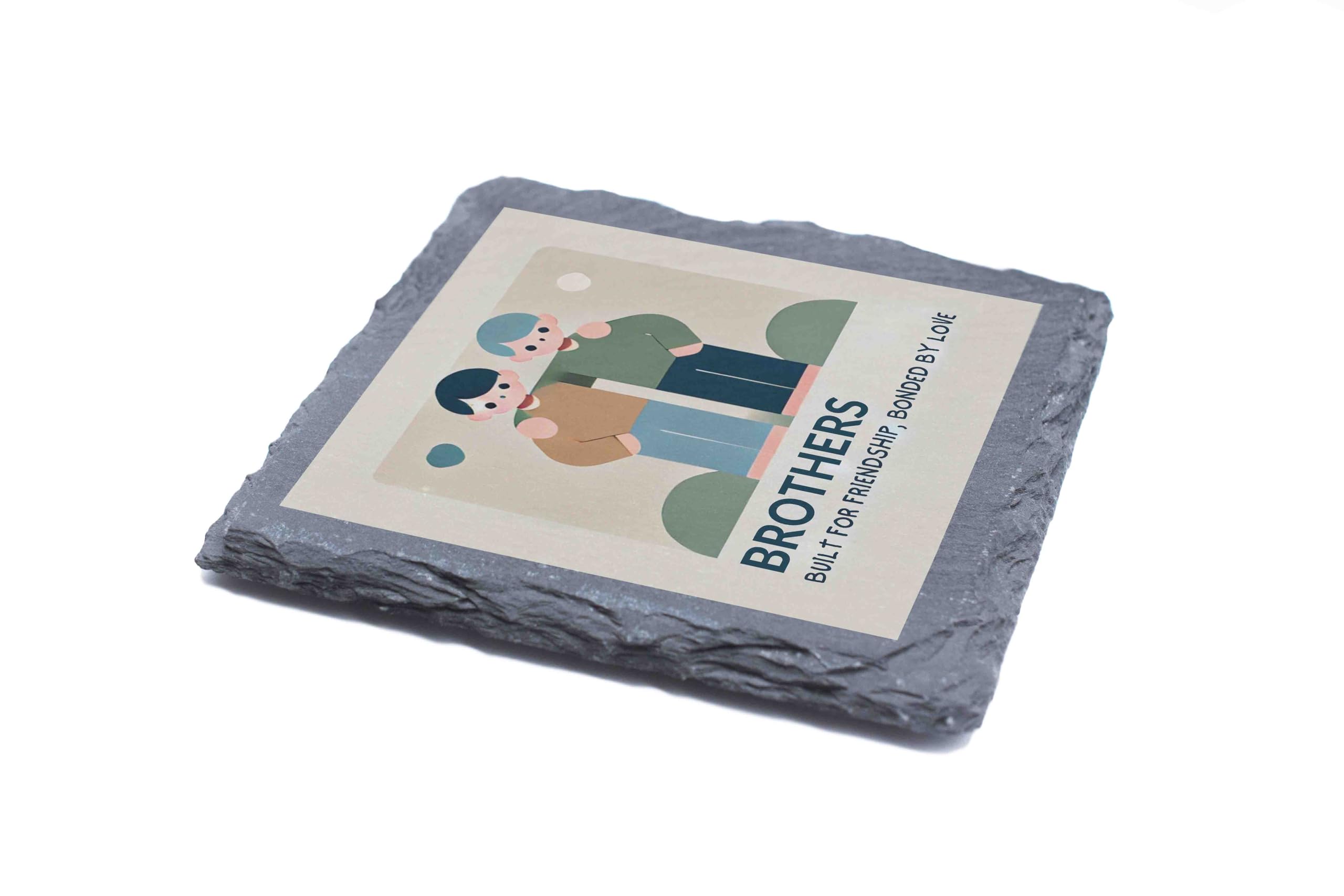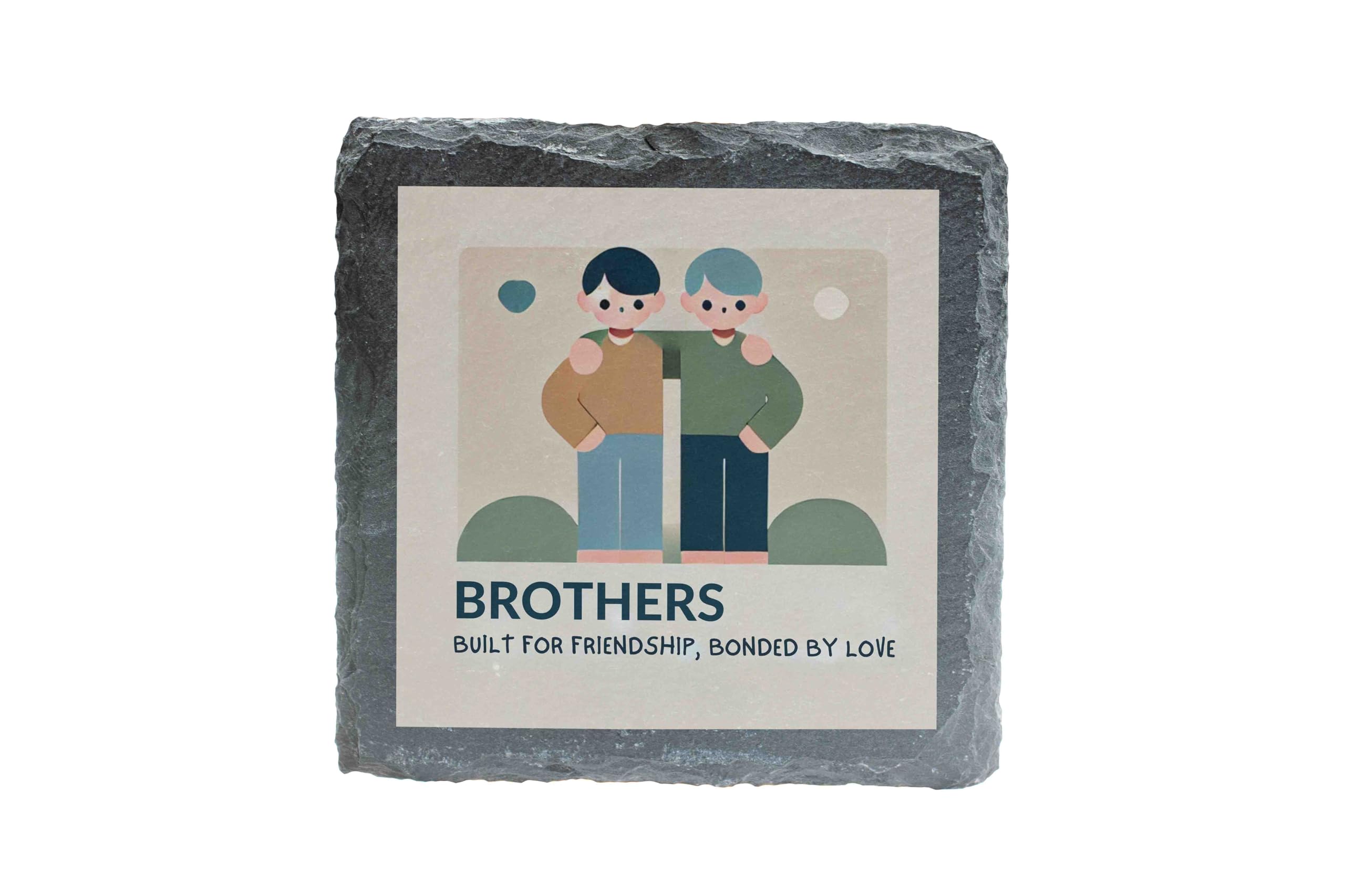 Celebrate the unique bond between brothers with this beautifully designed slate coaster. Featuring a minimalist illustration of two brothers and the touching phrase, "Brothers: Built for Friendship, Bonded by Love," this coaster is a tribute to the enduring connection and memories shared by siblings. Made from high-quality natural slate, this coaster is as practical as it is meaningful. The protective backing ensures surfaces remain scratch-free, while its sturdy design makes it ideal for daily use. Whether as a gift or a personal keepsake, this coaster is a timeless reminder of the love and friendship shared between brothers. Perfect for any occasion, it?s a heartwarming addition to any home or workspace.