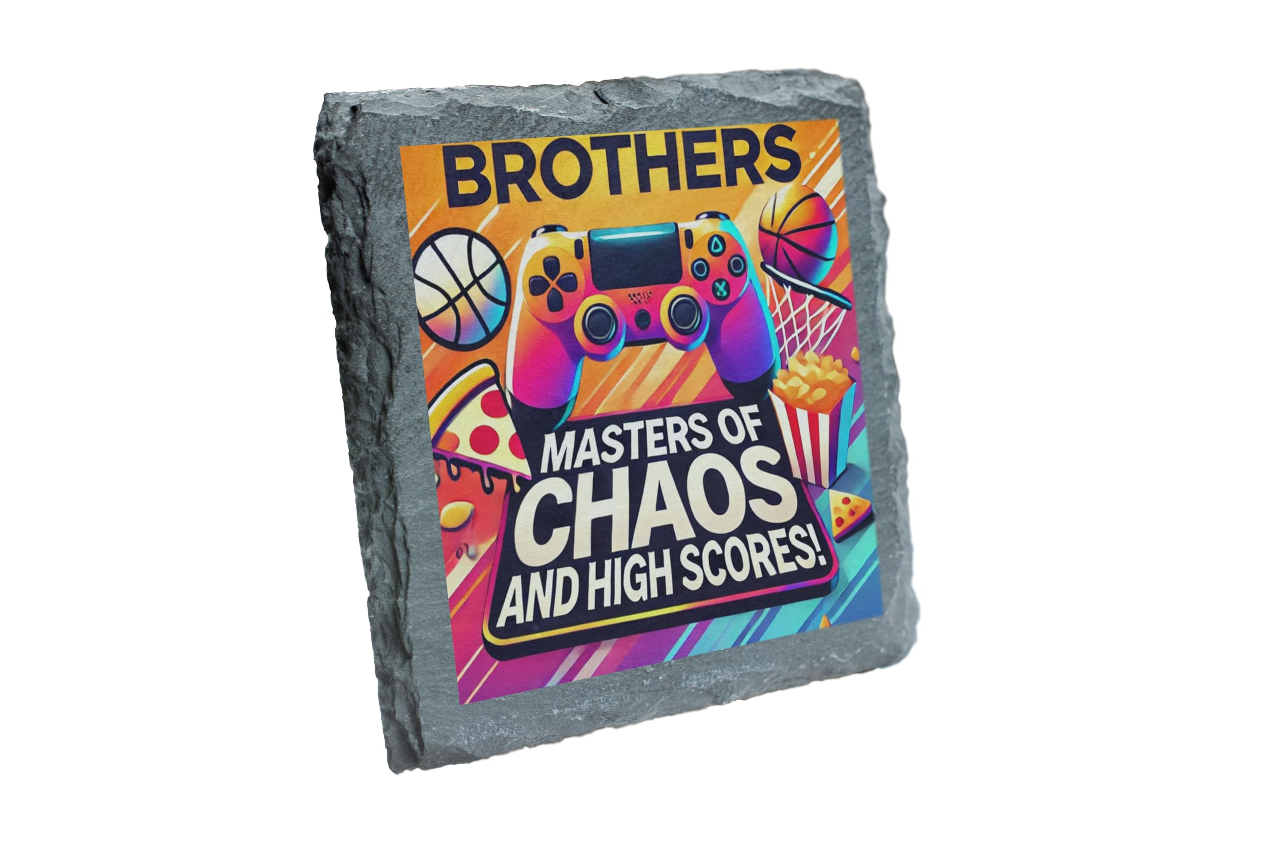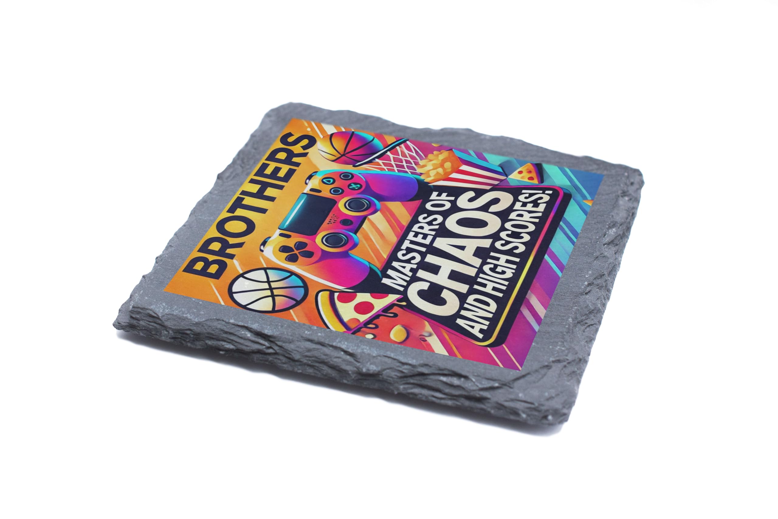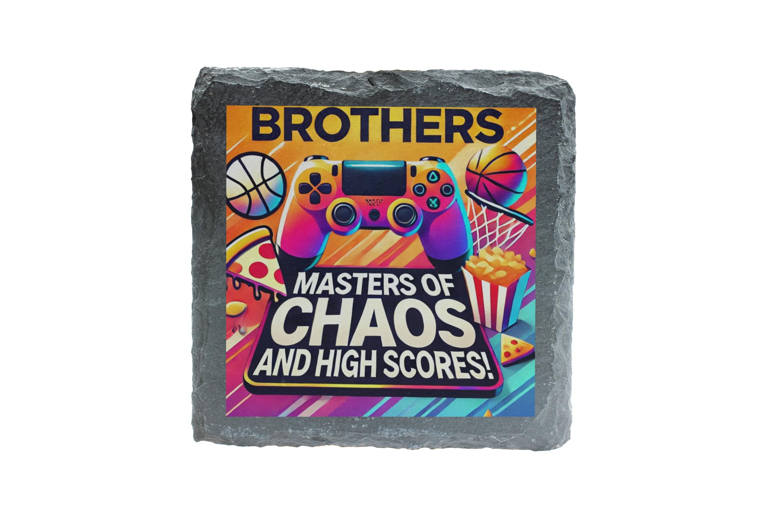 Celebrate sibling chaos and high-scoring fun with this "Masters of Chaos and High Scores" Slate Coaster! Designed with vibrant graphics featuring gaming controllers, basketballs, pizza, and fries, this coaster is a must-have for gamers and brothers who share a love of good times and epic adventures. Crafted from durable natural slate, this 10x10 cm coaster not only adds a stylish accent to your space but also protects your surfaces from scratches and moisture. The fade-resistant print ensures it remains a vibrant piece in your collection for years to come. Whether as a playful gift for your brother or a unique addition to your gaming setup, this coaster brings a blend of fun and functionality to any setting. Celebrate brotherhood and gaming glory in style!
