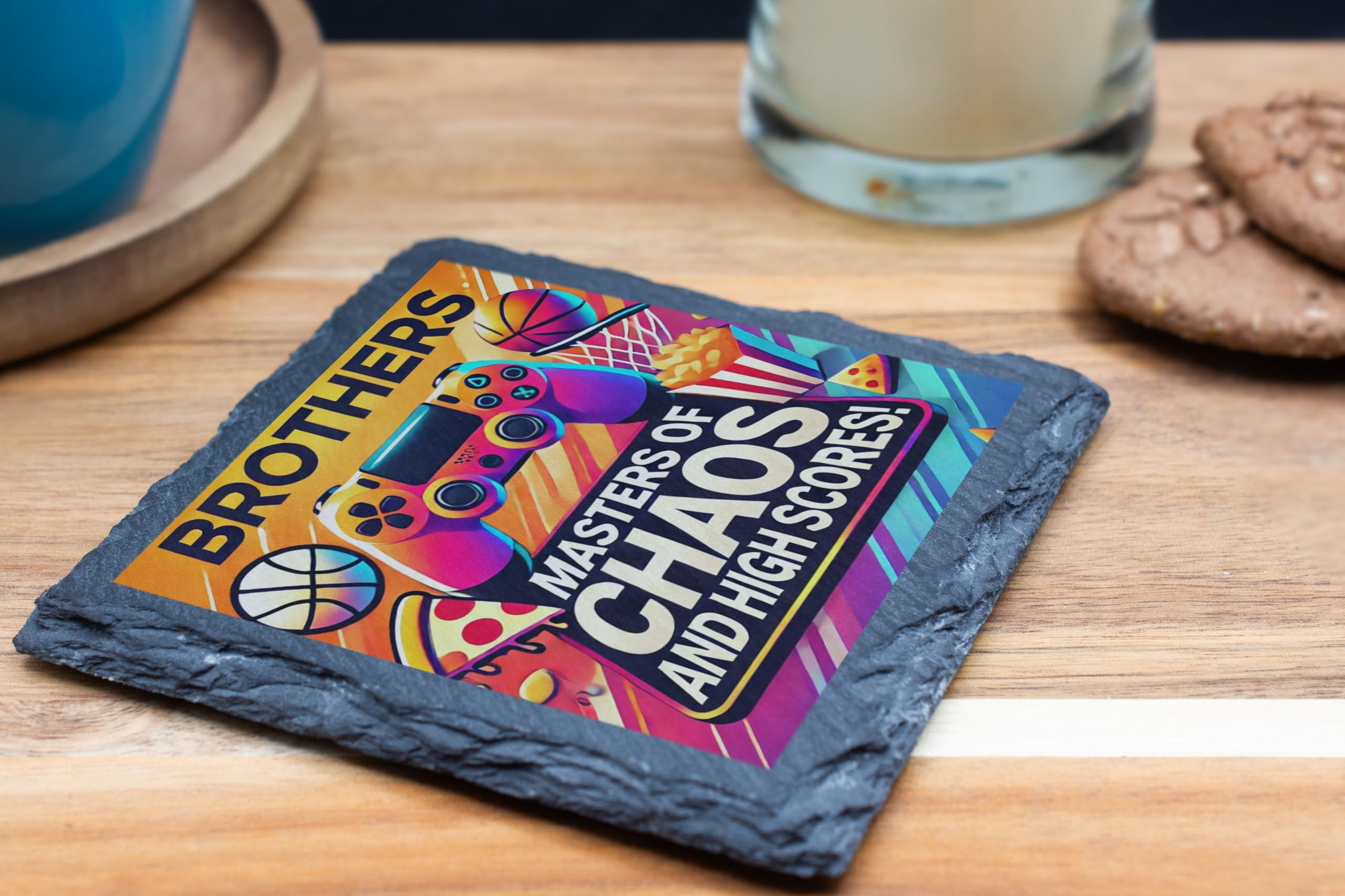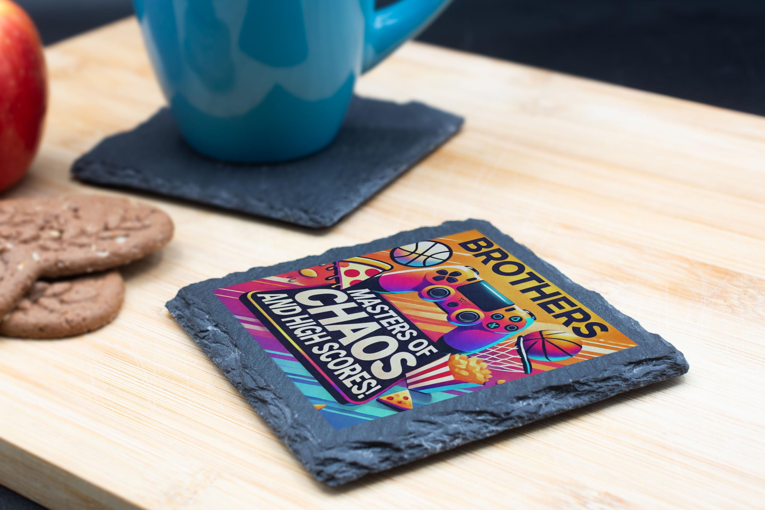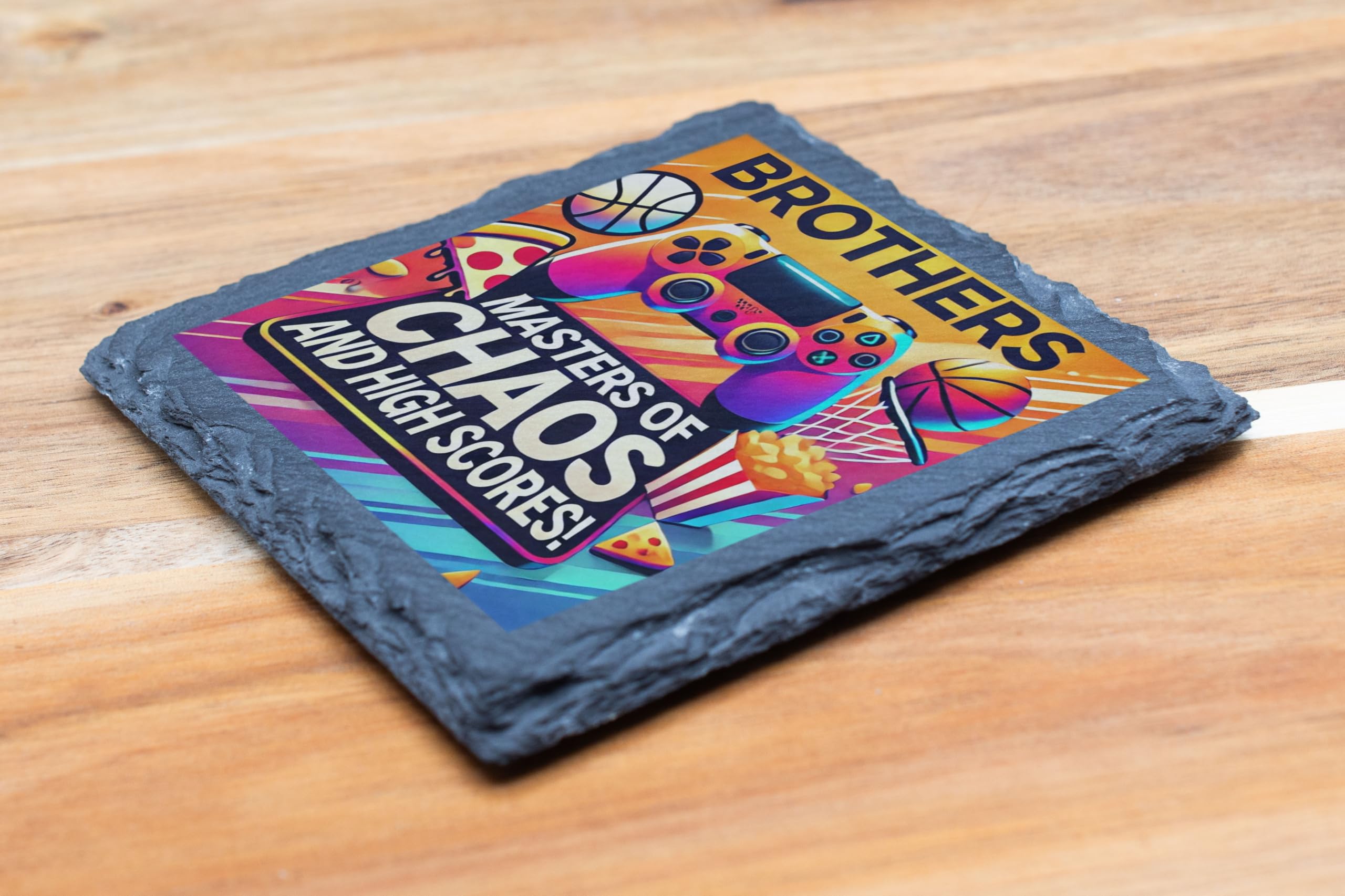 Celebrate sibling chaos and high-scoring fun with this "Masters of Chaos and High Scores" Slate Coaster! Designed with vibrant graphics featuring gaming controllers, basketballs, pizza, and fries, this coaster is a must-have for gamers and brothers who share a love of good times and epic adventures. Crafted from durable natural slate, this 10x10 cm coaster not only adds a stylish accent to your space but also protects your surfaces from scratches and moisture. The fade-resistant print ensures it remains a vibrant piece in your collection for years to come. Whether as a playful gift for your brother or a unique addition to your gaming setup, this coaster brings a blend of fun and functionality to any setting. Celebrate brotherhood and gaming glory in style!