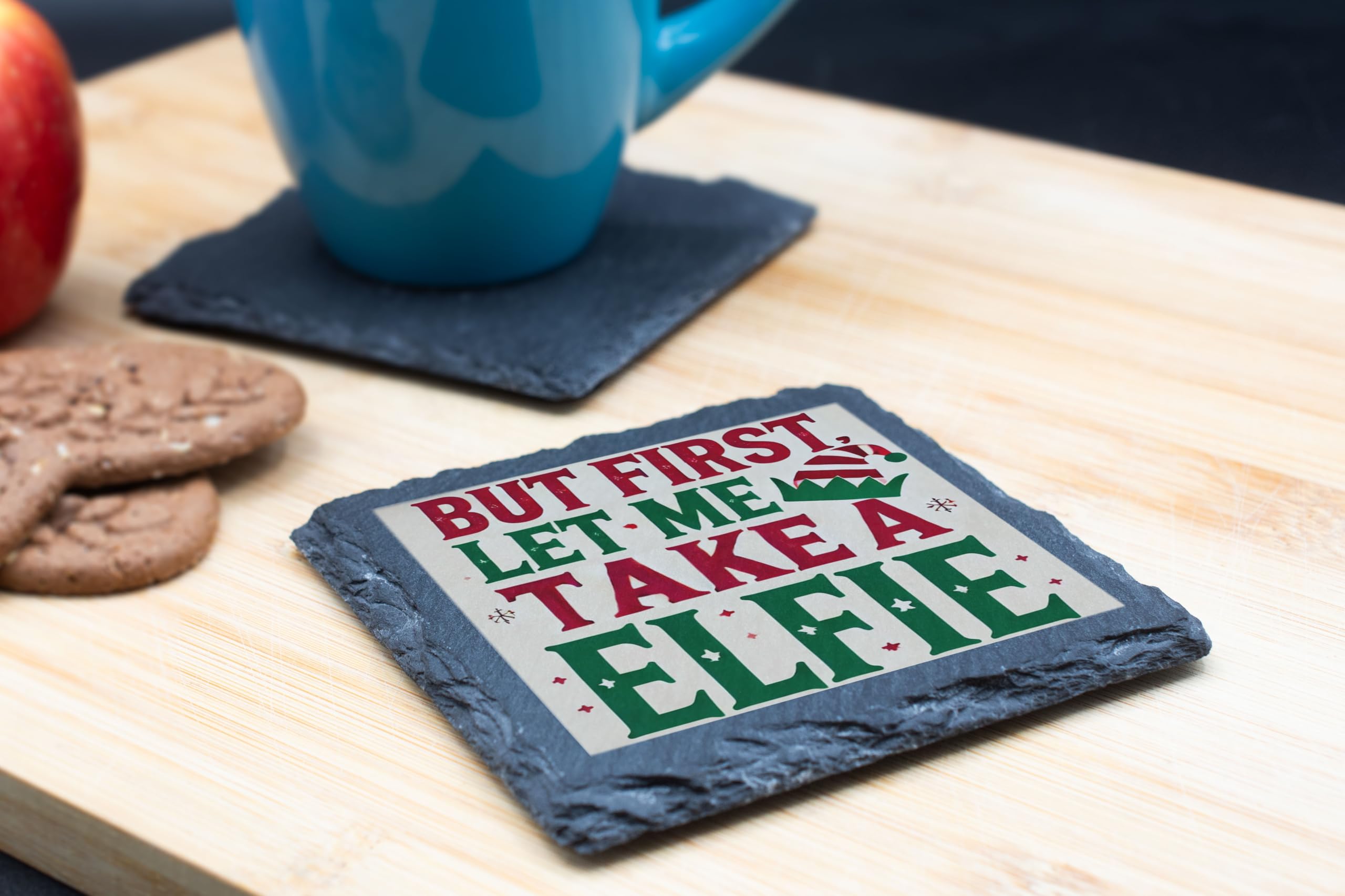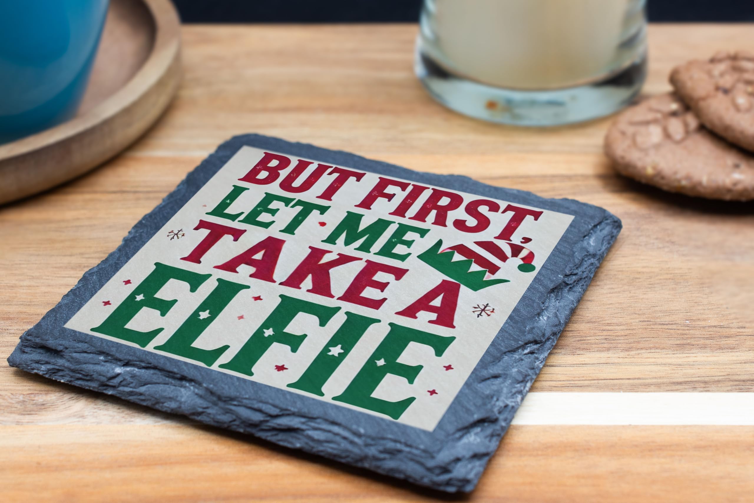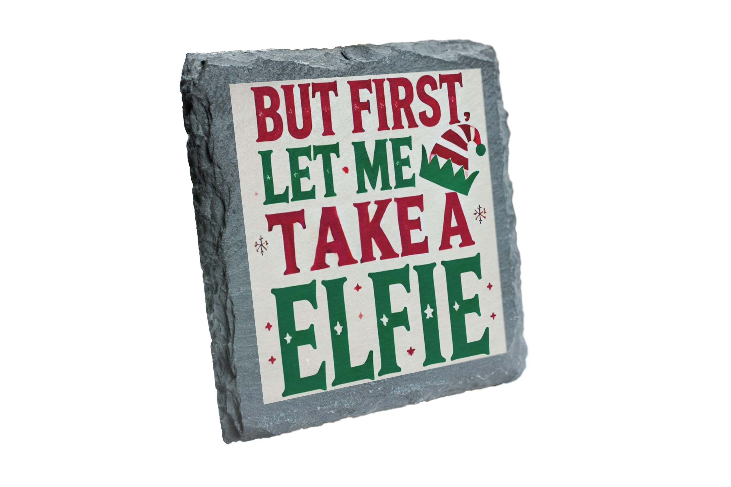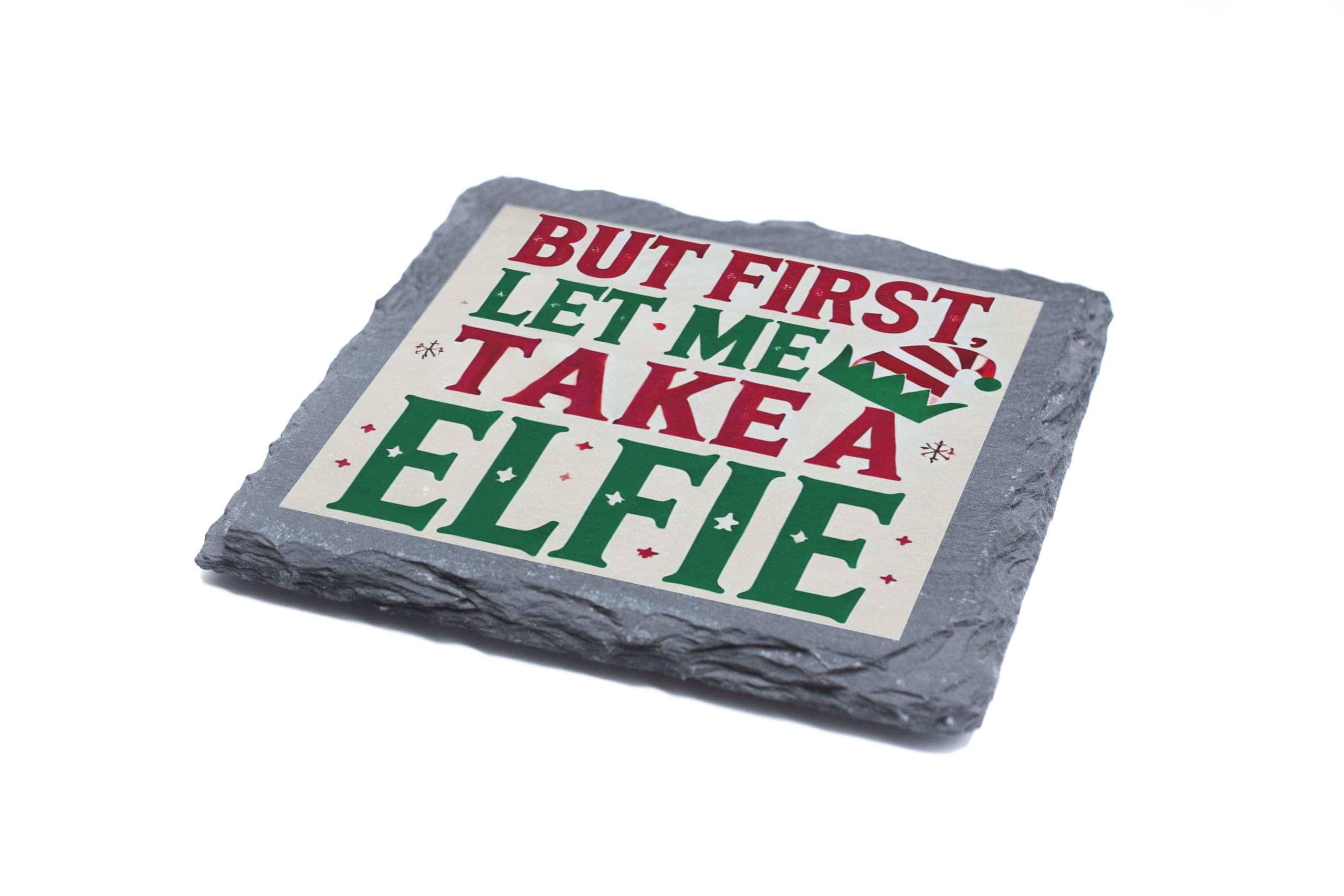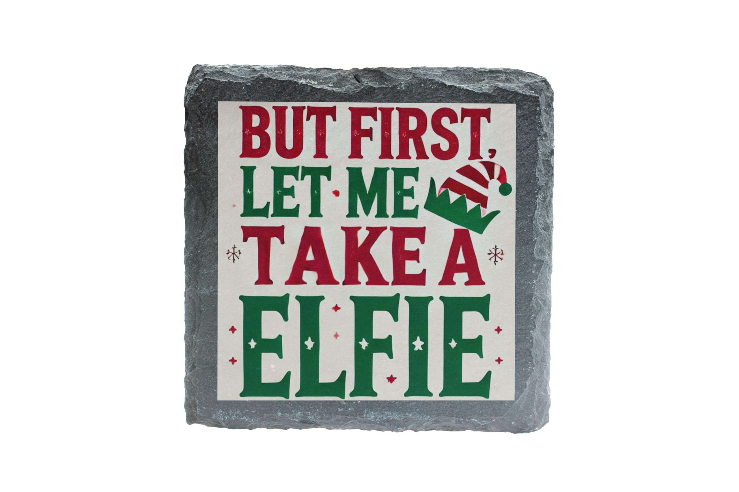 Add a touch of humor and holiday cheer to your d?cor with the "But First, Let Me Take a Elfie" Slate Coaster. Whether you're hosting a Christmas gathering, enjoying a cozy night by the fireplace, or looking for a festive gift, this coaster is the perfect choice. Handcrafted from premium natural slate, it?s both practical and stylish. This playful design, with vibrant holiday colors and a whimsical elf hat, is sure to bring smiles to your guests and loved ones. Use it to protect your furniture from drink stains while spreading joy and laughter. This coaster is an excellent stocking stuffer, Secret Santa gift, or a fun addition to your holiday table settings. Celebrate the season with this lighthearted yet functional piece of Christmas cheer!
