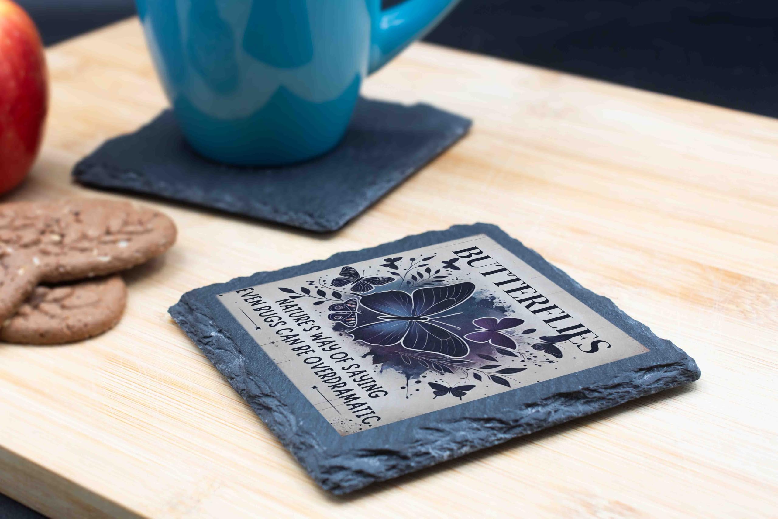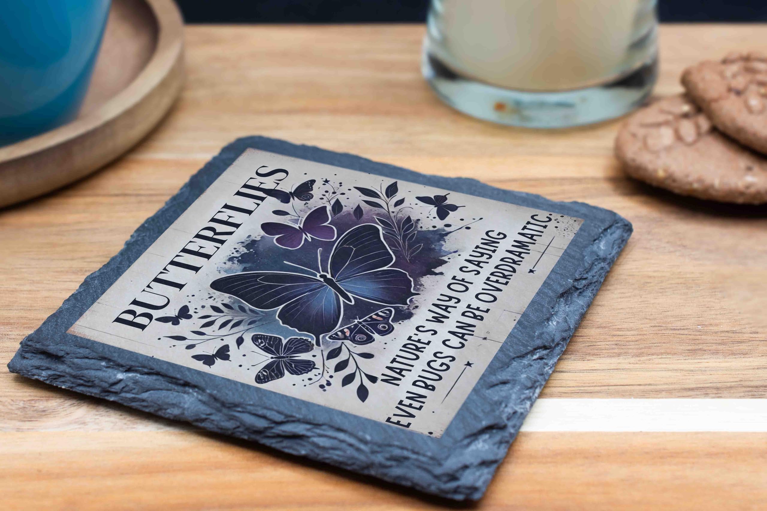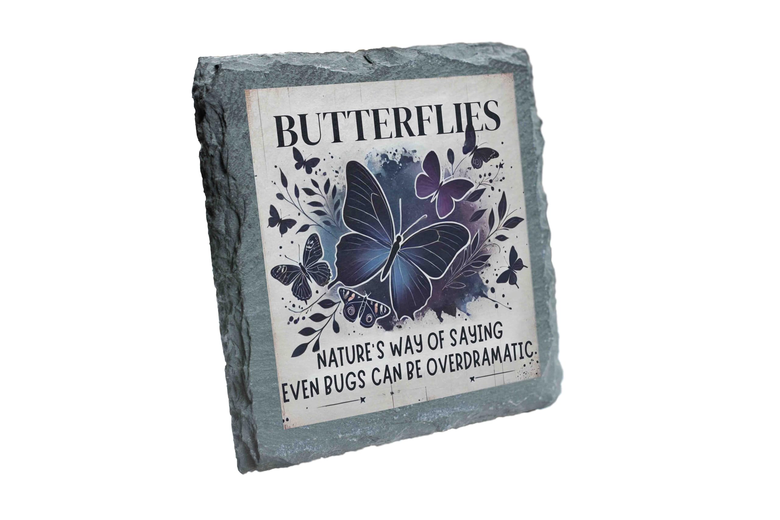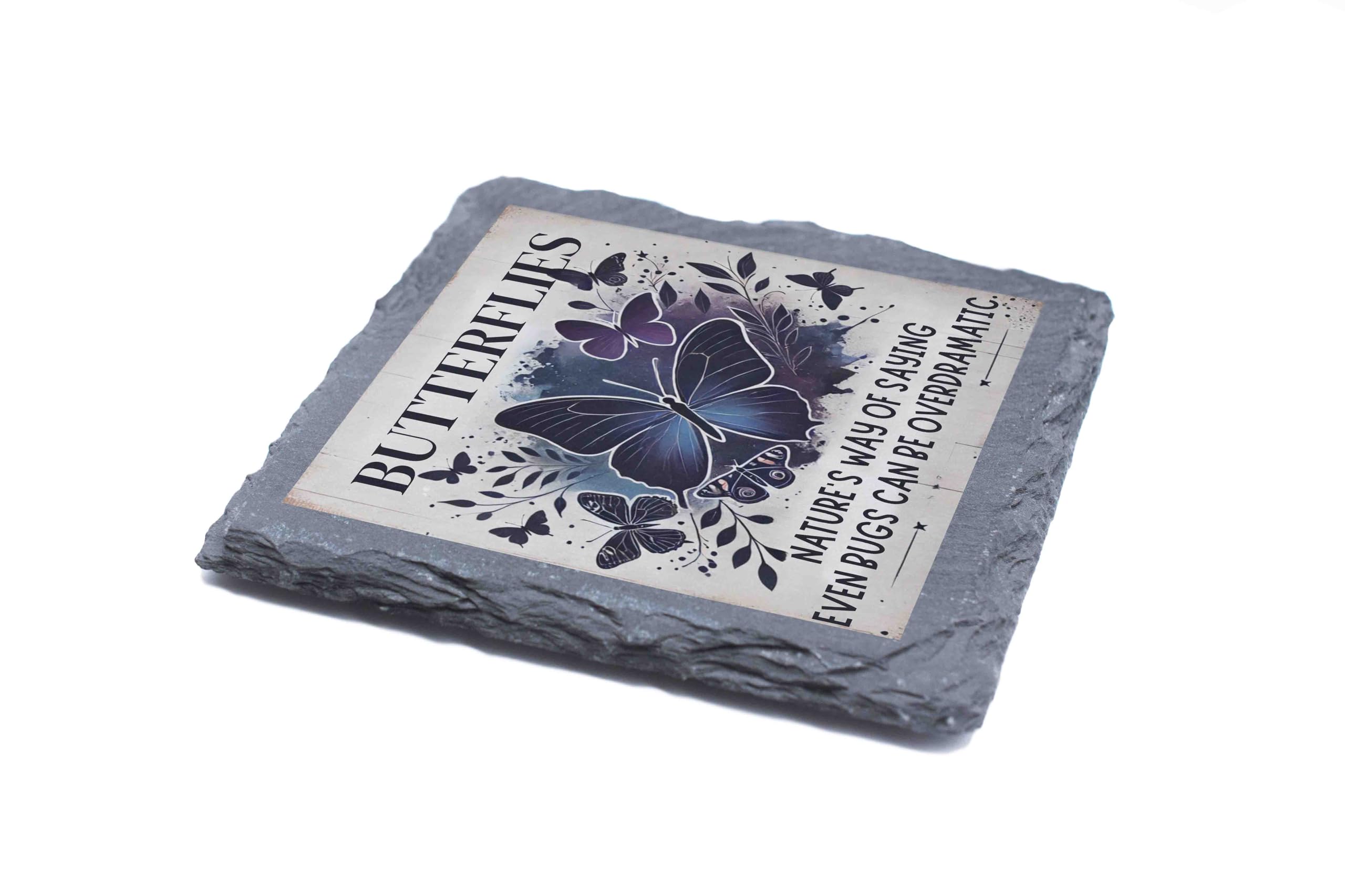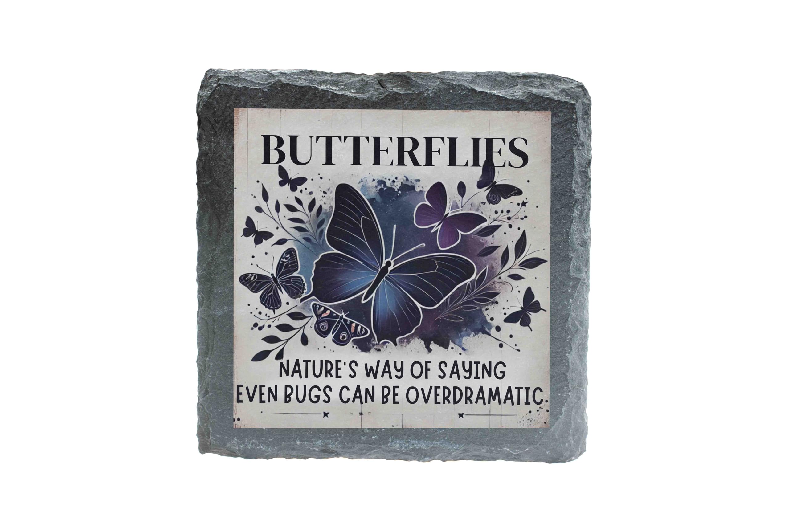 Add a touch of humor and elegance to your space with this beautifully crafted slate coaster. Showcasing a dramatic butterfly design accompanied by the witty quote, "Nature?s way of saying even bugs can be overdramatic," this coaster combines practicality with personality. Made from premium slate, it features a natural, textured finish and a protective felt backing to guard your surfaces. Whether used as a functional coaster or a decorative accent, it?s a charming addition to any home or office. Perfect as a thoughtful gift for friends, family, or anyone who appreciates nature?s quirks.