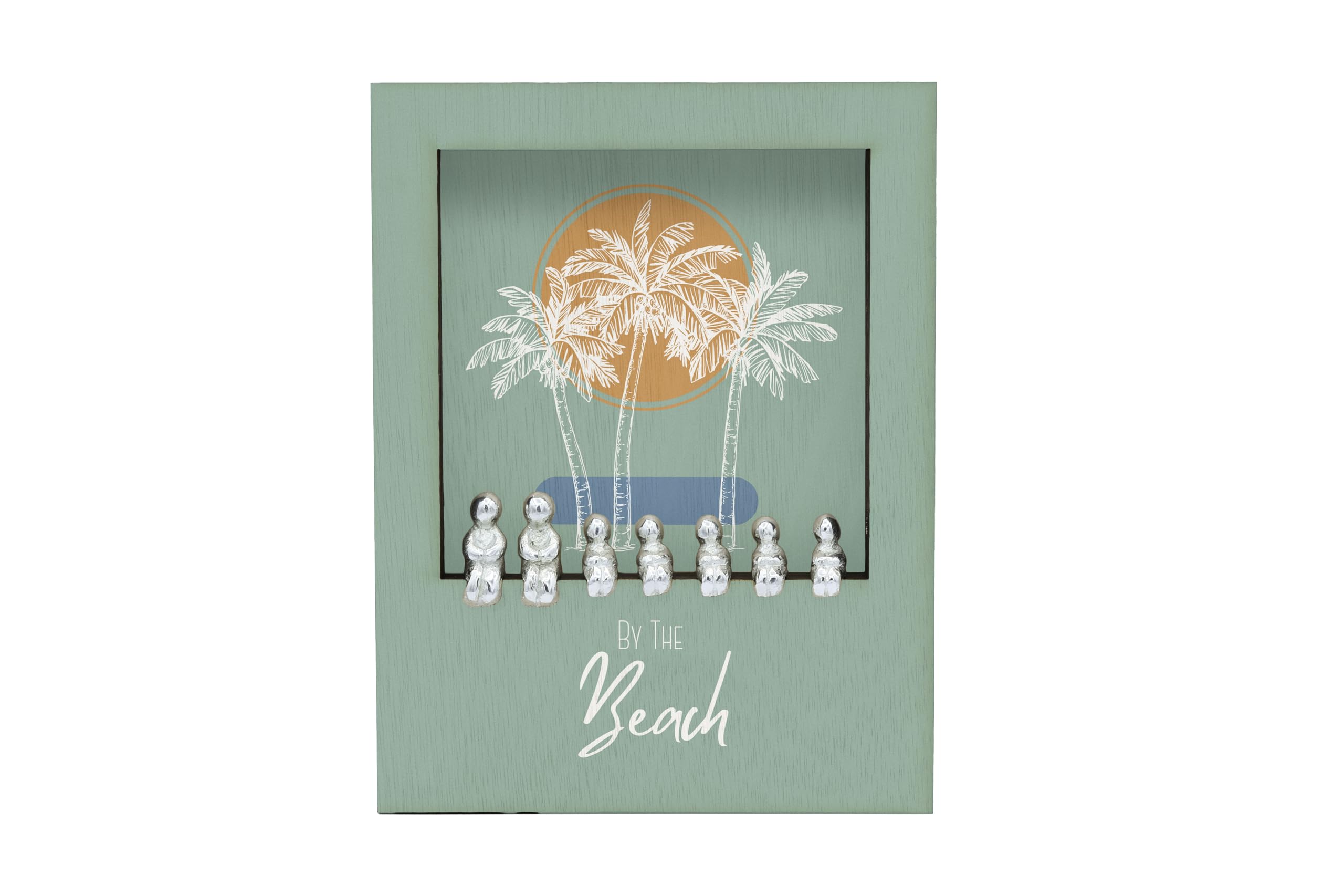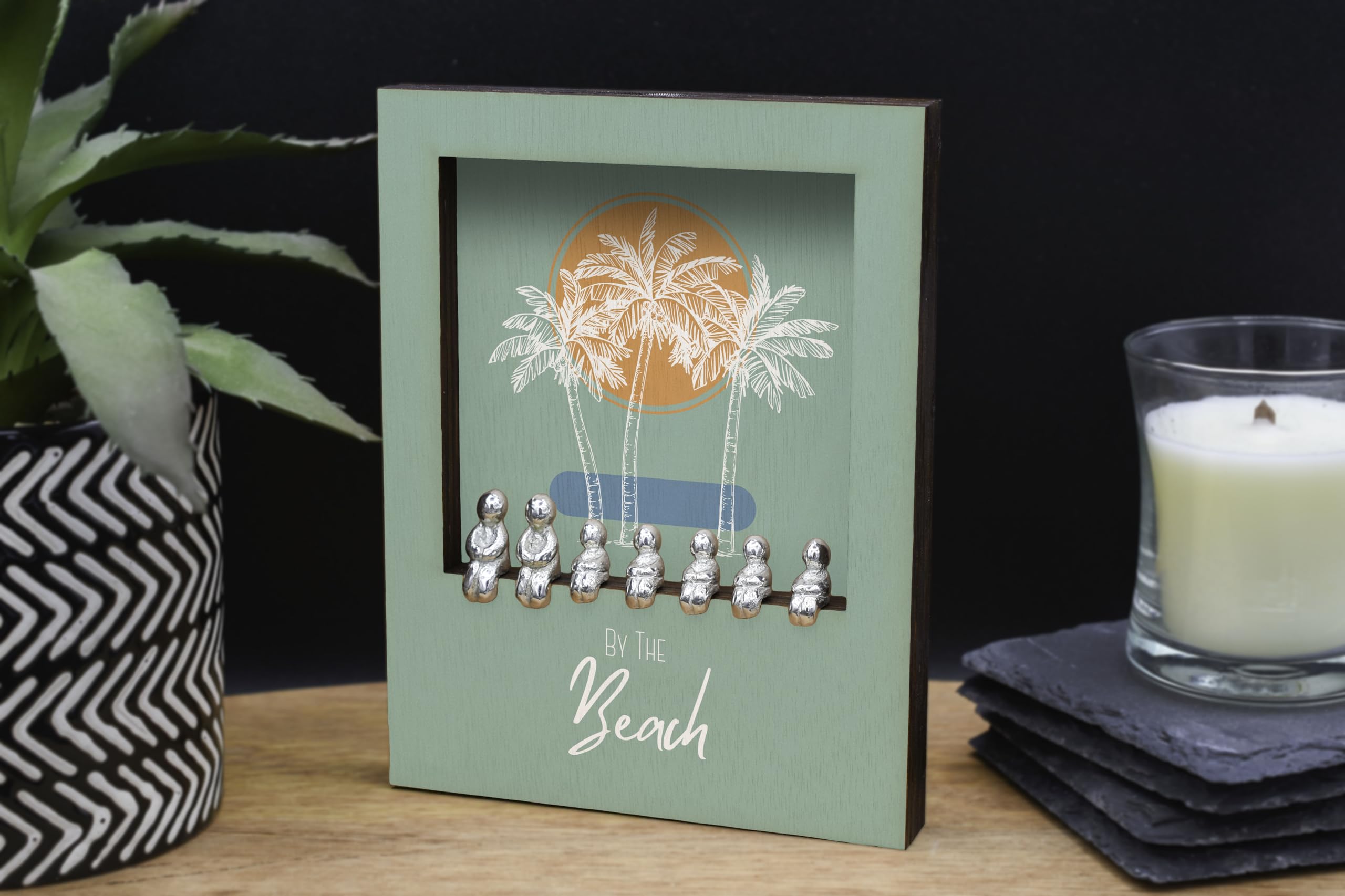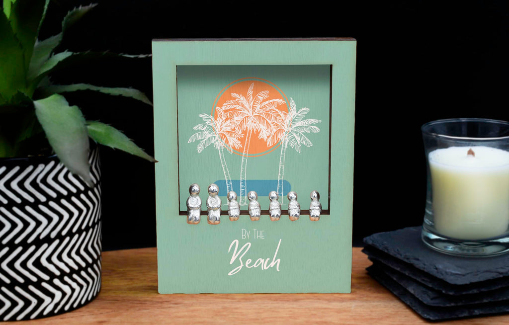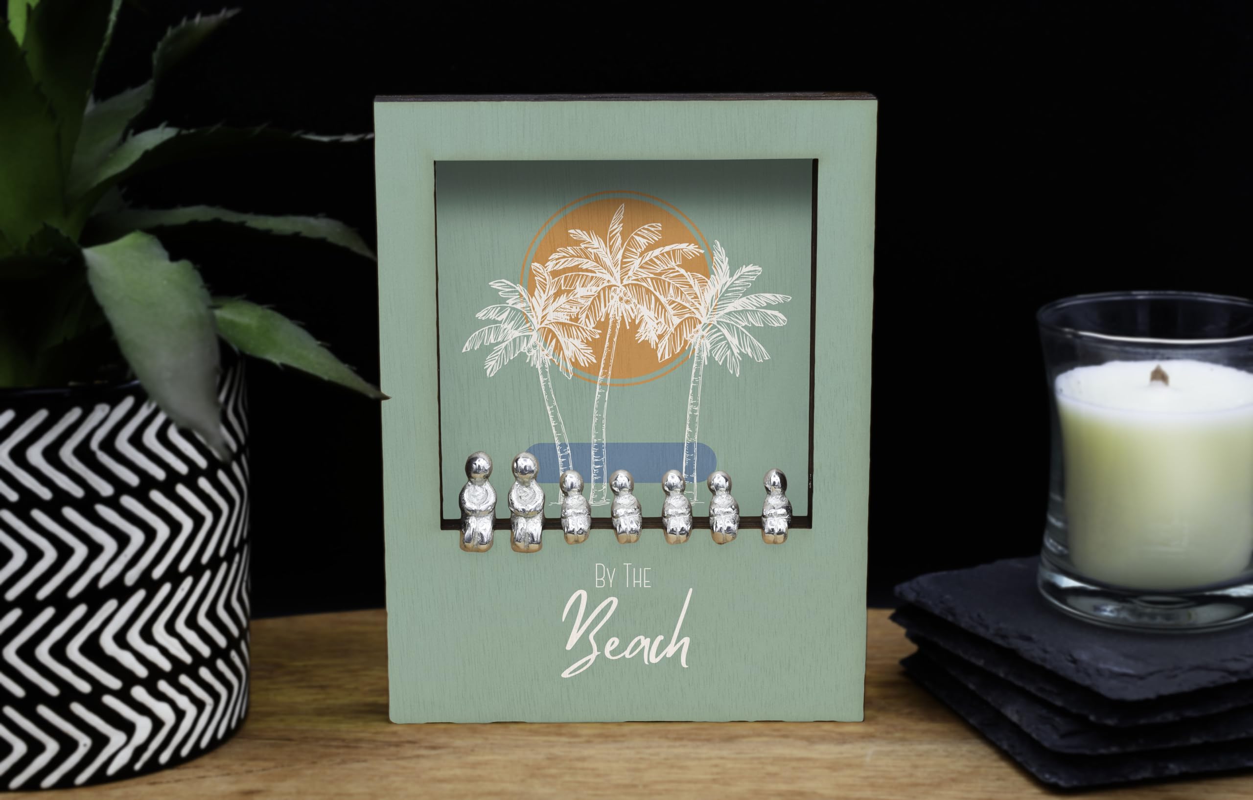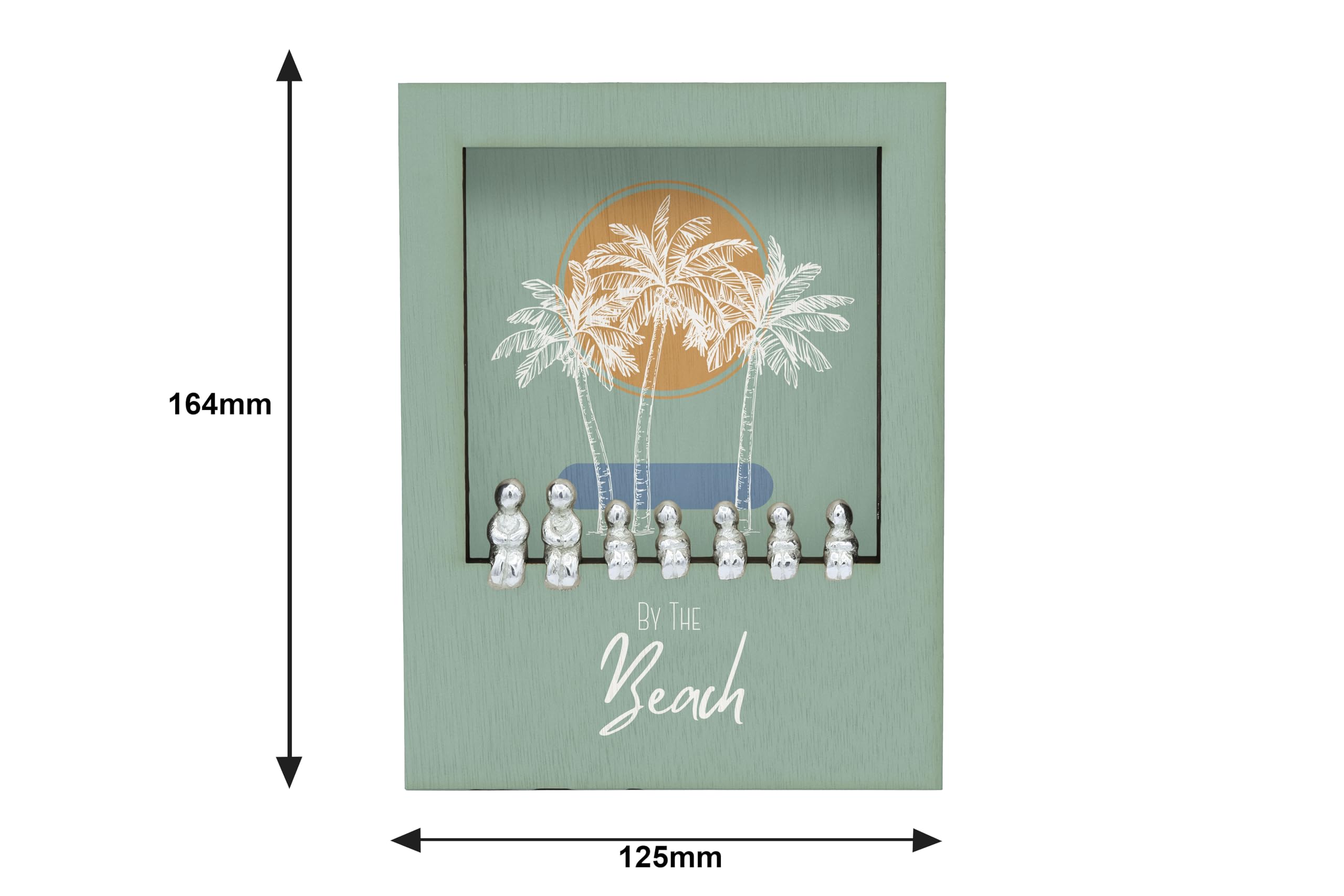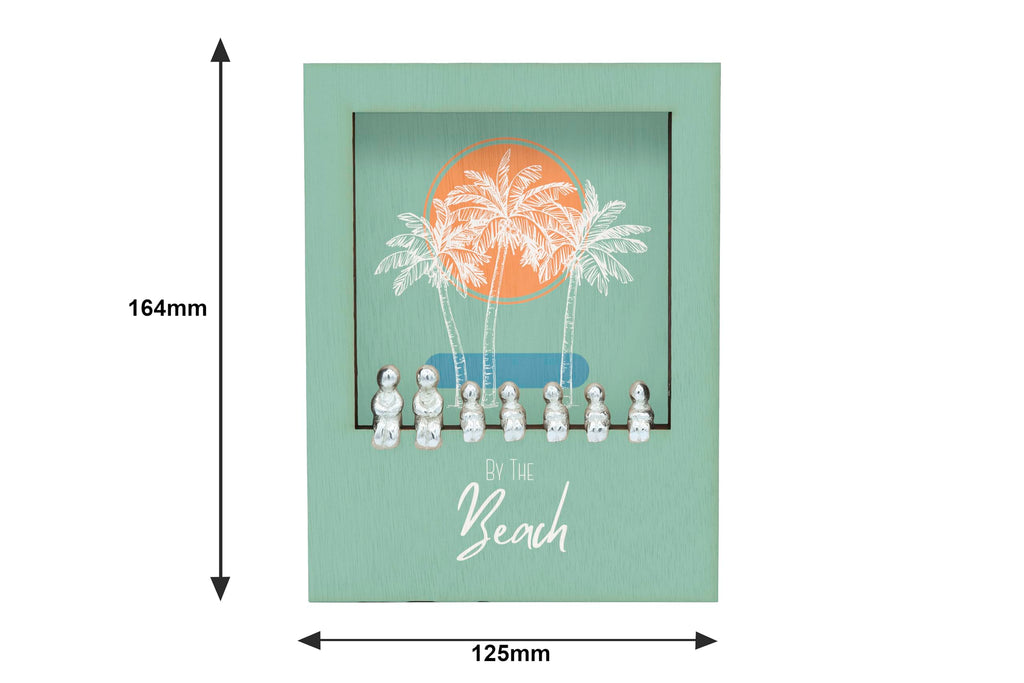 Introducing our By the Beach - Family Plywood Ornament - the perfect addition to your home decor and a thoughtful gift for your loved ones. This beautiful ornament serves as a centre piece that will bring a touch of the beach into your home. Crafted with love, this unique ornament can be personalised to reflect your own family combination. With a 7 people set, you can create a truly special piece that represents your family. Made from quality plywood, this ornament features a free standing photo frame that holds metal people, printed in full colour, surrounded by a stunning green background with palm trees, sun, and sea design. Let us help you cherish your memories by the beach with this wonderful ornament.