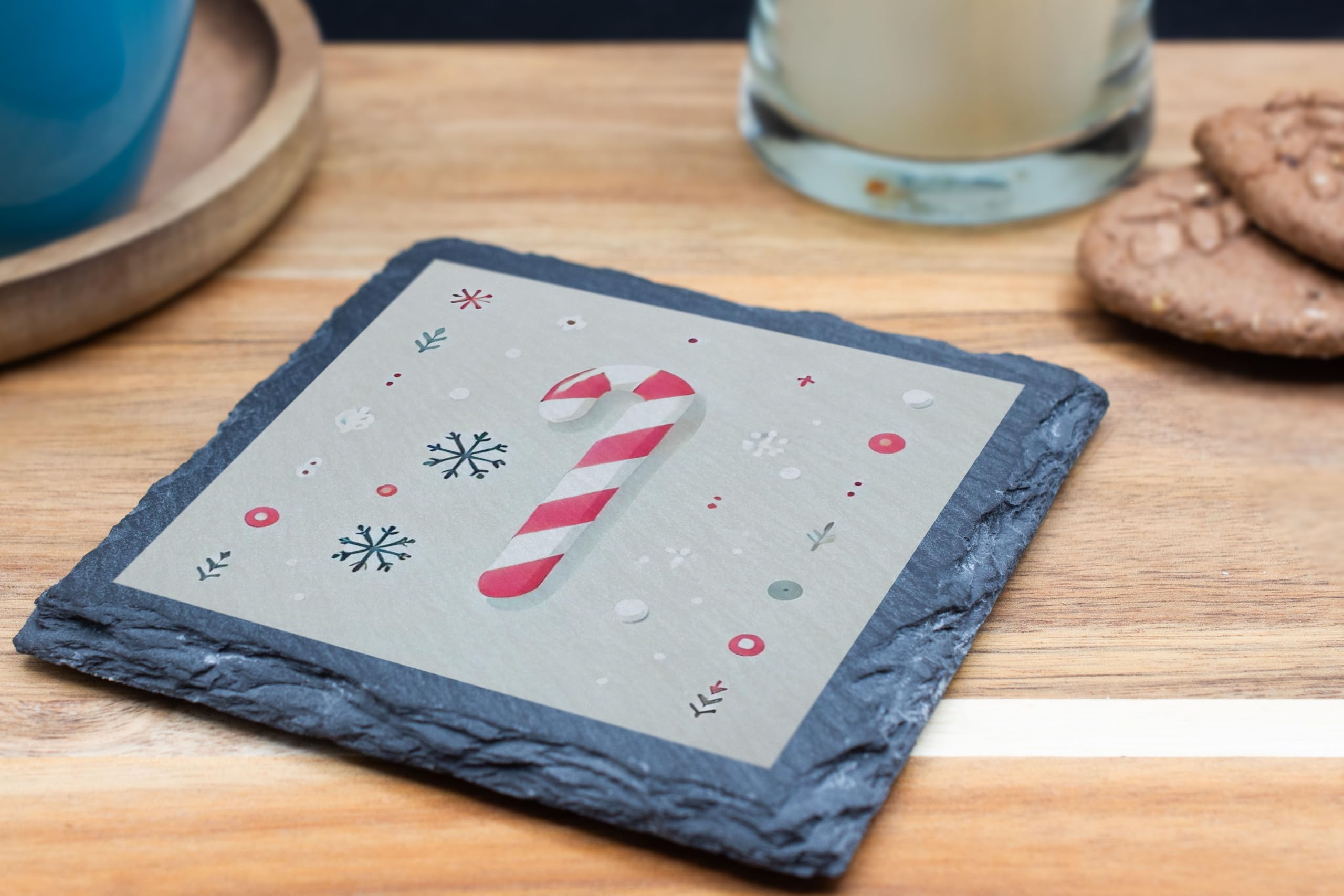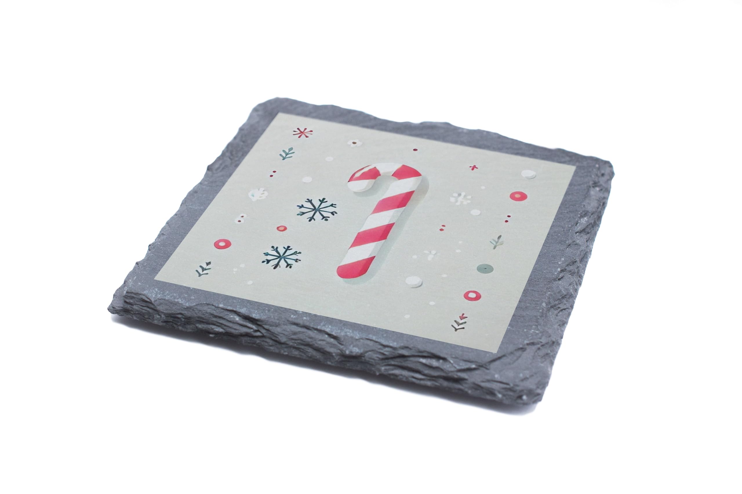 Embrace the holiday spirit with this beautifully designed Candy Cane Christmas Slate Coaster. Featuring a charming candy cane illustration surrounded by delicate snowflakes and festive accents, this coaster perfectly captures the essence of the Christmas season. Crafted from premium natural slate, it combines durability with elegance, providing a reliable way to protect your surfaces while adding a decorative touch. Whether you're sipping hot cocoa by the fireplace or hosting a holiday party, this festive coaster is a functional and stylish addition to your holiday decor. It also makes for a thoughtful gift or stocking stuffer for anyone who appreciates the magic of Christmas.