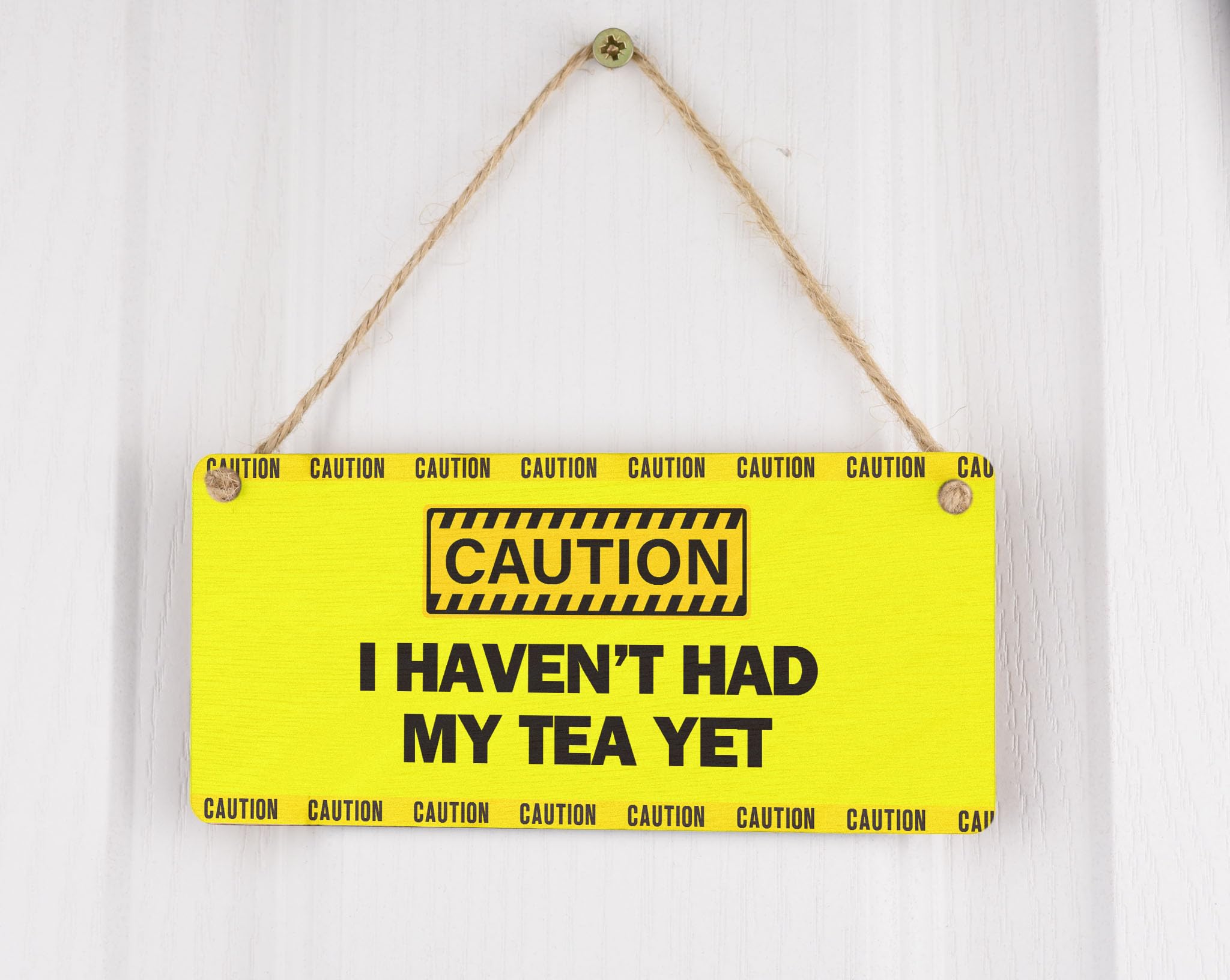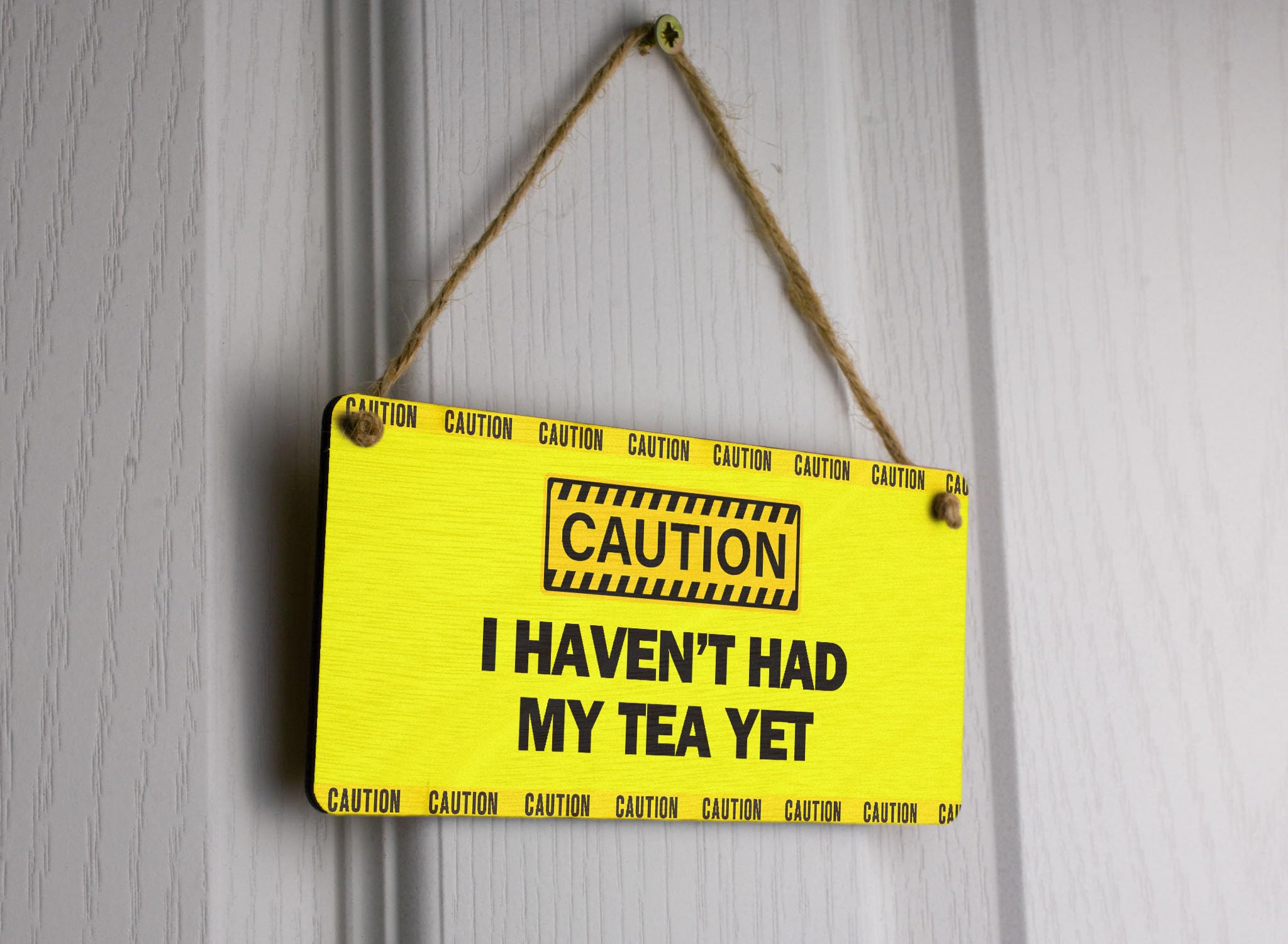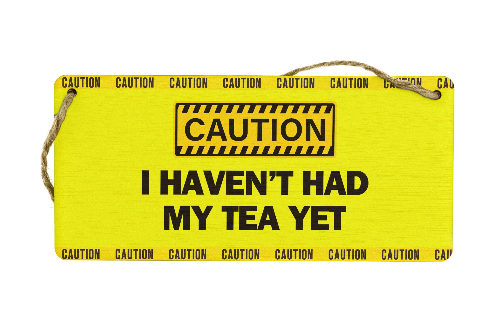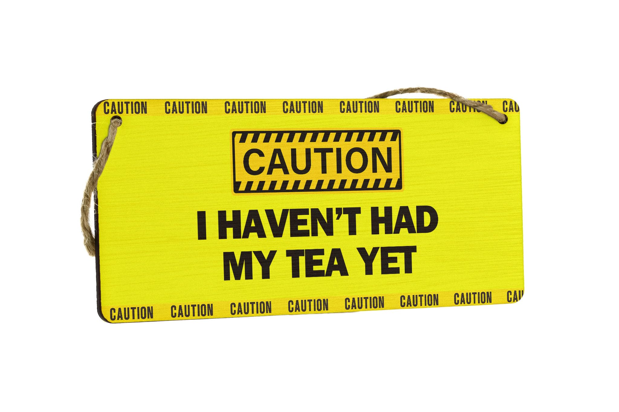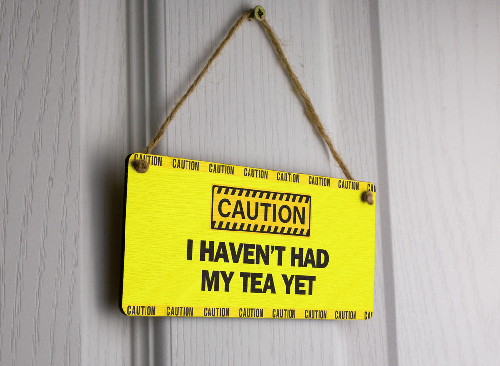 Add a touch of morning humour to your kitchen or office with this quirky 'Caution: I Haven't Had My Tea Yet' funny tea sign. This novelty item is the perfect addition to your decor, bringing a smile to your face every time you see it. Crafted from handcrafted laser cut plywood, this bold text sign features a UV printed design in bright yellow, making it a fun and eye-catching wall art piece. The sign reads 'Caution - I haven't had my tea yet', making it a great gag gift idea for any tea lover in your life. Whether you're looking for a small wall hanging to brighten up your space or want to add a touch of office humor, this sign is sure to impress. Surprise your mum on her birthday or Mother's Day with this unique and thoughtful present that will show her just how much you care.