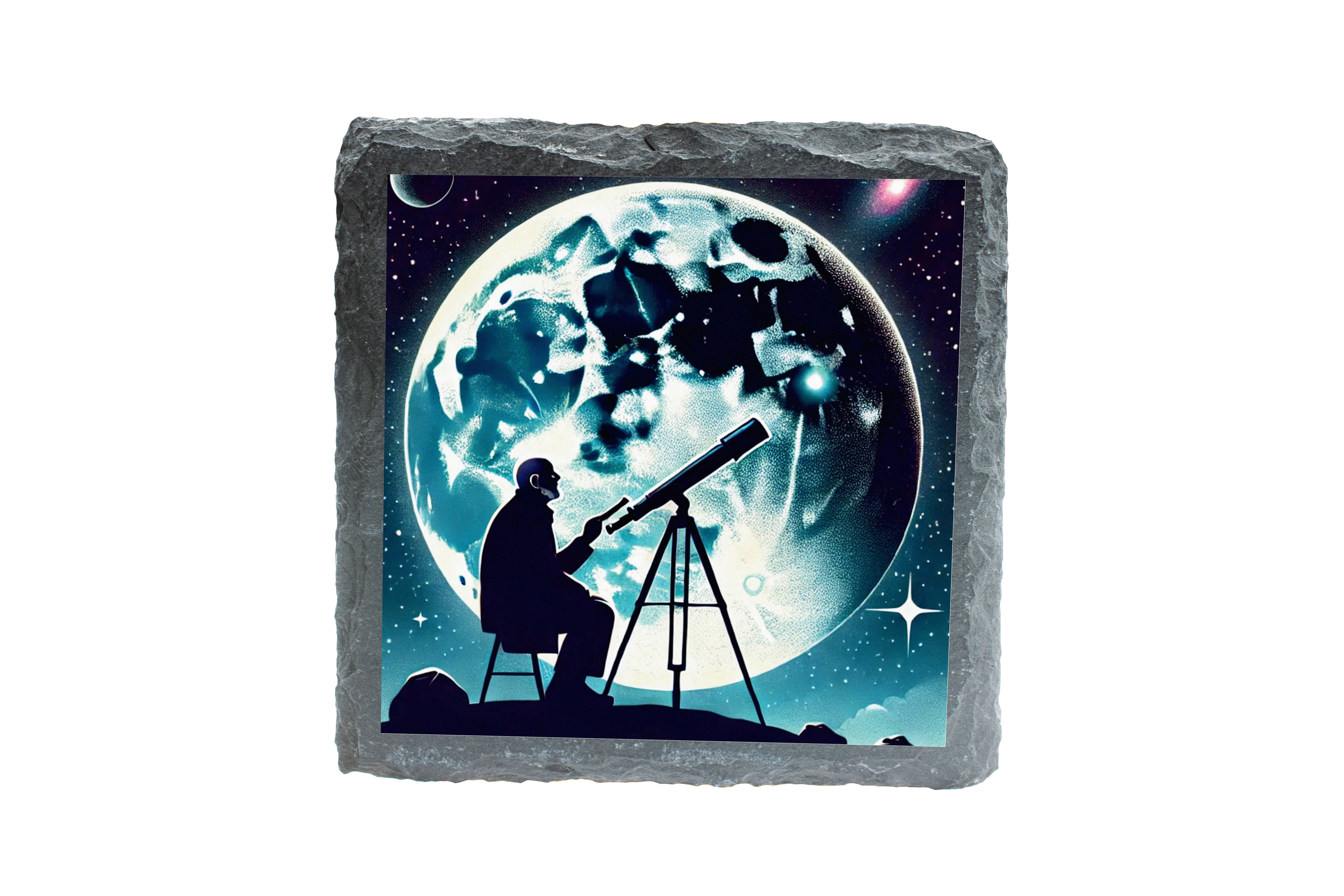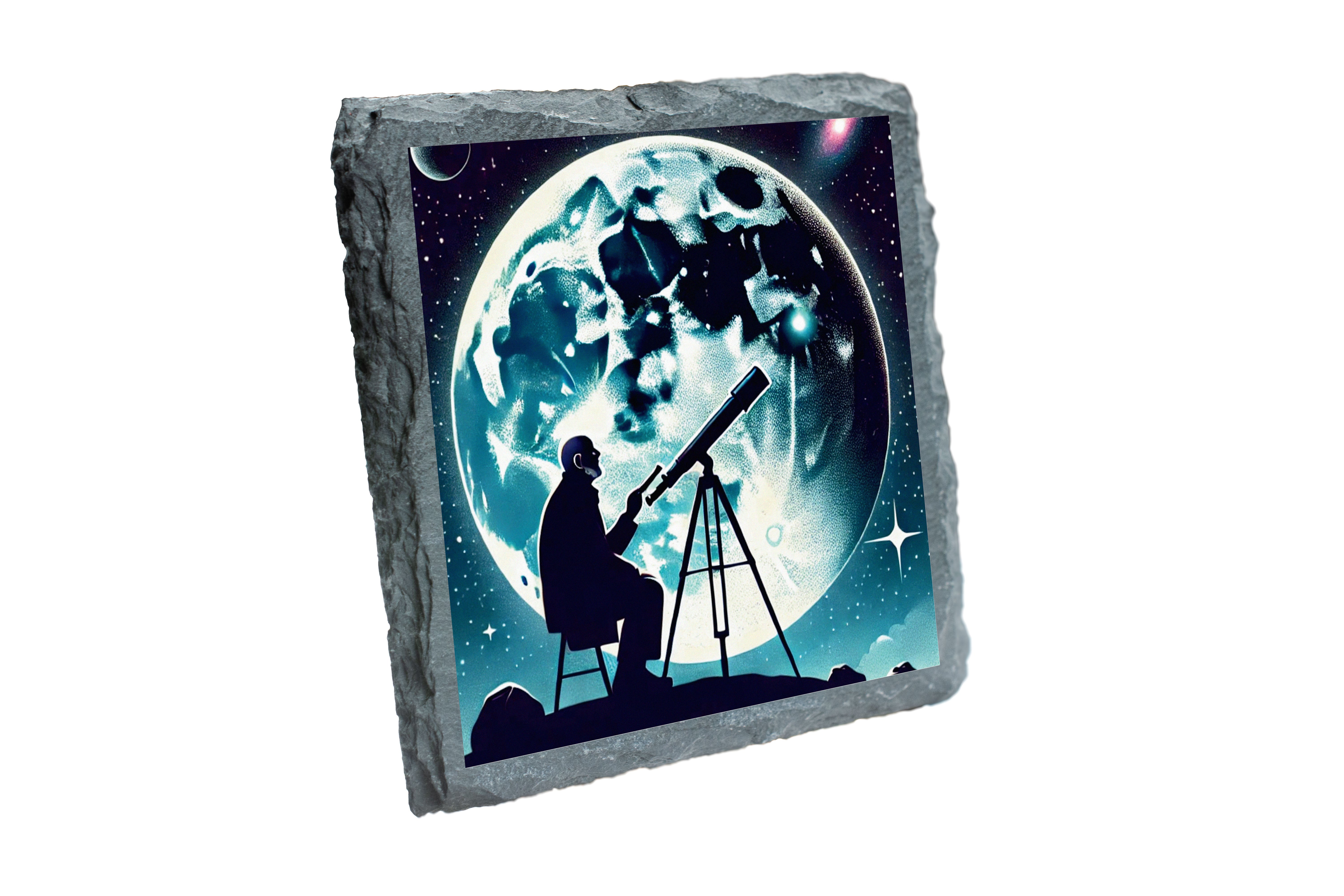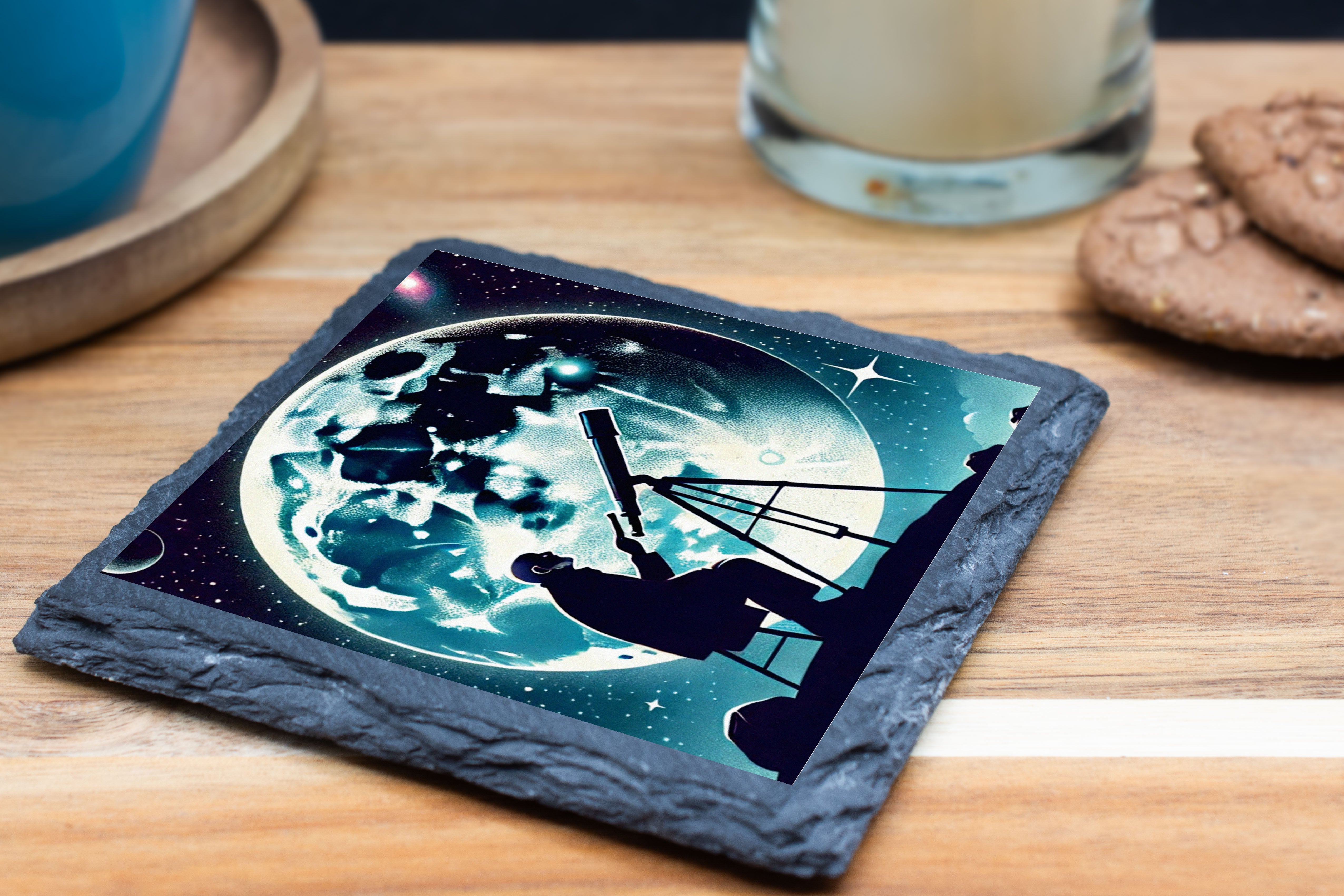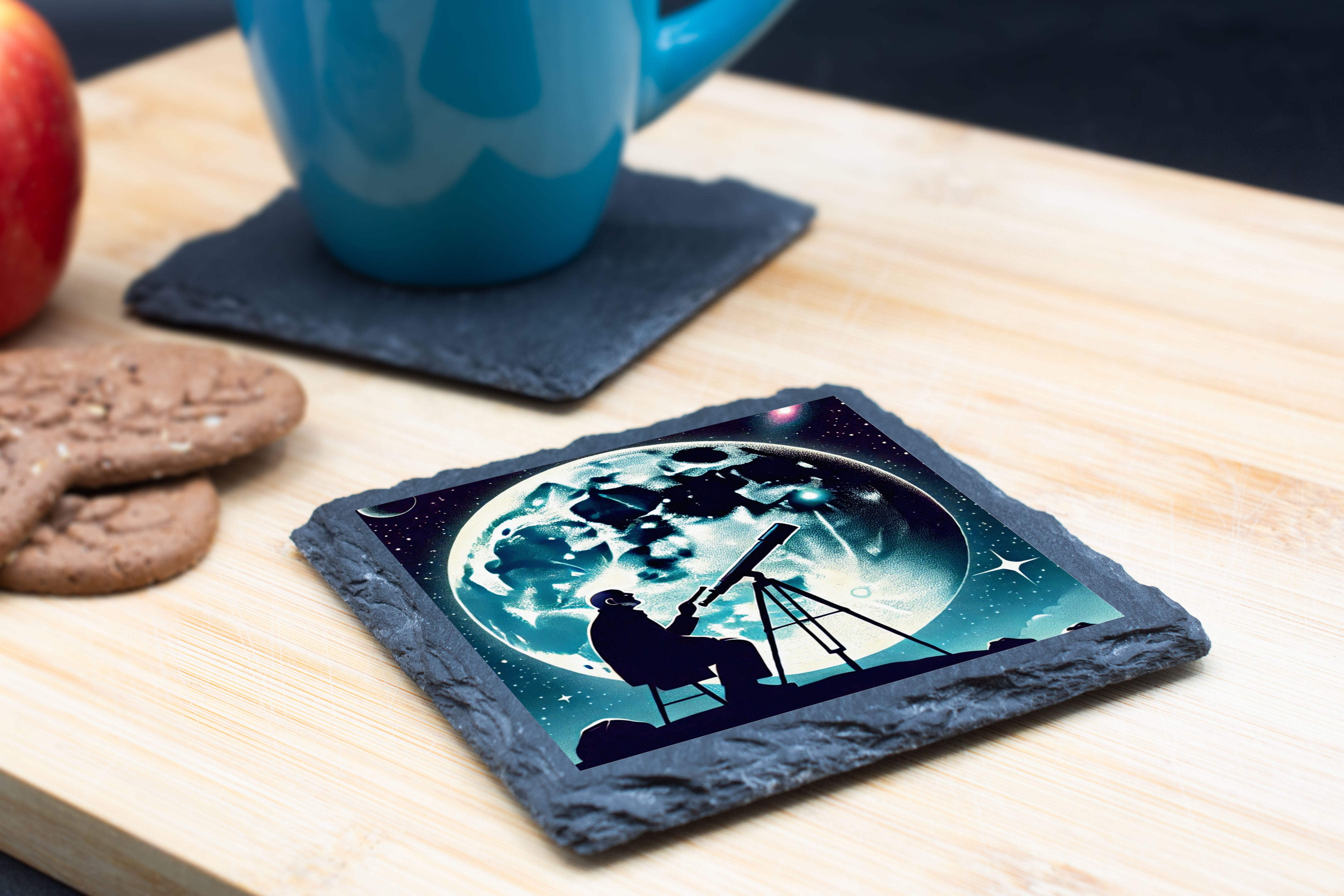 Elevate your table setting with these stunning Celestial Stargazer Slate Coasters. Featuring an enchanting illustration of a silhouetted astronomer gazing through a telescope at a luminous moon and star-filled sky, these coasters are perfect for astronomy enthusiasts and dreamers alike. Crafted from natural slate, each coaster is uniquely textured and durable, providing a sophisticated and practical solution for protecting your surfaces from moisture and heat. Ideal for both casual and formal settings, these coasters add a touch of cosmic wonder to any home.