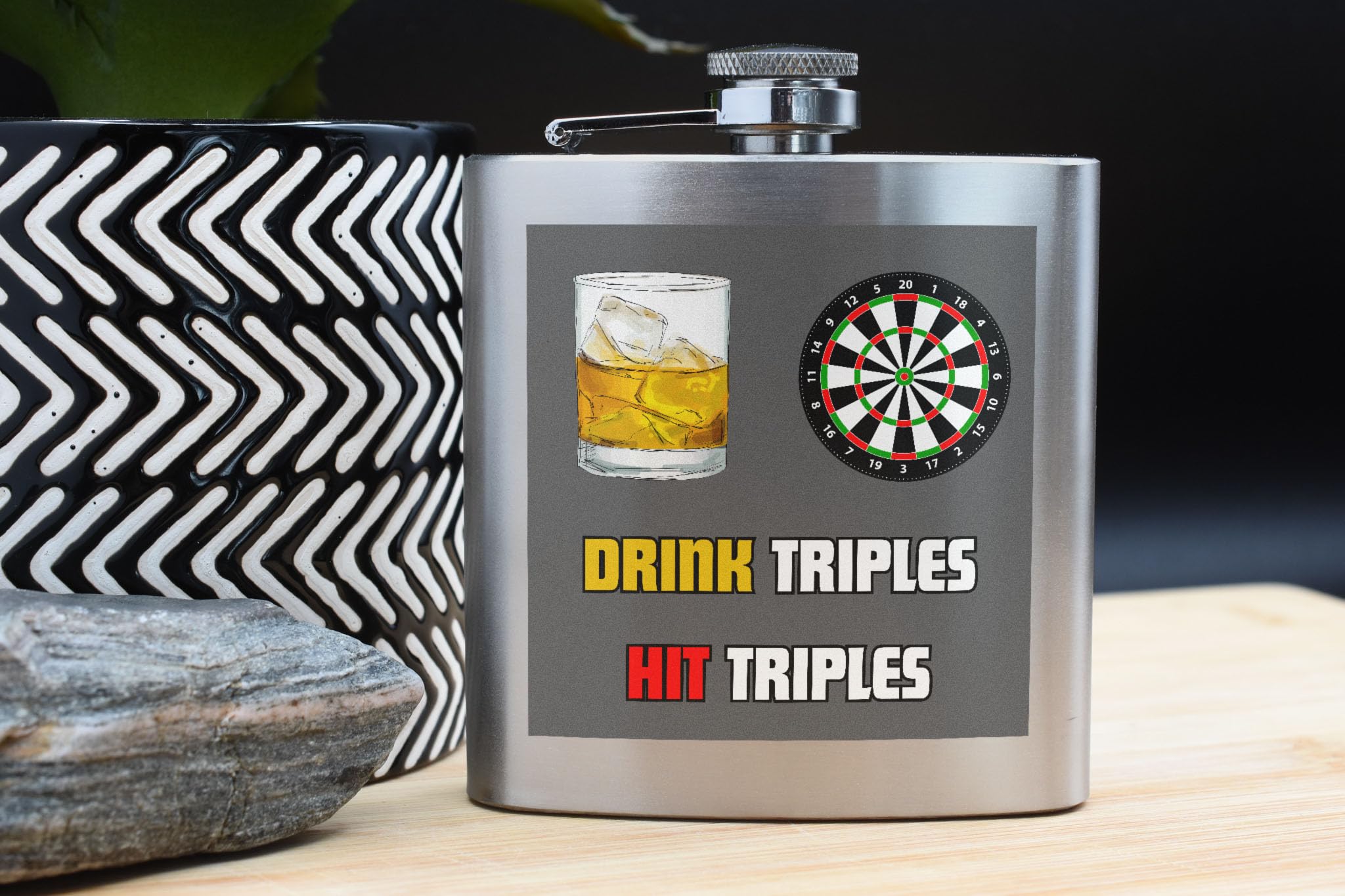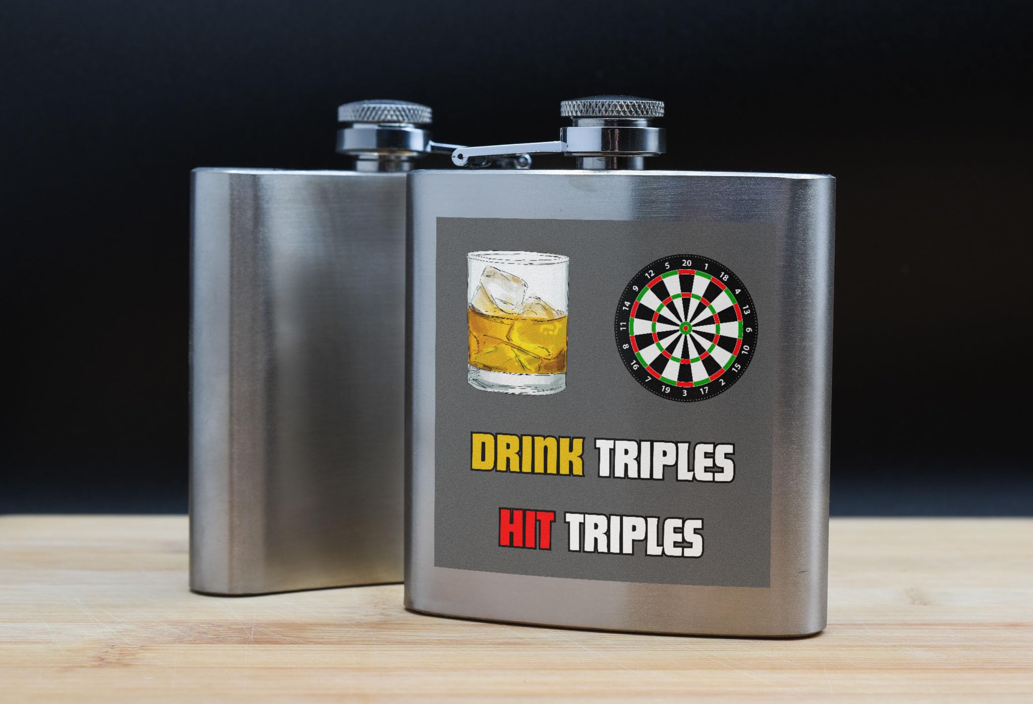 Introducing our Cheers and Darts Fun Flask - the ultimate accessory for any darts player, whiskey lover, or sports bar enthusiast! This Triple Shot Stainless Steel Flask features a unique UV printed 'Drink Triples - Hit Triples' design inspired by the classic game of darts. The full colour printed flask showcases a dartboard flask design, perfect for game nights, pub-themed gatherings, or just adding some fun to your drinking experience. Made from durable stainless steel, this flask is ideal for parties, nights out with the lads, or simply enjoying a triple shot of your favourite drink in style. Add some bar humor to your collection with this Cheers and Darts Fun Flask!