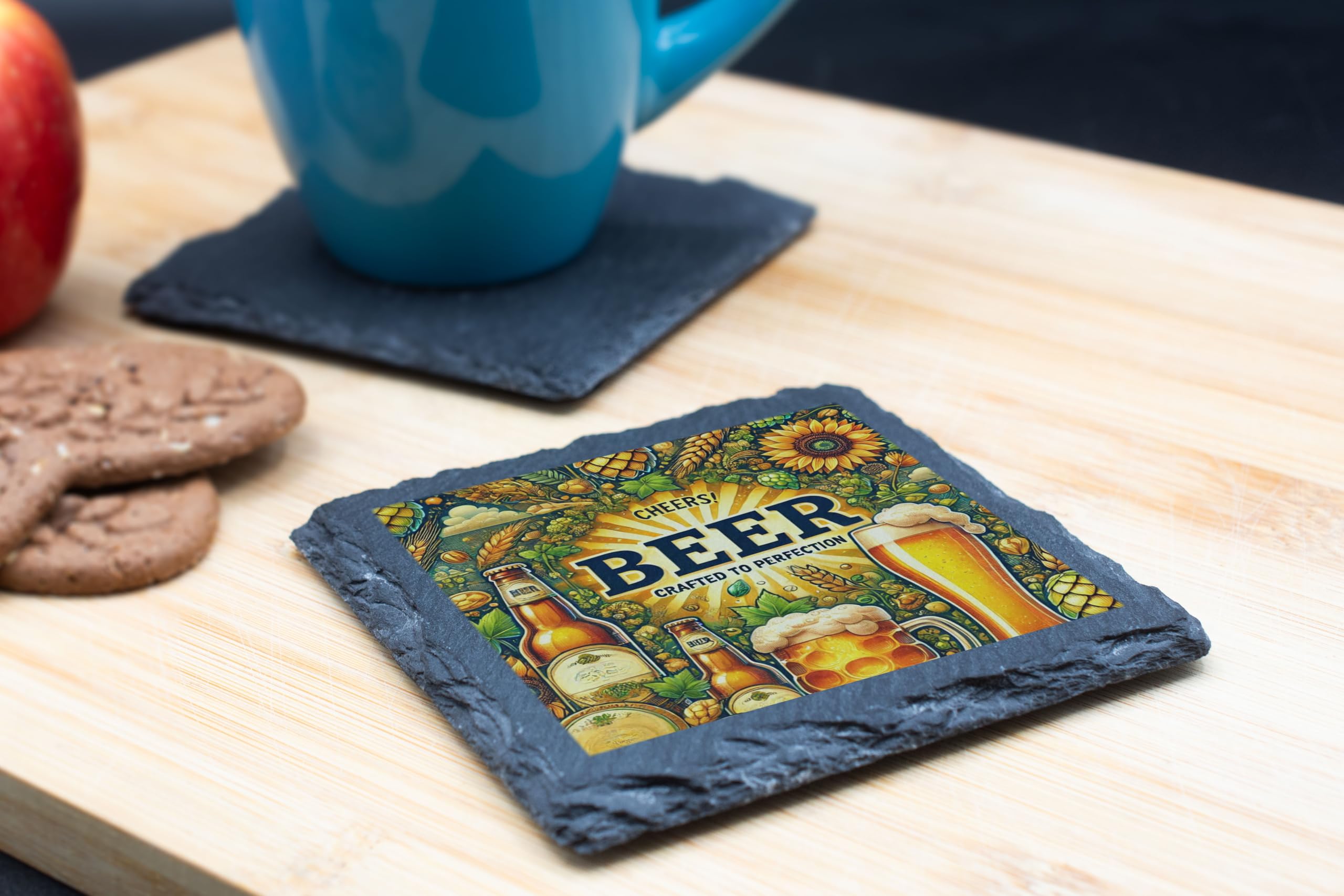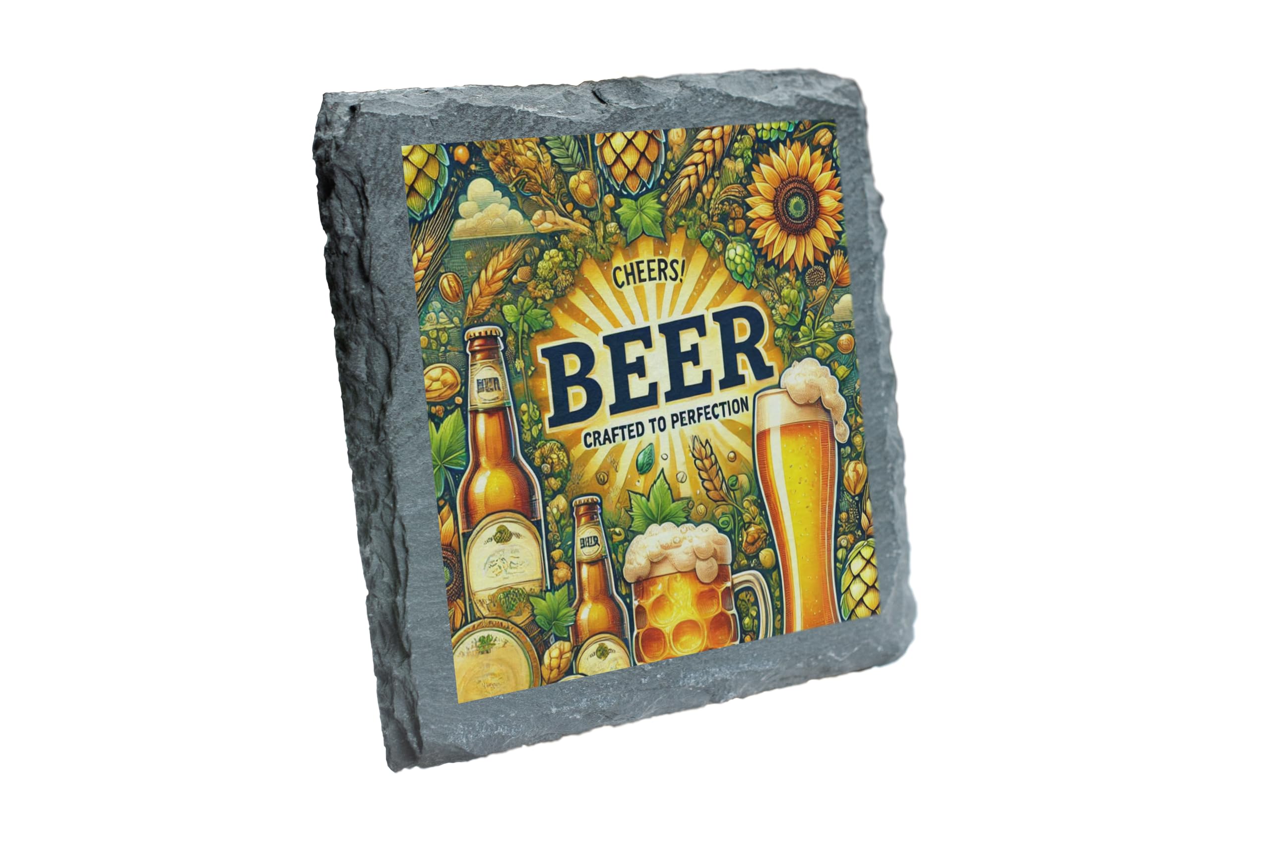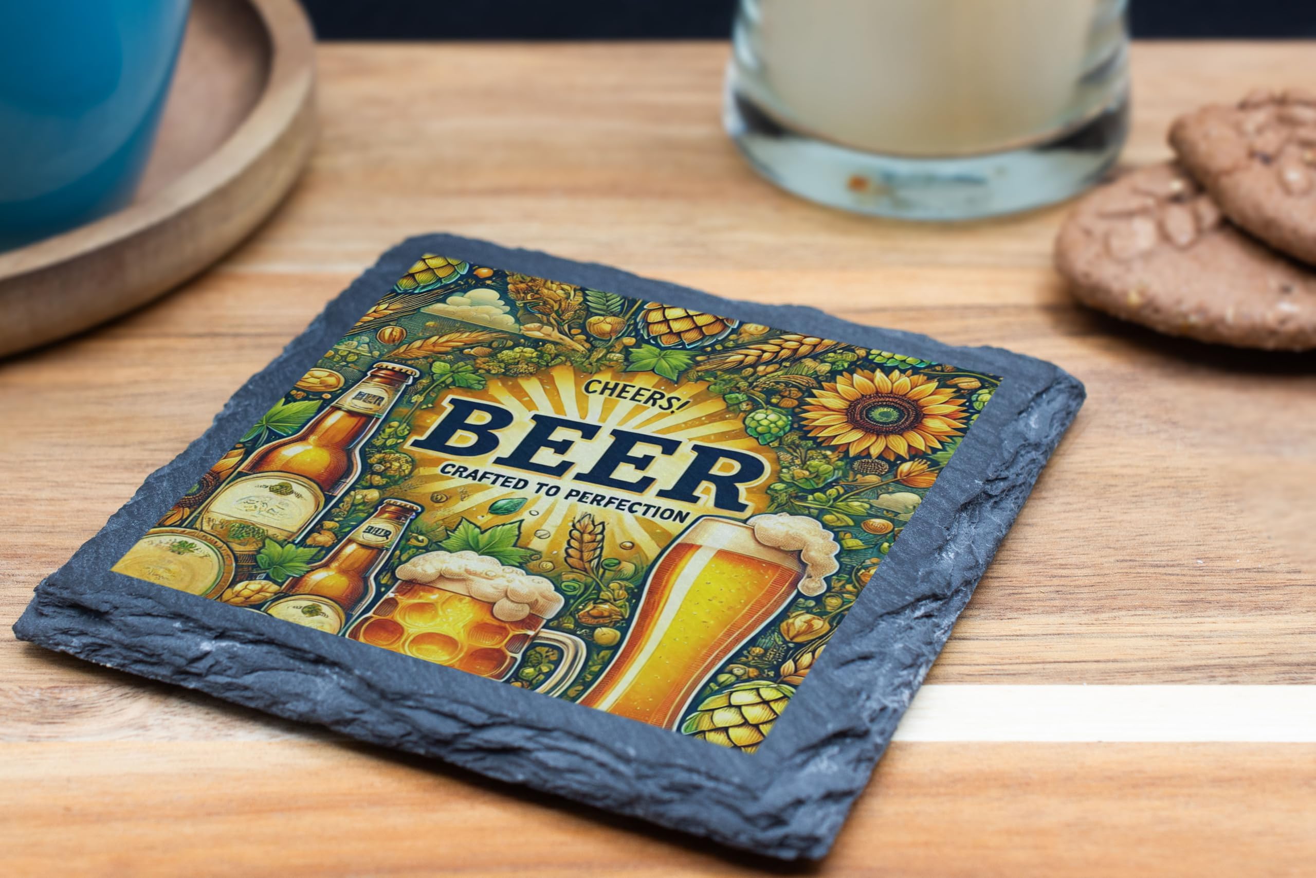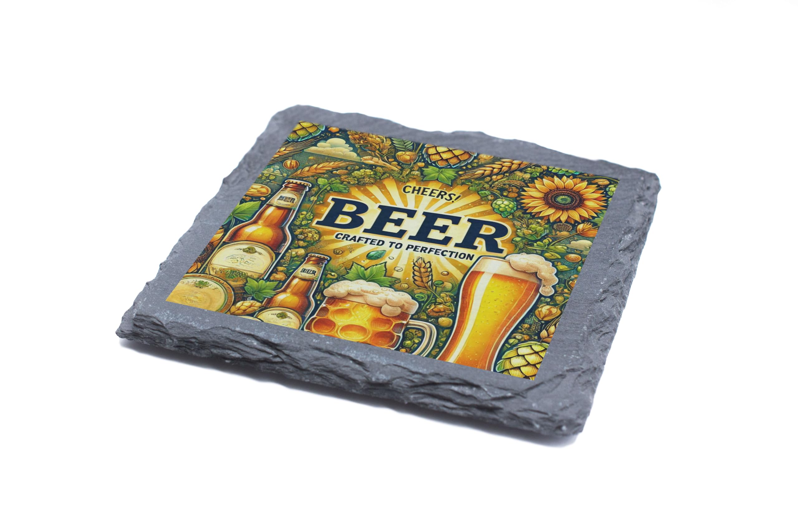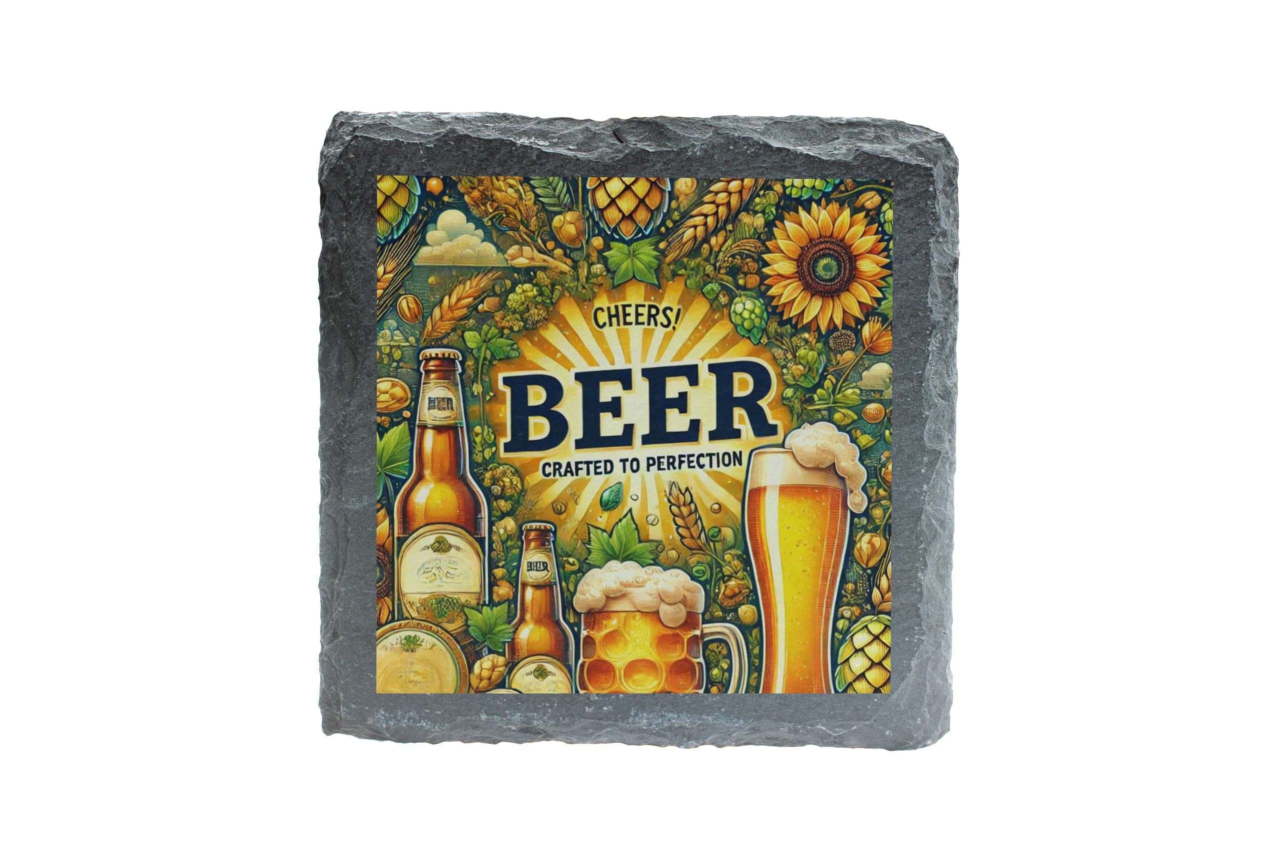Elevate your bar or kitchen setup with the "Cheers! Beer Crafted to Perfection" slate coaster. Showcasing vibrant illustrations of frothy mugs, bottles, and hops, this coaster captures the joy of a perfectly brewed beer. Made from premium, natural slate, it combines durability with a rustic aesthetic that complements any home d?cor. The coaster protects your furniture from spills and scratches while adding a charming beer-themed touch. Its non-slip base ensures stability on any surface. Whether you're treating yourself or looking for the perfect gift for the beer enthusiast in your life, this slate coaster is a great choice. Cheers to great taste and stylish living!