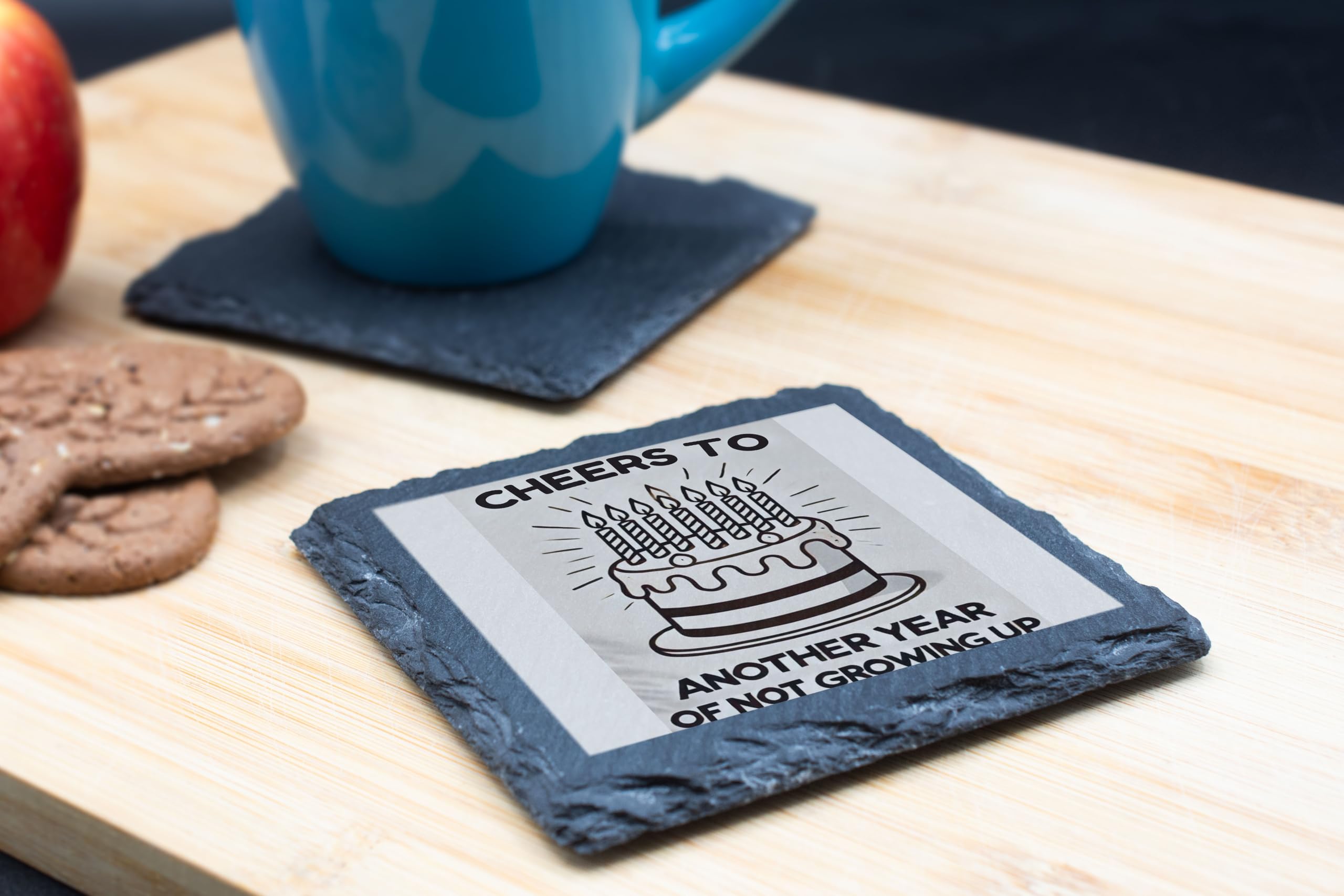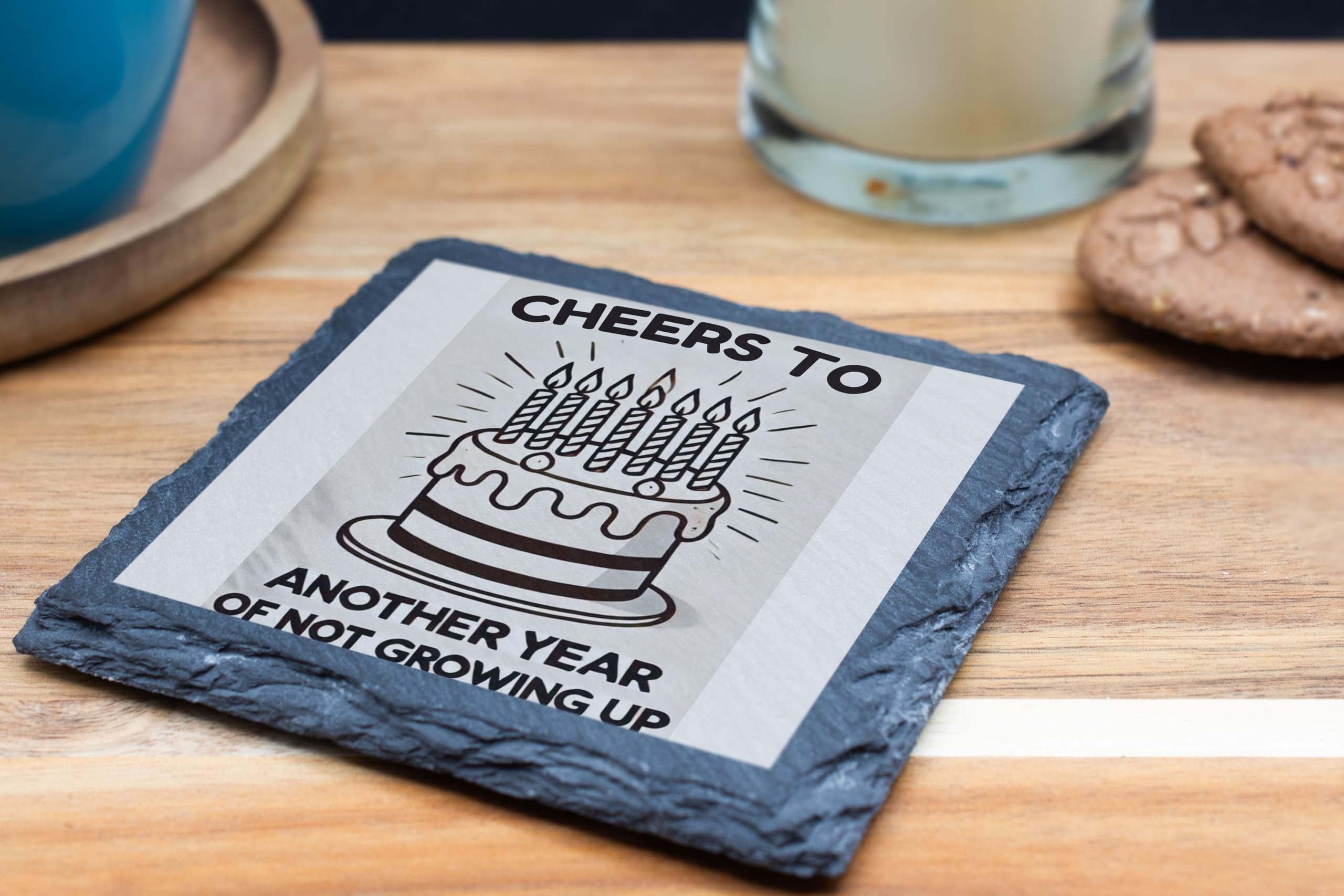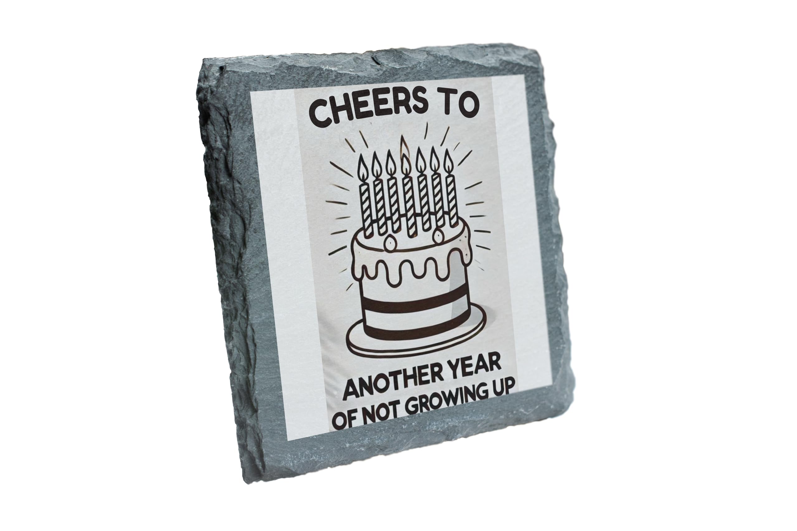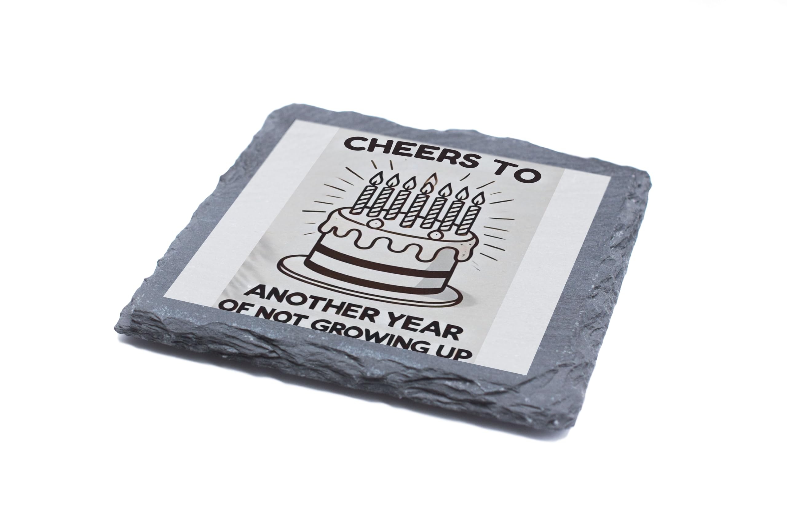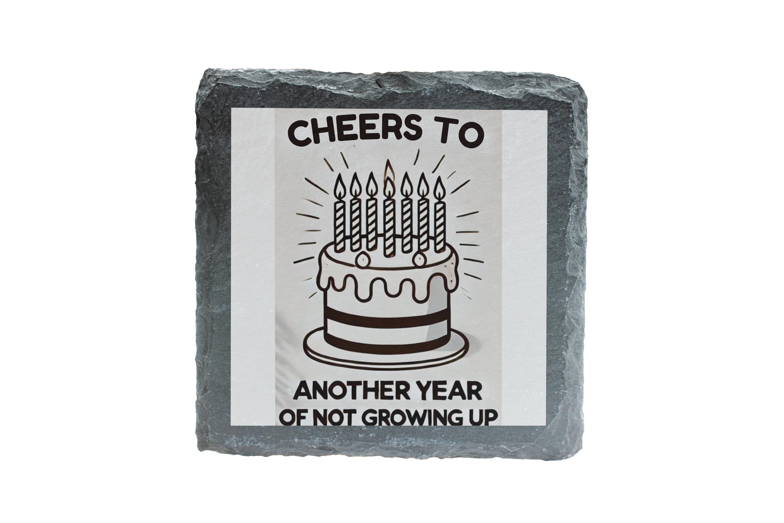 Make birthdays more memorable with this quirky "Cheers to Another Year of Not Growing Up" slate coaster. Featuring a charming cake illustration and playful typography, it?s a perfect blend of humor and practicality. Handcrafted from natural slate, this coaster is not only durable but also a stylish way to protect your furniture. Whether you?re hosting a party or looking for a unique gift, this coaster adds a fun and thoughtful touch to any birthday celebration.