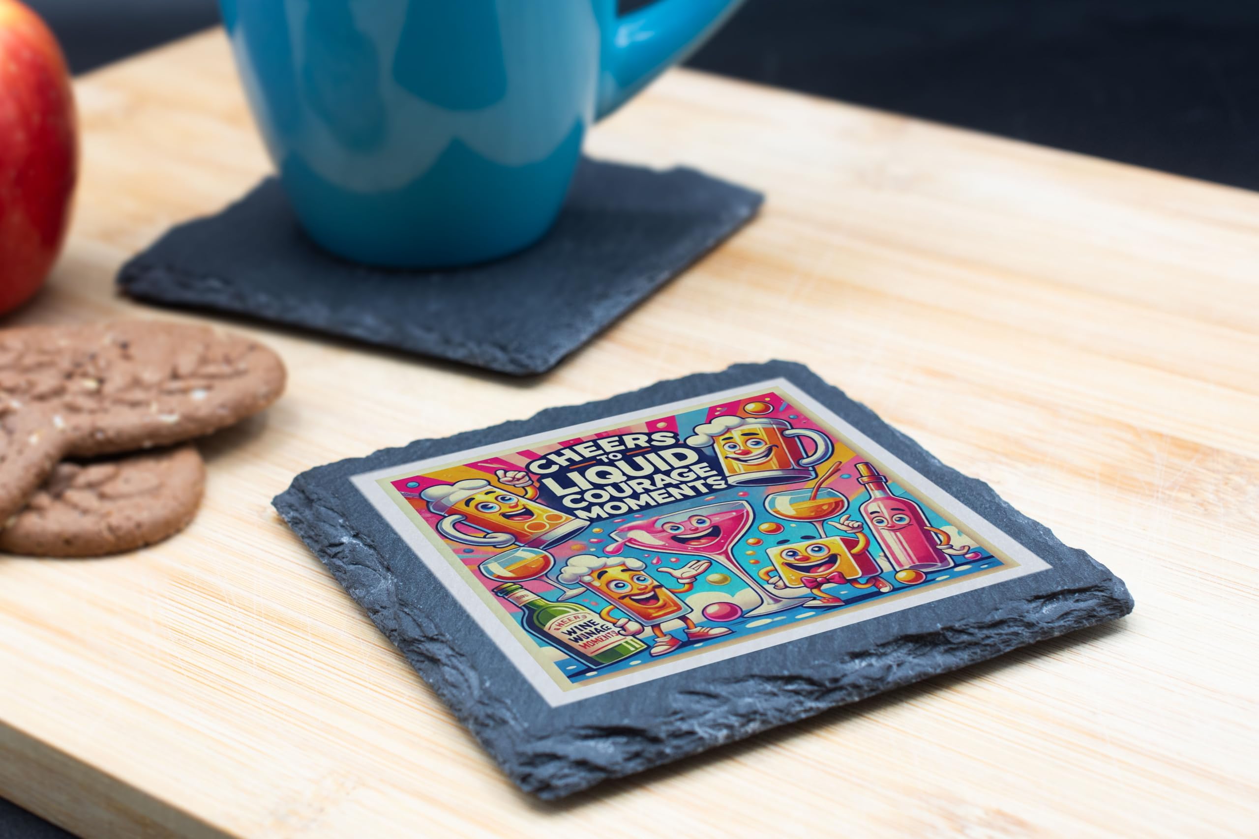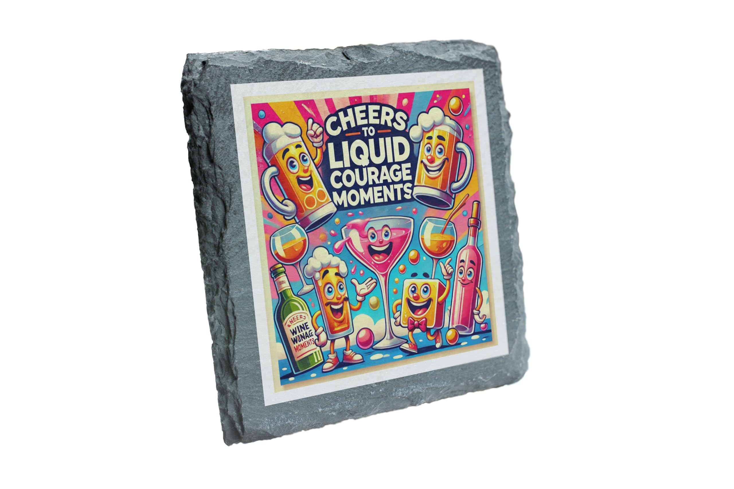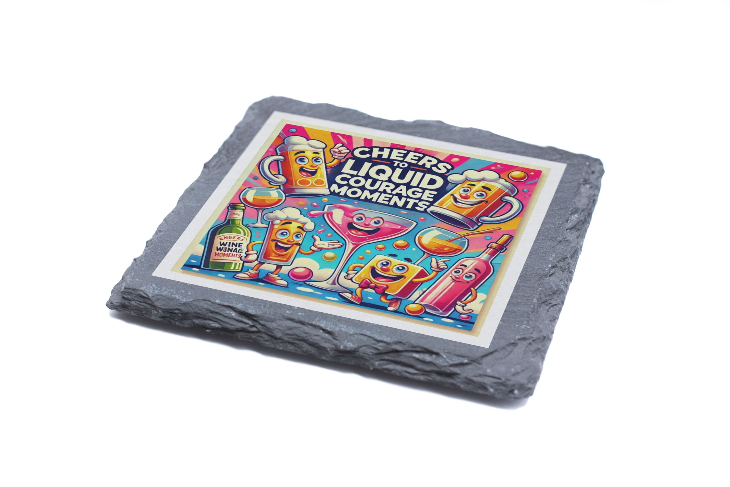 Add a splash of fun to your drinkware collection with this Cheers to Liquid Courage Moments Slate Coaster. Designed with vibrant cartoon characters and a playful theme, this coaster is perfect for those who enjoy humor and good times. Whether you're toasting to a special moment or simply enjoying your favorite drink, this quirky coaster sets the mood for a lively atmosphere. Crafted from durable natural slate, it offers both protection for your surfaces and a unique decorative appeal. Ideal for home bars, party settings, or even as a distinctive addition to your dining table. This coaster isn?t just functional?it?s a statement piece that sparks smiles and laughter. Celebrate your love for good drinks and great company with this cheerful and eye-catching coaster. It also makes for a fantastic gift for birthdays, housewarming parties, or any occasion worth raising a glass!